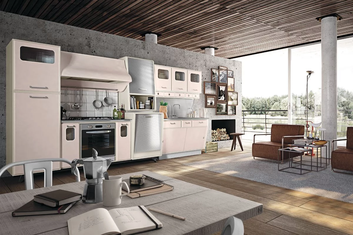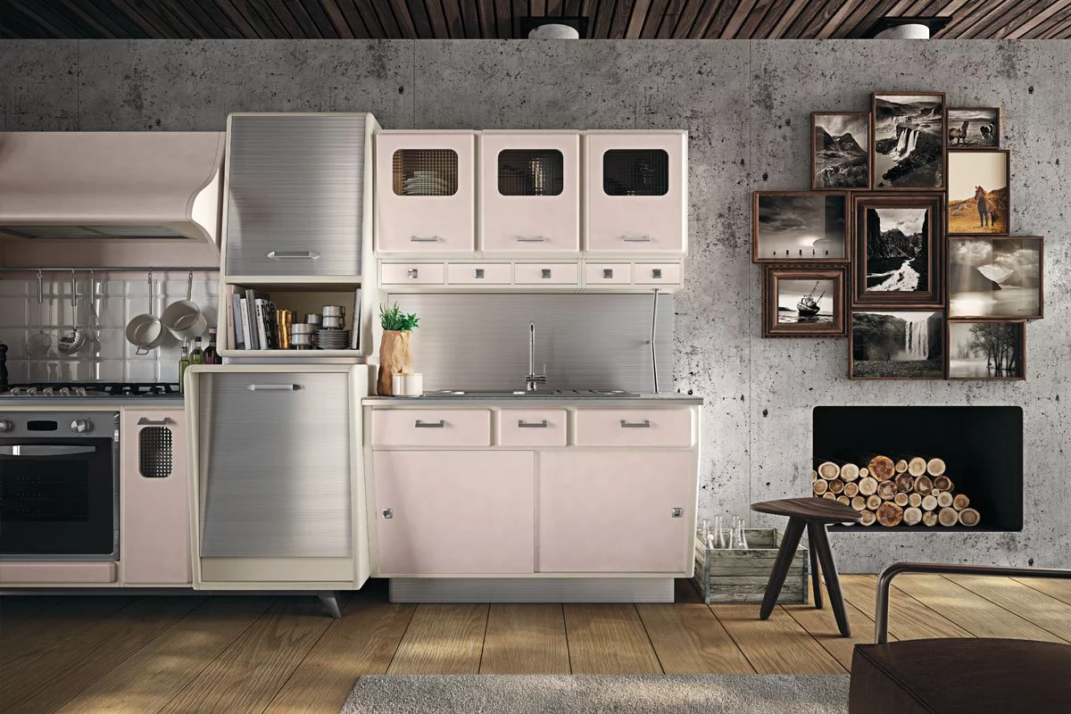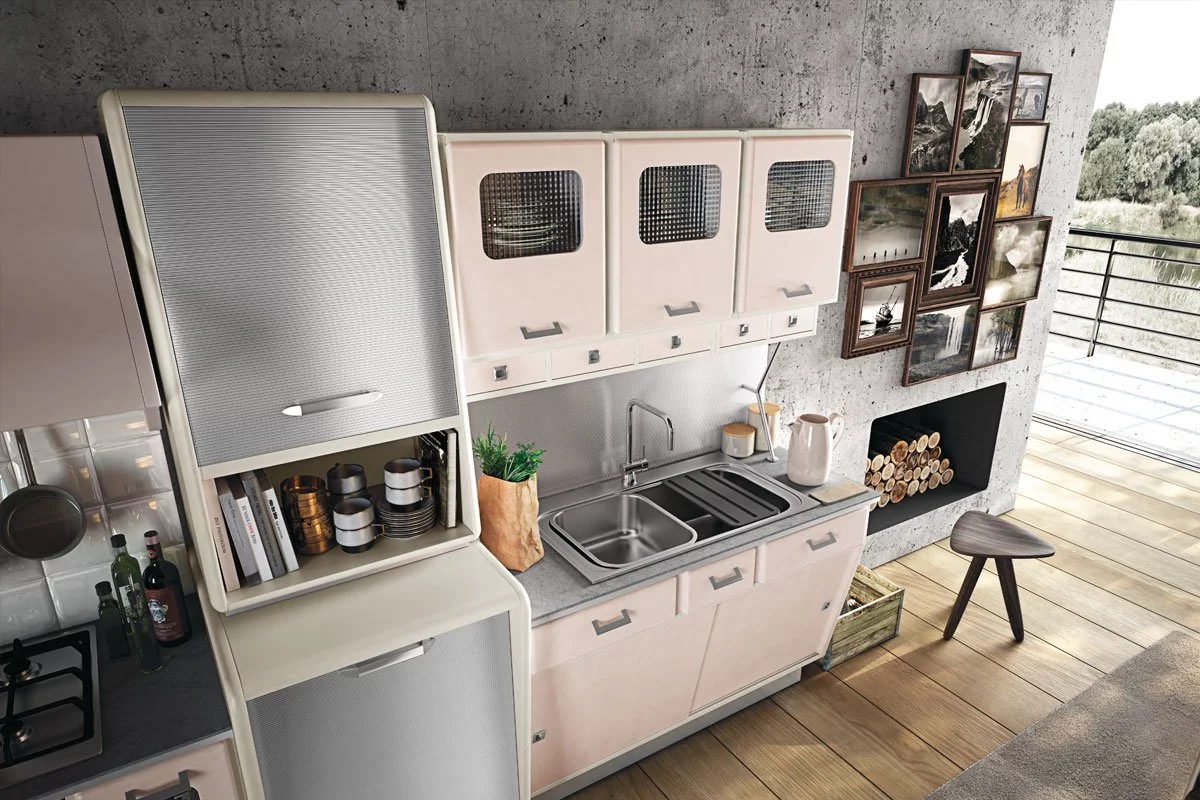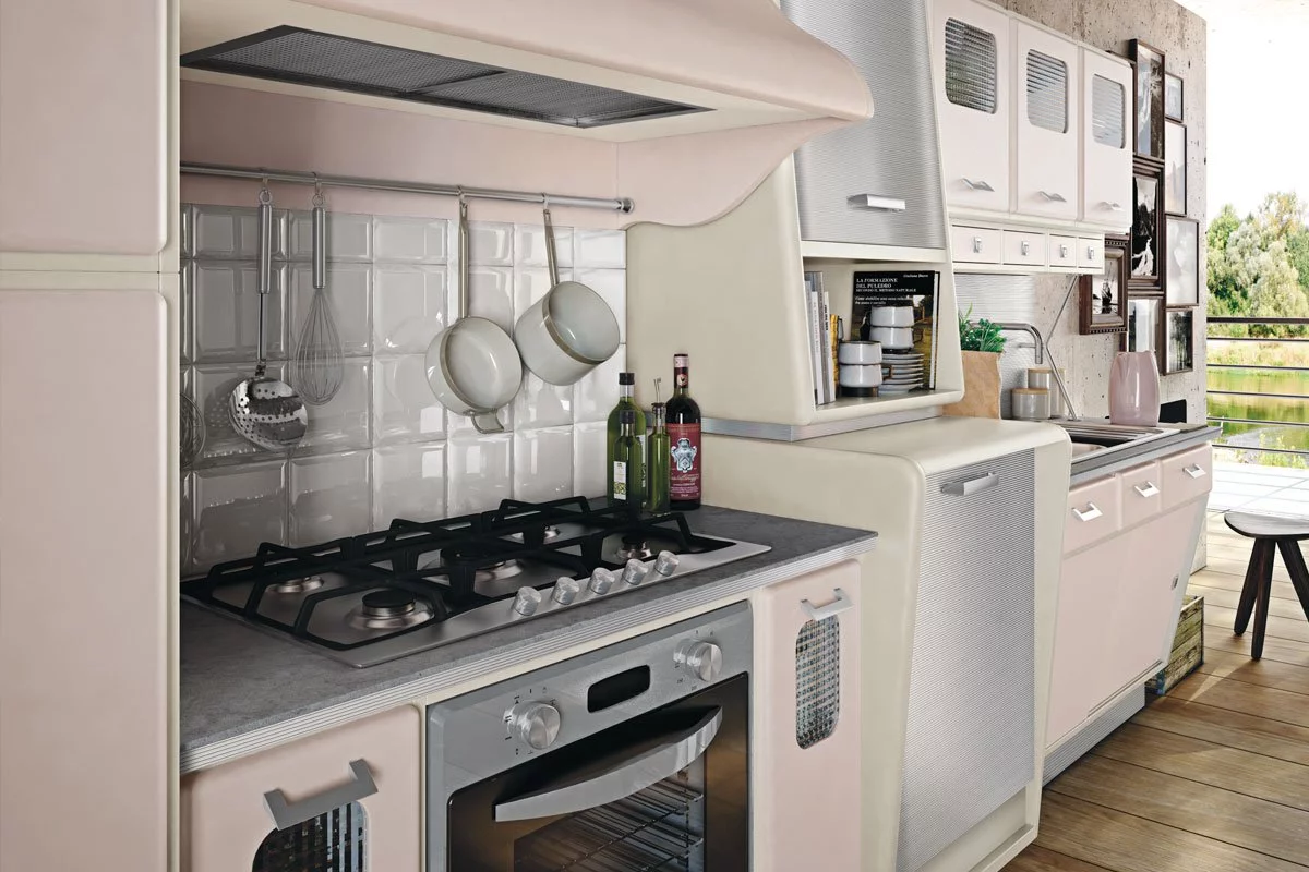 Нестандартная выразительная кухня Saint Louis, созданная фабрикой Marchi Cucine, олицетворяет комфорт и эффектность, характерные стилю 50-х годов. Особенность образу придают закруглённые углы и необычные геометрические формы фасадов.