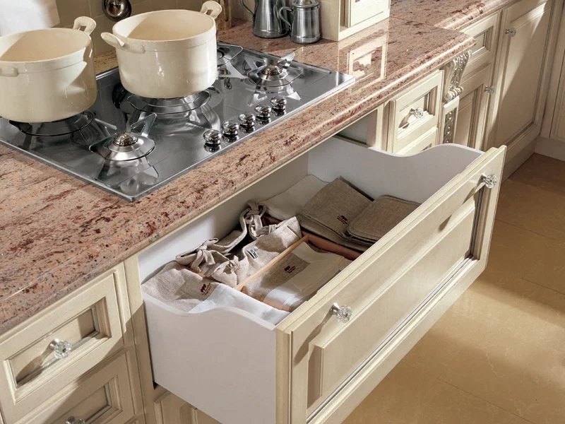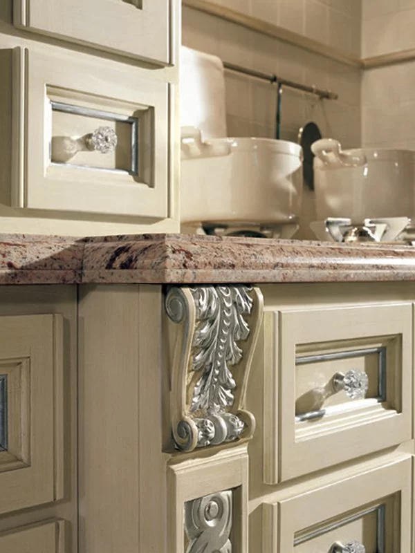 Гармоничное сочетание форм и декоративных элементов придают шарм и элегантность каждому изделию Martini. Изысканные цветовые комбинации, насыщенные тона и детали в золотой и серебряной фольге обогащают пространство и создают неповторимую атмосферу. Модильоны, пилястры и другие резные декоры, выполненные вручную опытными мастерами, подчеркивают ценность каждого изделия.fallbacklang:TOSCA - Fitted kitchen.