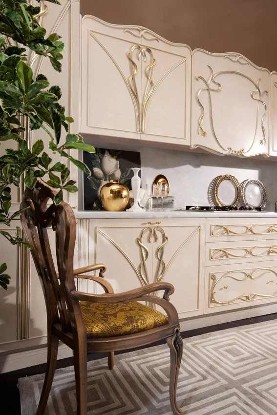 Модель выполнена в белом цвете и украшена причудливым орнаментом. Это придает кухне утончённость, изысканность и оригинальность. Мебель превосходна по своему качеству: для её изготовления используются массивы натуральных пород дерева. Они не теряют своих свойств, не оказывают негативного влияния на здоровье и экологию, а также прослужат долгое время. Все поверхности гладко отполированы, окрашены и покрыты лаком. Декор посеребрён, что акцентирует внимание на красоте элементов. Более подробную информацию вы можете узнать у наших специалистов.