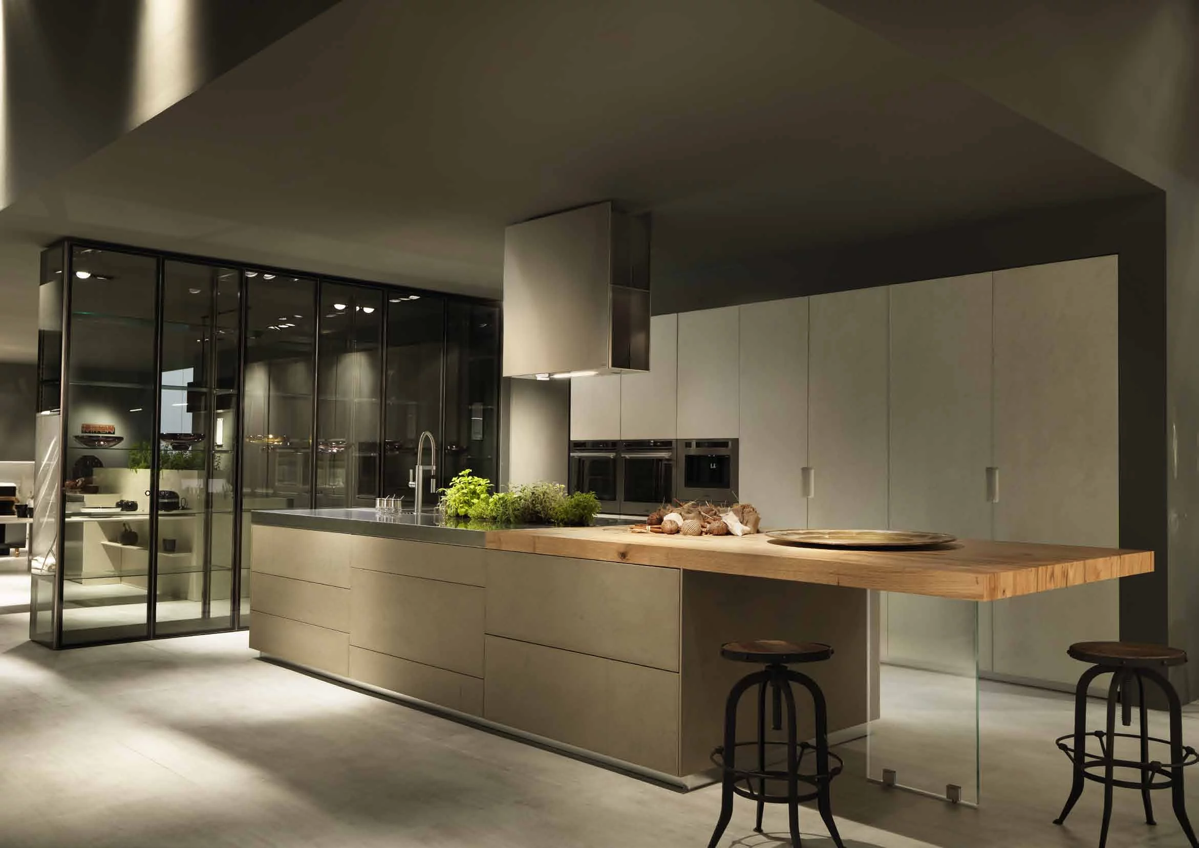 Минималистическая кухня Limha Cemento от известного производителя Miton Cucine представлена в варианте со скрытыми ручками. Выполненная в тёплом оттенке, она отлично гармонирует с удлинённой столешницей острова из натурального массива. Последняя базируется на основании в виде стеклянного прямоугольника.