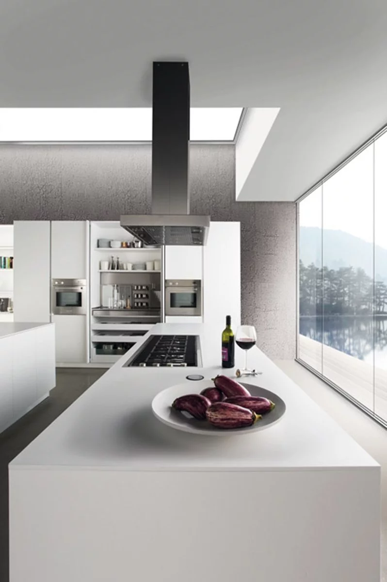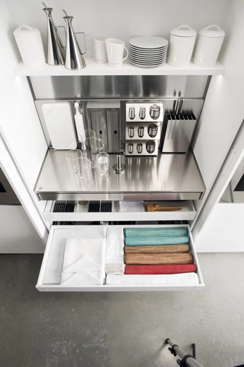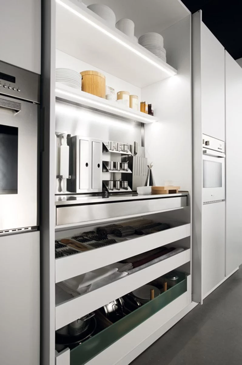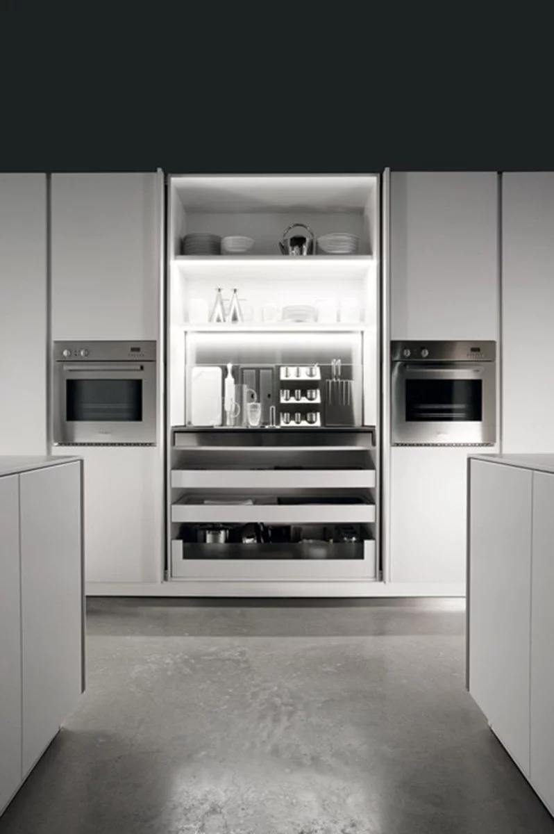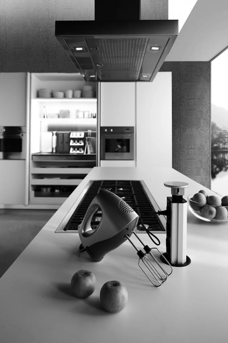 Создавая модель Sinhro Matt, итальянская компания Miton Cucine осталась верна своему кредо: минимализм и функциональность во всем. Каждый элемент модуля доведен дизайнерами до совершенства. За дверцами конструкции гораздо больше рабочих поверхностей, чем это кажется на первый взгляд. Встроенные световые индикаторы позволяют экономить электроэнергию и регулировать интенсивность освещения. Выдвижная столешница и стеновая панель выполнены из нержавеющей стали Essetre. Здесь вы не найдете обычных ручек, они встроены в поверхность дверок. Только чистые, правильные линии, ничего лишнего!