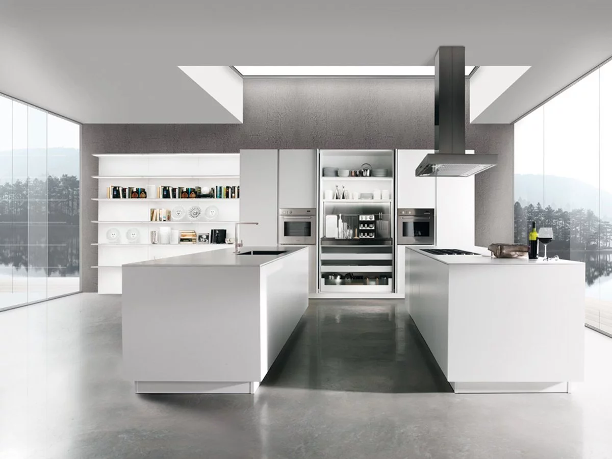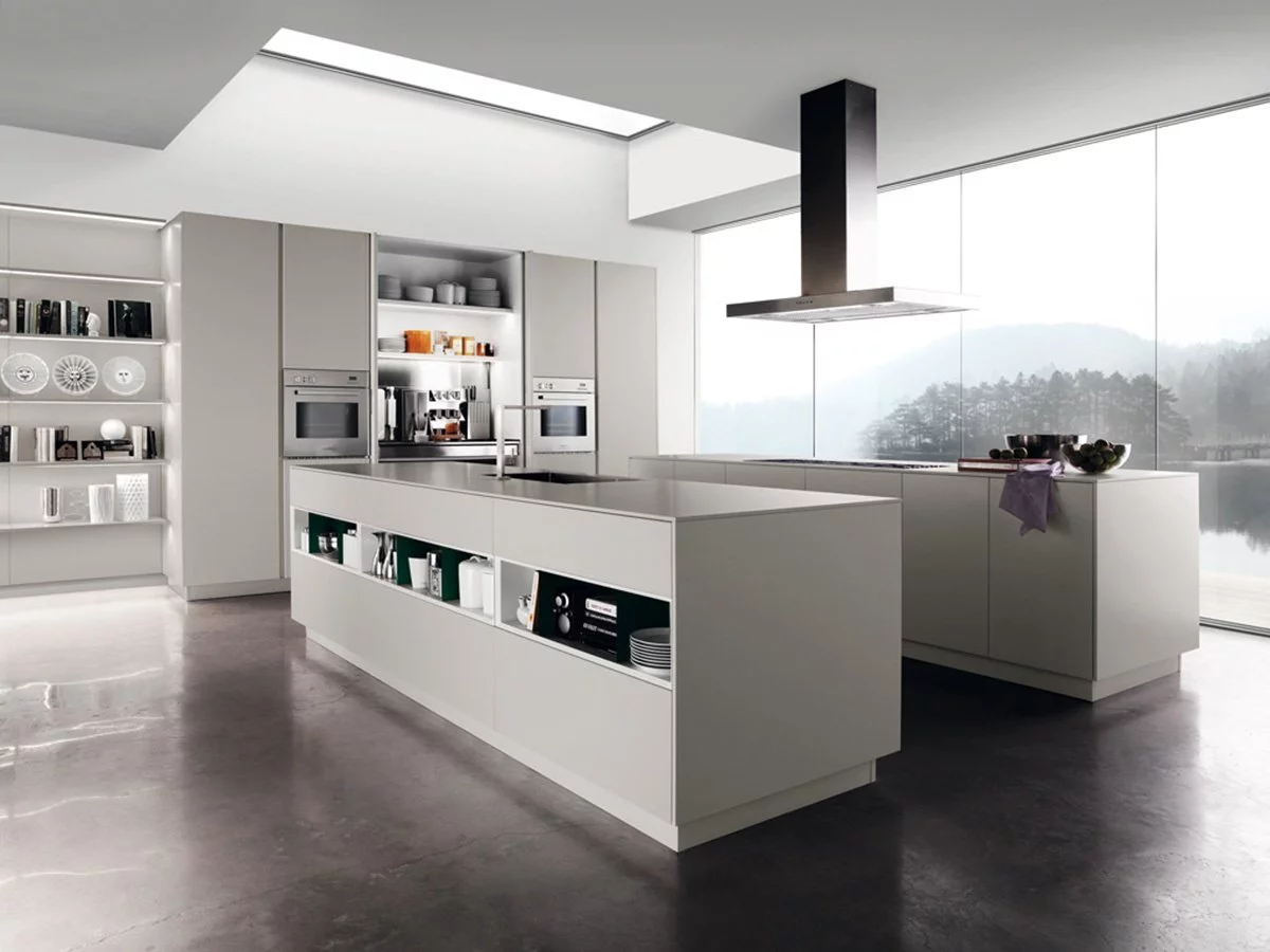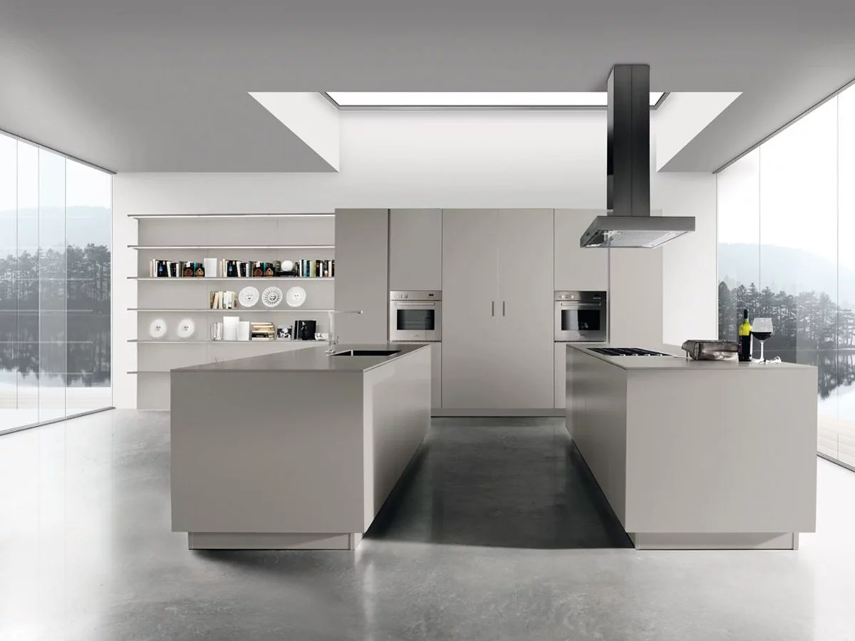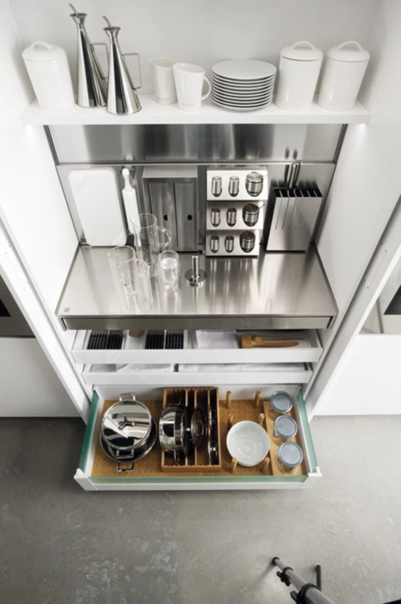 Создавая модель Sinhro Matt, итальянская компания Miton Cucine осталась верна своему кредо: минимализм и функциональность во всем. Каждый элемент модуля доведен дизайнерами до совершенства. За дверцами конструкции гораздо больше рабочих поверхностей, чем это кажется на первый взгляд. Встроенные световые индикаторы позволяют экономить электроэнергию и регулировать интенсивность освещения. Выдвижная столешница и стеновая панель выполнены из нержавеющей стали Essetre. Здесь вы не найдете обычных ручек, они встроены в поверхность дверок. Только чистые, правильные линии, ничего лишнего!