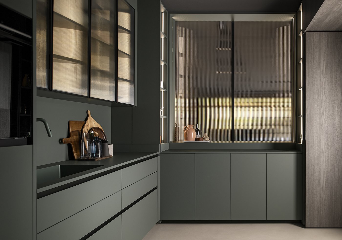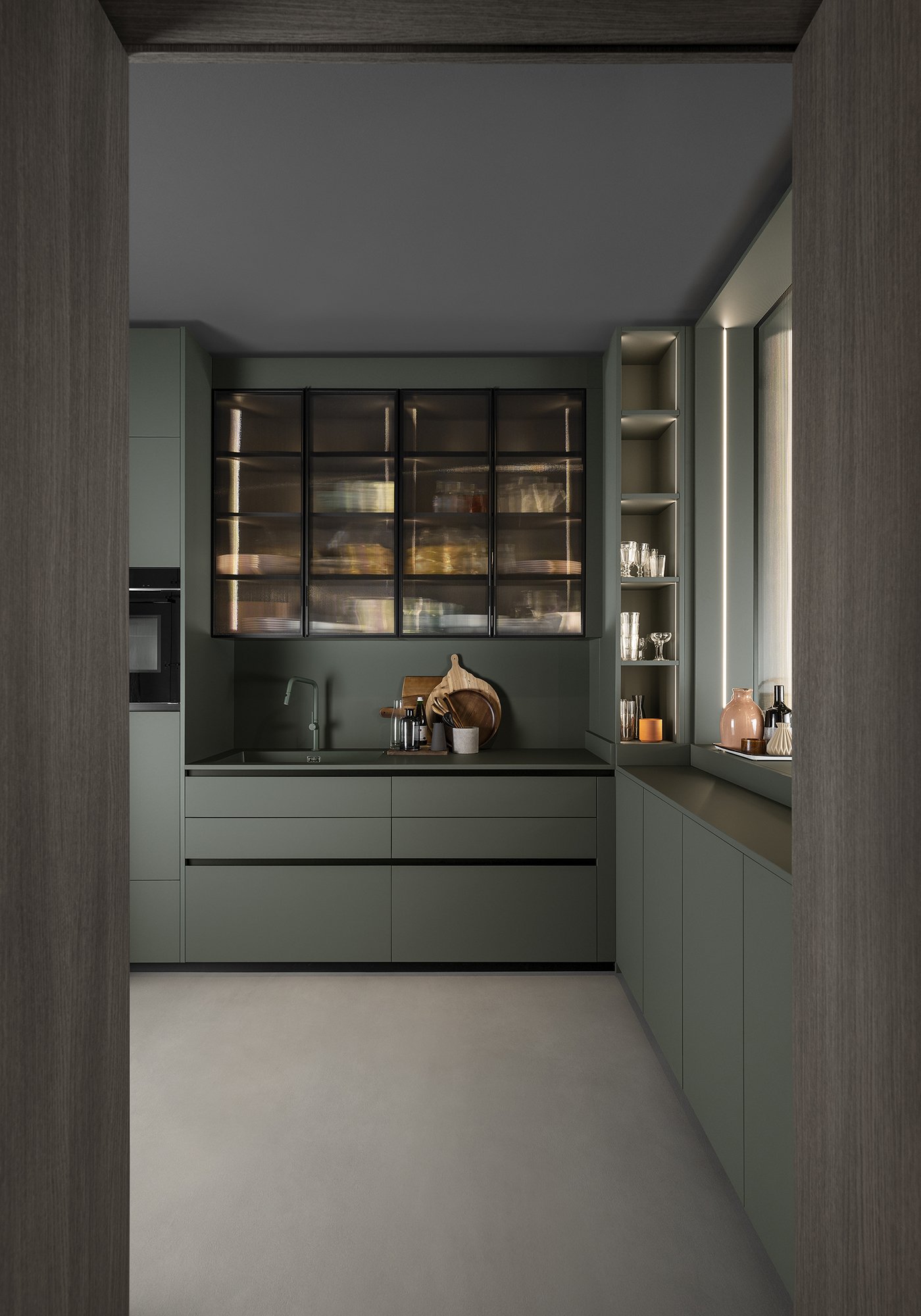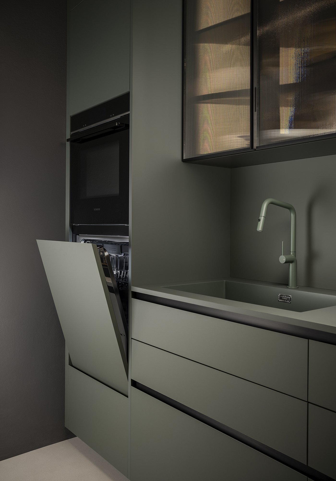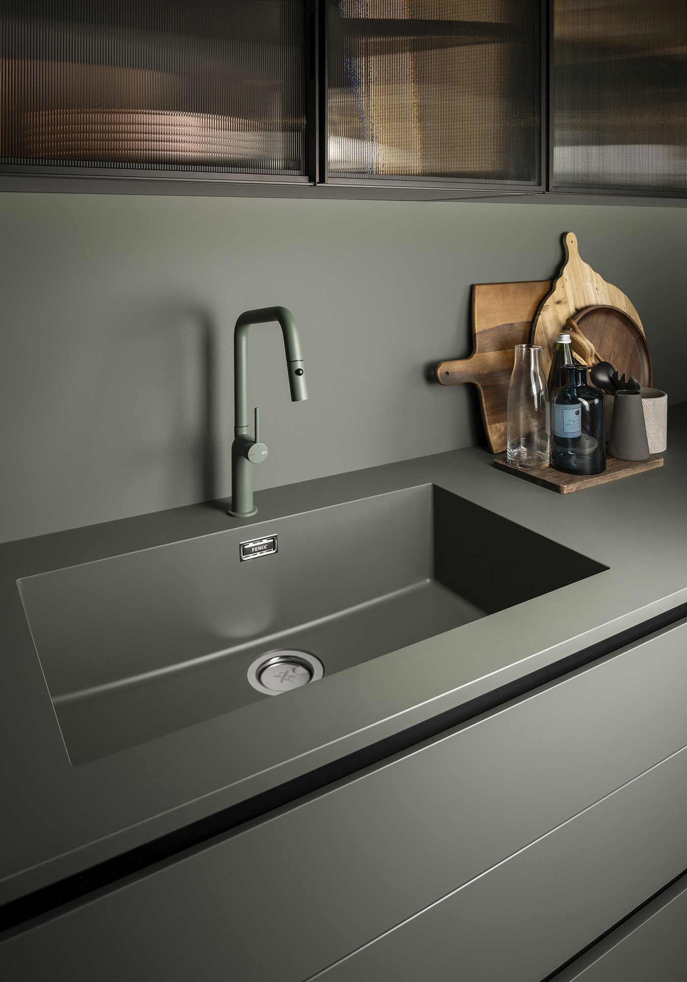 Цветовое решение в оттенке глубокого зелёного Fenix формирует спокойную и благородную атмосферу. Матовая поверхность поглощает свет, создавая мягкое, бархатистое восприятие и подчёркивая архитектурную строгость линий. Единая цветовая концепция, включая интегрированную мойку, делает пространство цельным и визуально чистым.