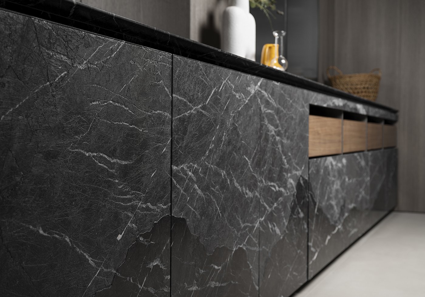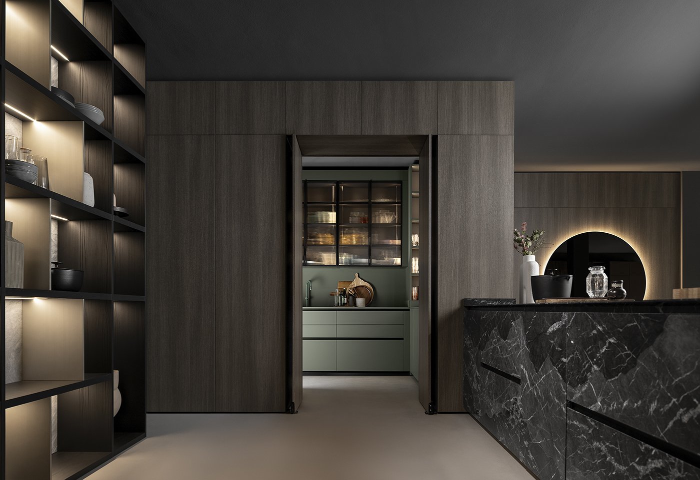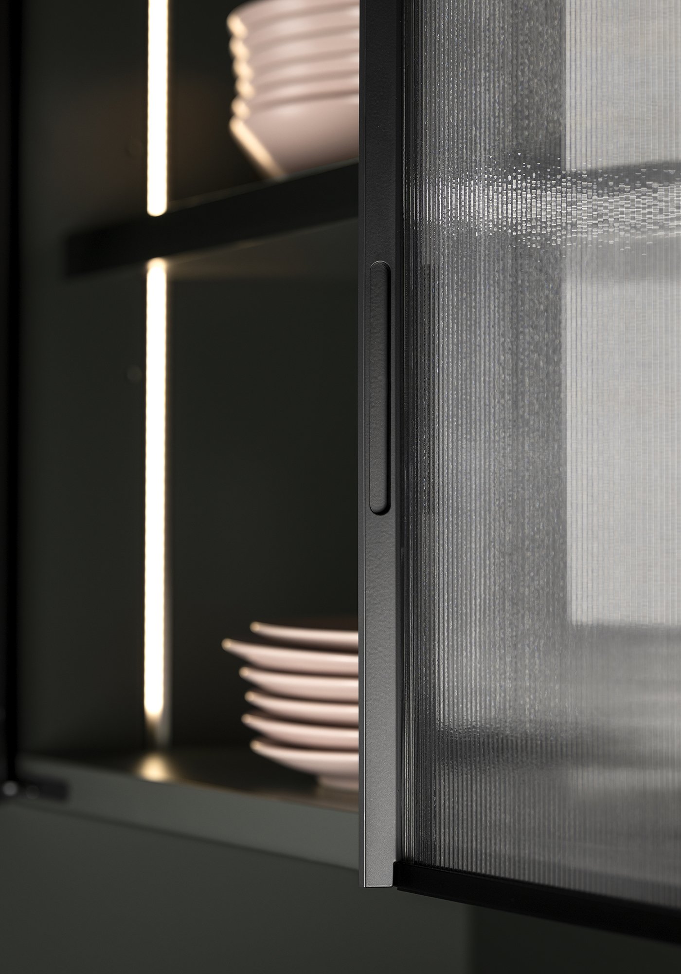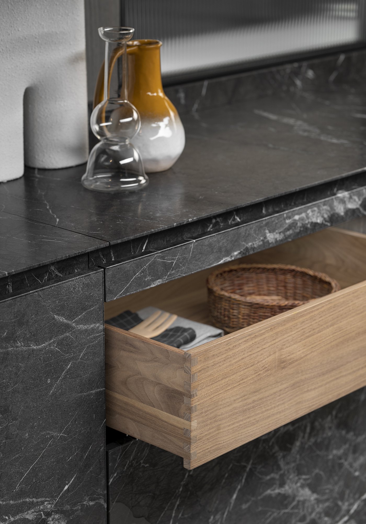 Цветовое решение в оттенке глубокого зелёного Fenix формирует спокойную и благородную атмосферу. Матовая поверхность поглощает свет, создавая мягкое, бархатистое восприятие и подчёркивая архитектурную строгость линий. Единая цветовая концепция, включая интегрированную мойку, делает пространство цельным и визуально чистым.