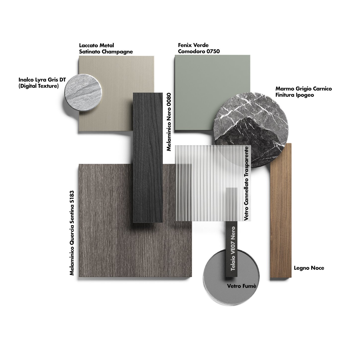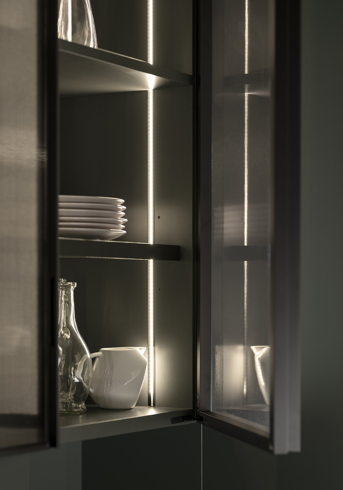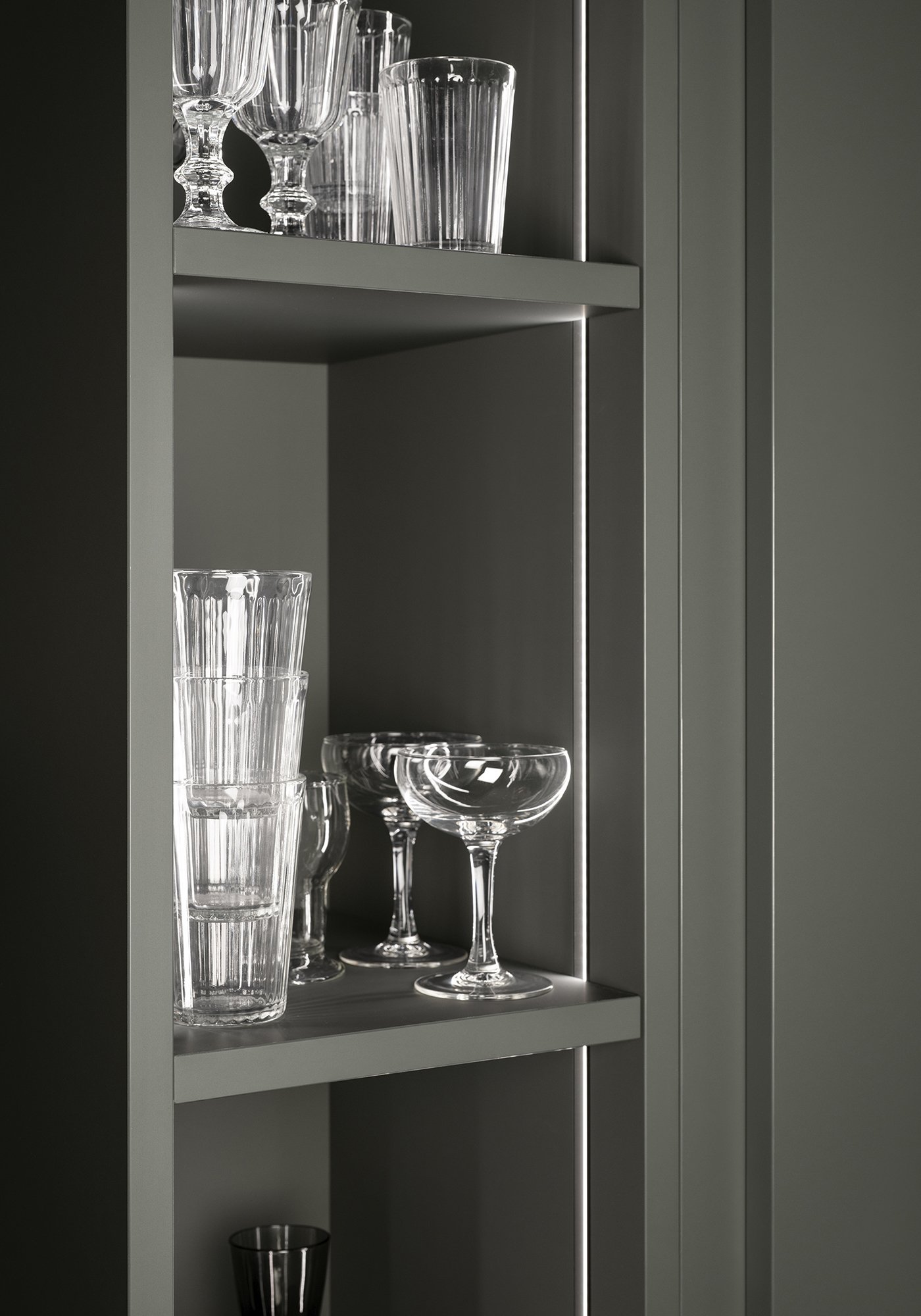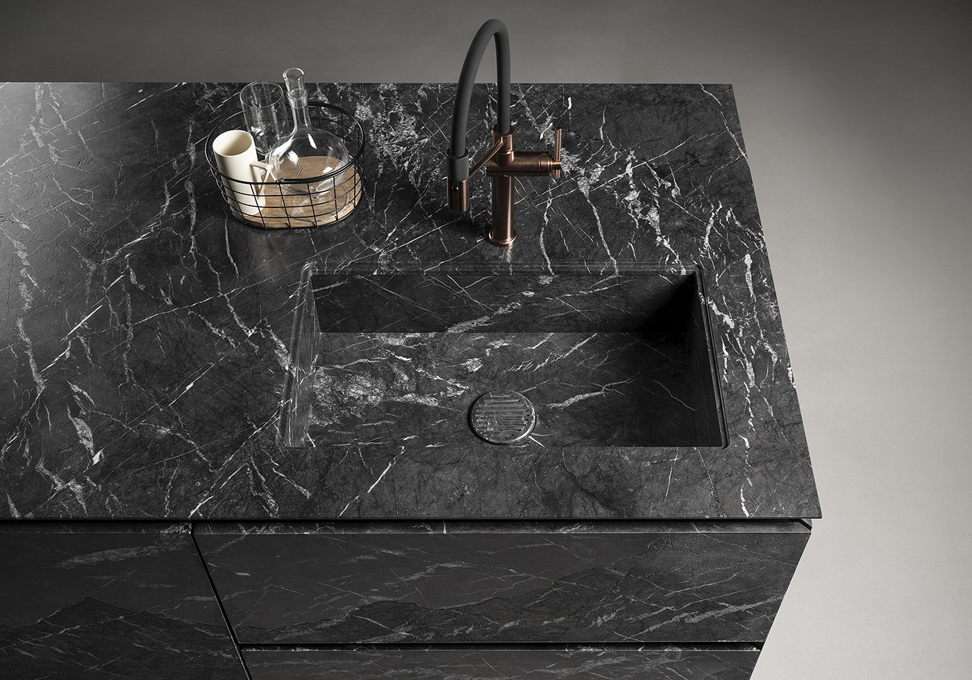 Цветовое решение в оттенке глубокого зелёного Fenix формирует спокойную и благородную атмосферу. Матовая поверхность поглощает свет, создавая мягкое, бархатистое восприятие и подчёркивая архитектурную строгость линий. Единая цветовая концепция, включая интегрированную мойку, делает пространство цельным и визуально чистым.