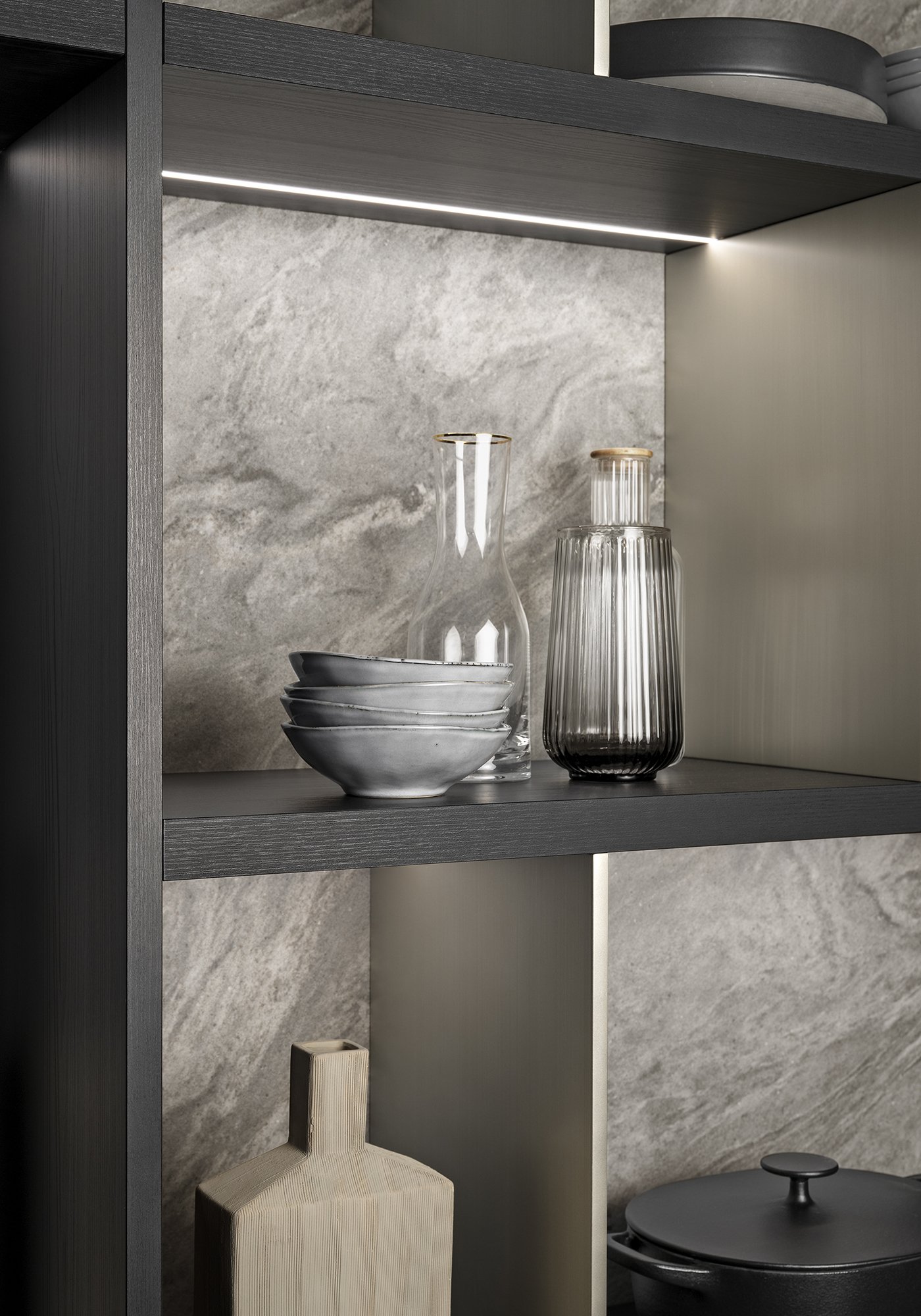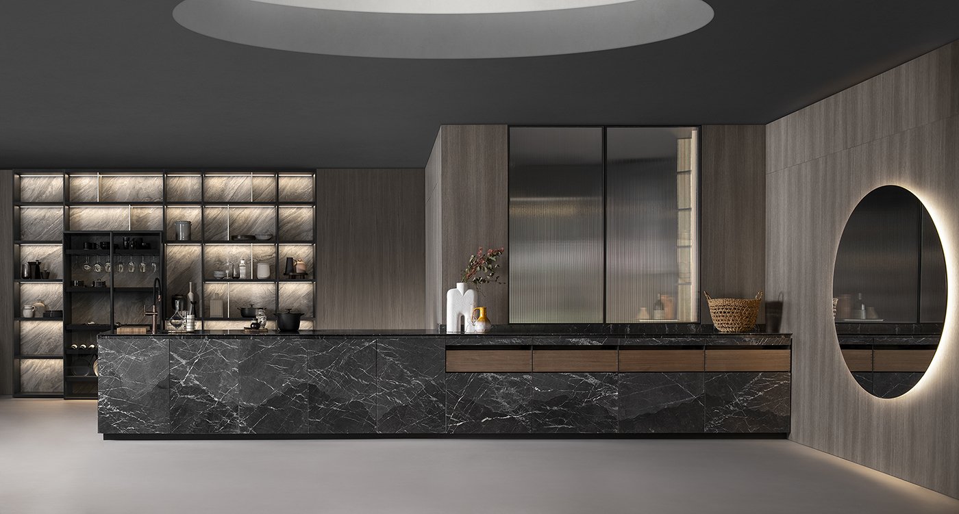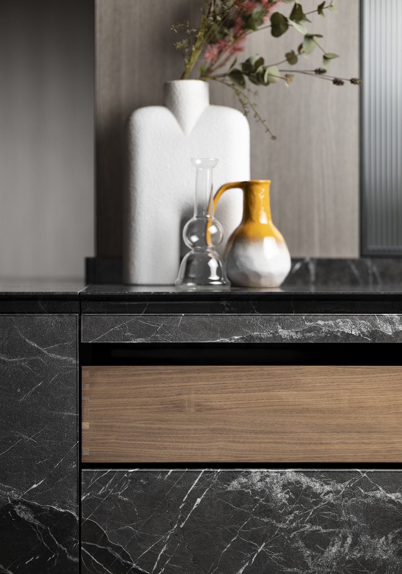Детали подчеркивают премиальный уровень кухни: натуральное дерево, сложные столярные соединения, продуманная геометрия и сочетание материалов создают ощущение индивидуального, почти ювелирного подхода. Контраст между тёмными поверхностями, камнем, стеклом и металлом делает интерьер динамичным и многогранным.