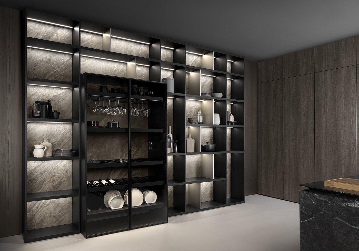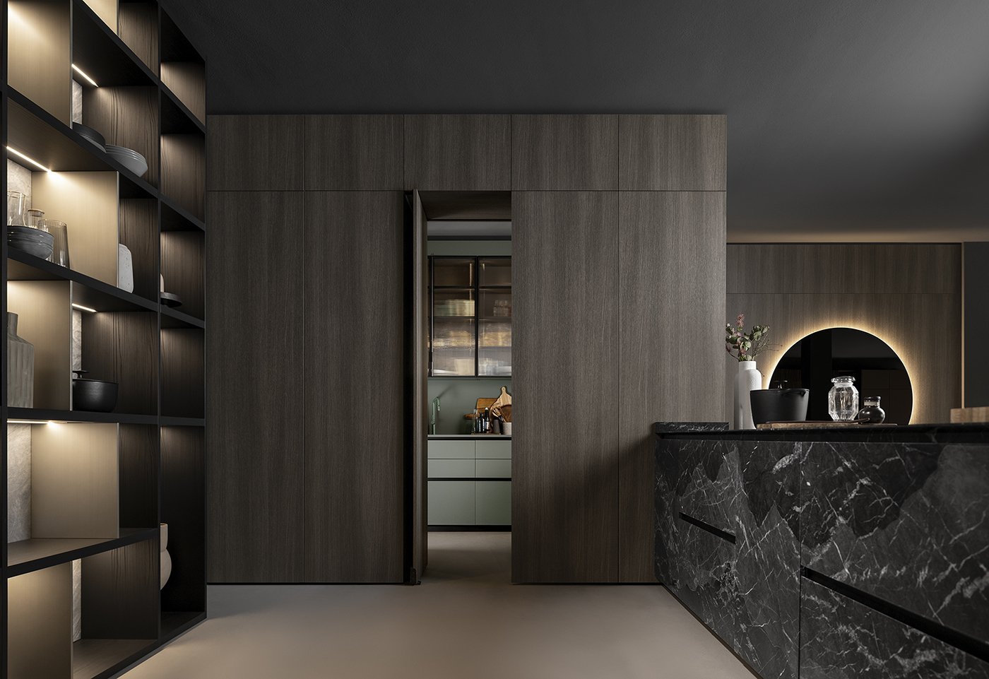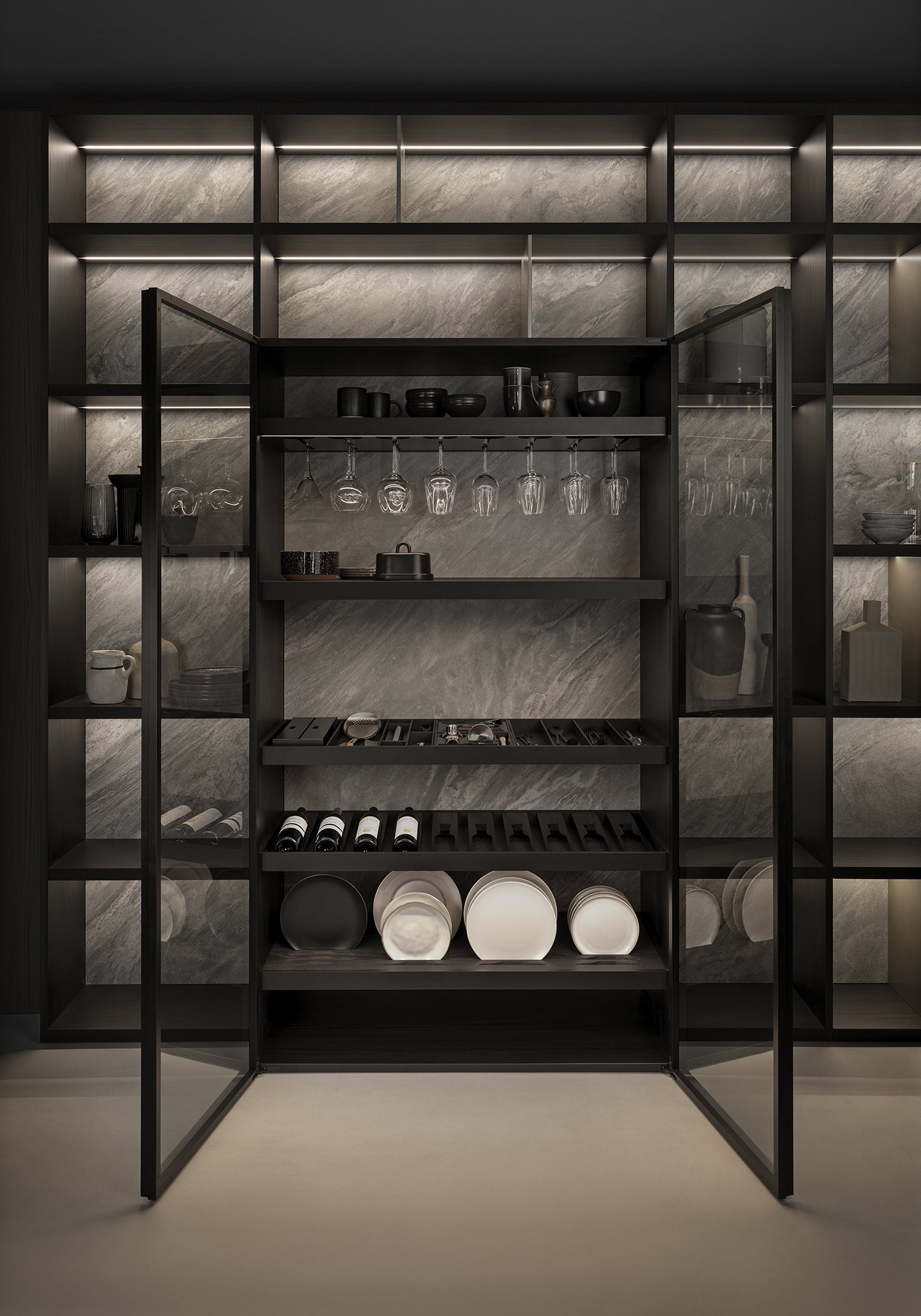 Детали подчеркивают премиальный уровень кухни: натуральное дерево, сложные столярные соединения, продуманная геометрия и сочетание материалов создают ощущение индивидуального, почти ювелирного подхода. Контраст между тёмными поверхностями, камнем, стеклом и металлом делает интерьер динамичным и многогранным.