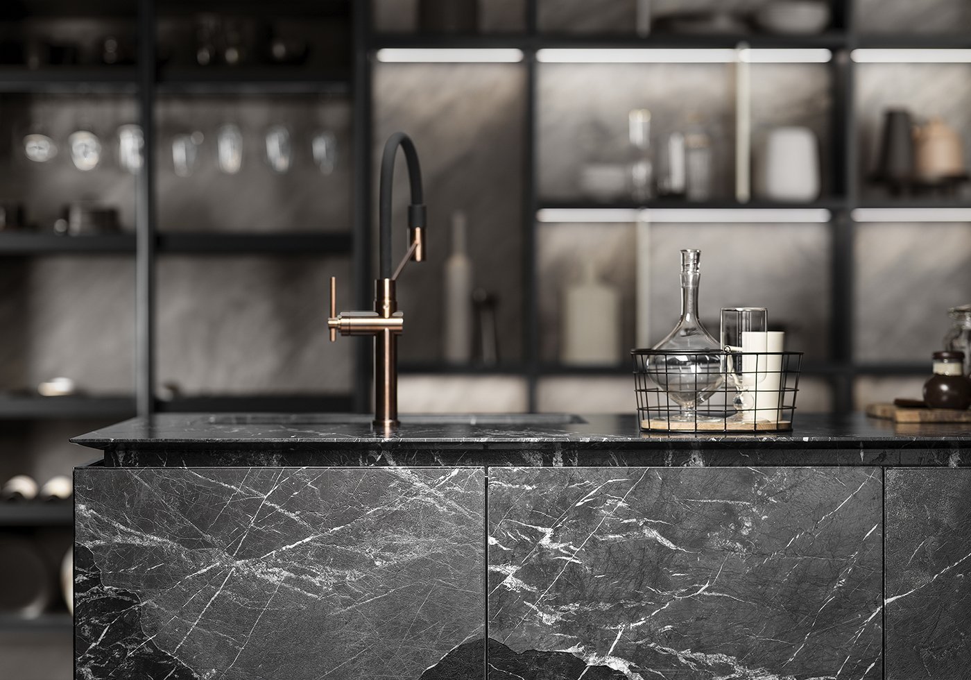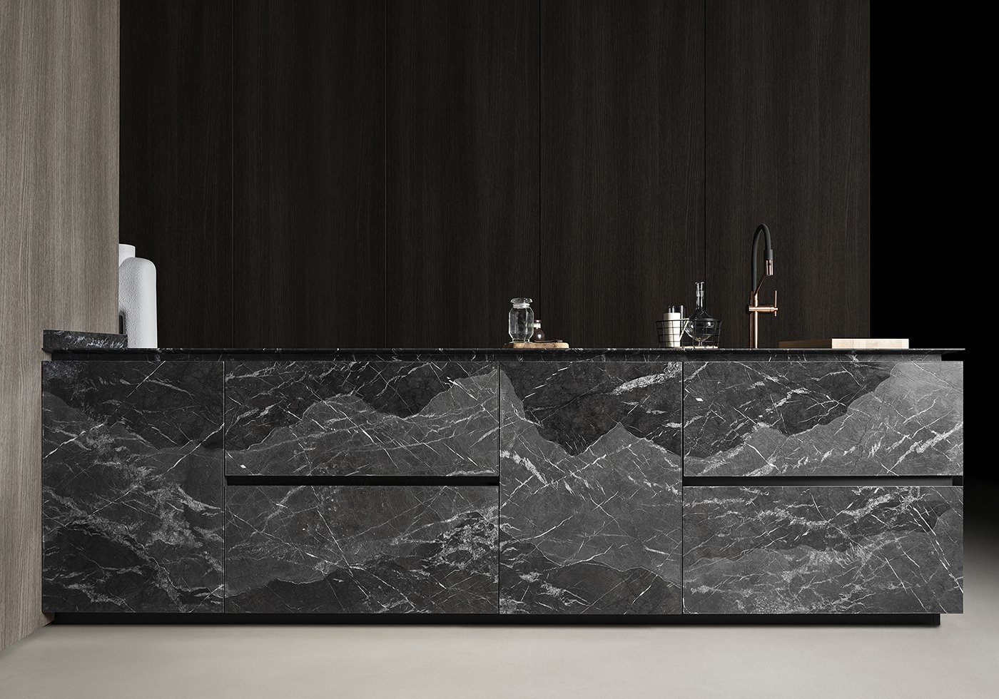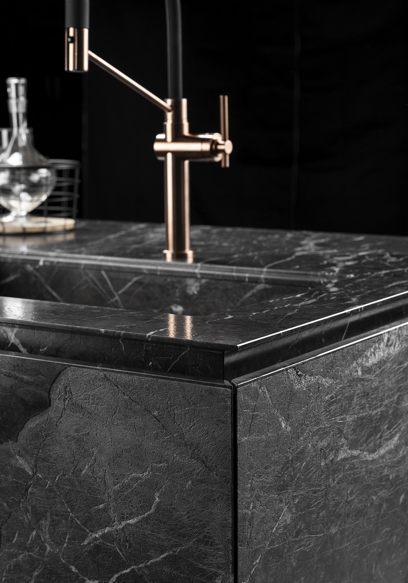 Центральный мраморный элемент выступает как арт-объект - мощный, монолитный и выразительный. Он задаёт характер всей кухне, объединяя эстетику и функциональность. Благодаря точной обработке и продуманной геометрии создаётся ощущение цельной скульптуры, в которой каждая линия имеет значение.