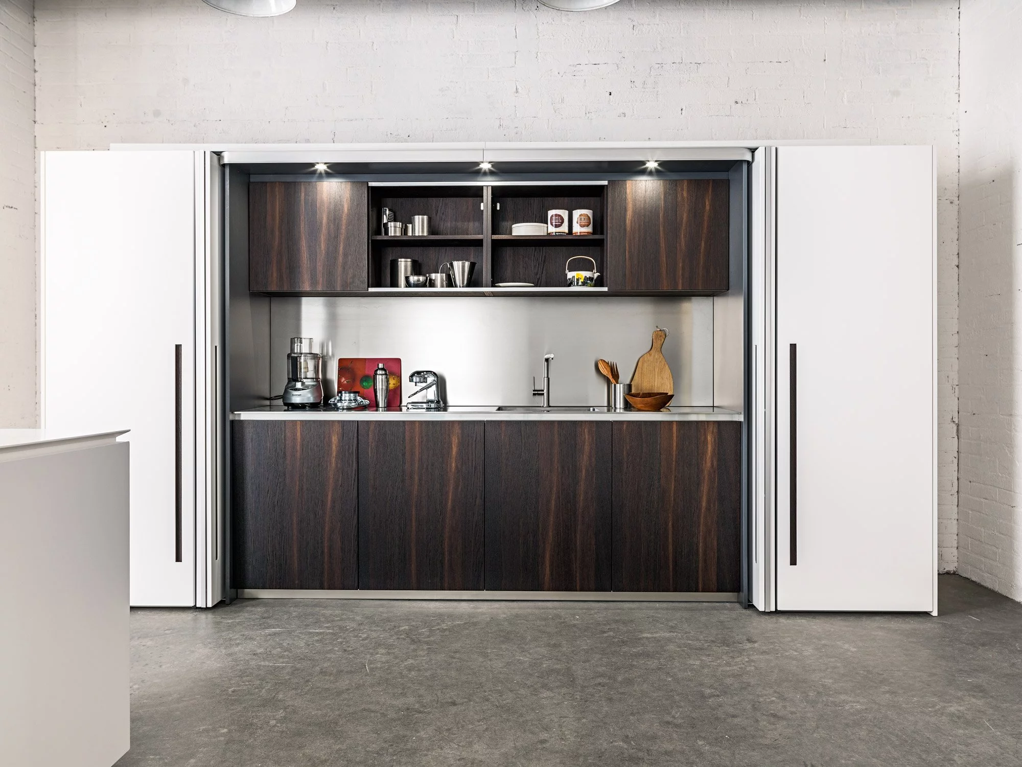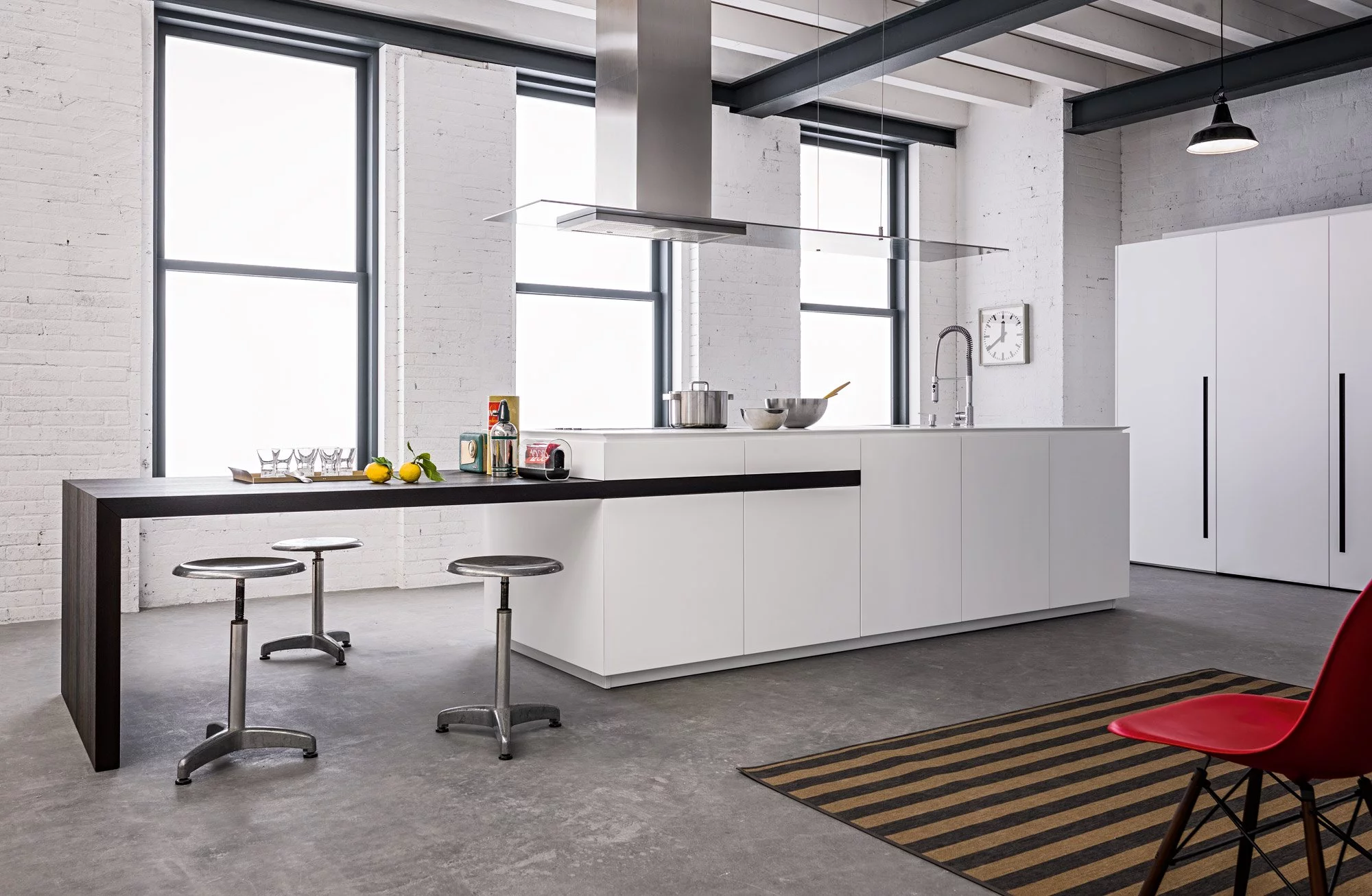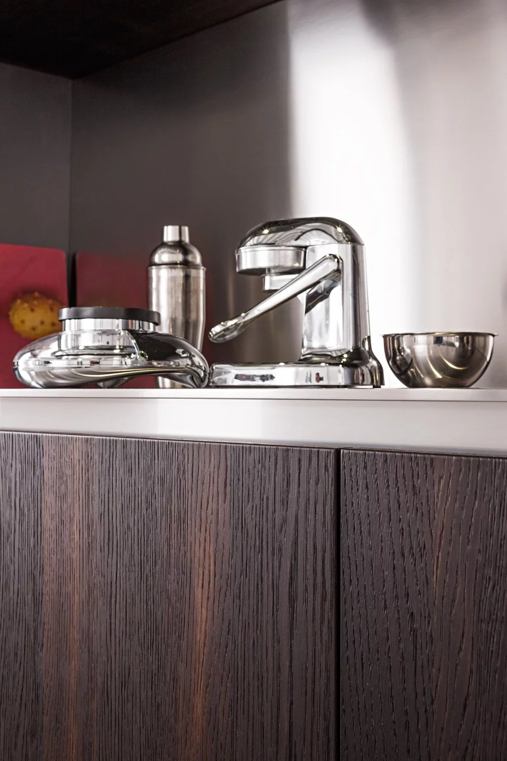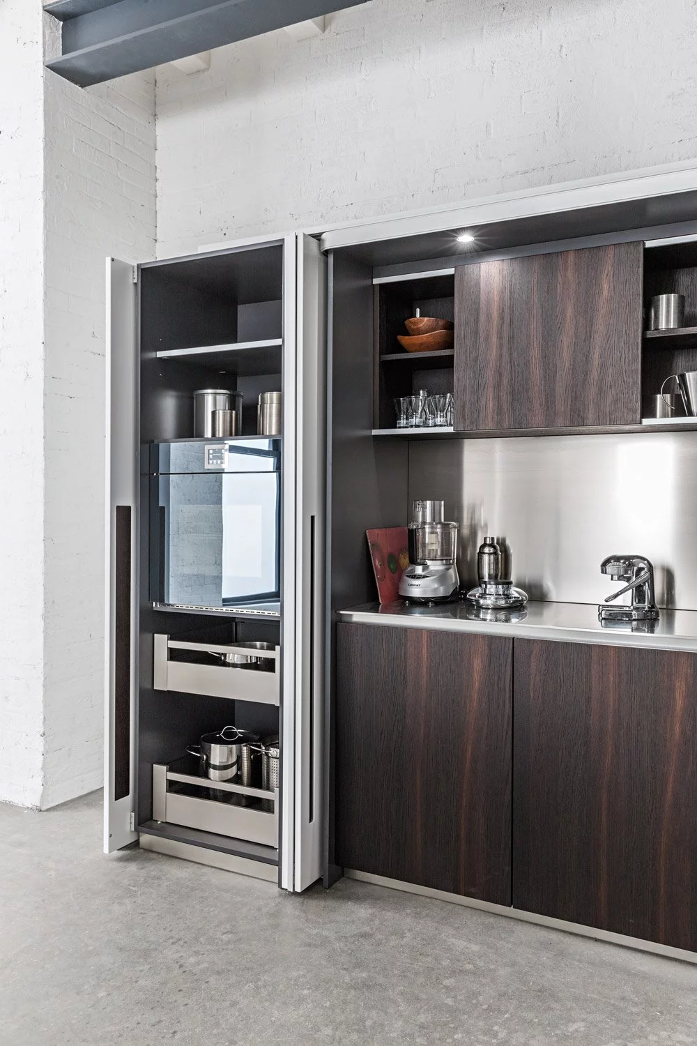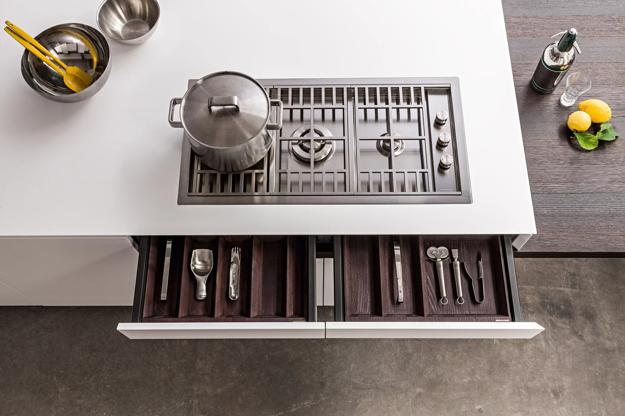 Столешница выполнена из нержавеющей стали толщиной 8 мм с изогнутой рукояткой. В дизайне этой композиции создана идеальная симметрия, в которой учитывается пространство для размещения как дверей, так и больших ёмкостных ящиков. Каждый модуль тщательно спланирован и разработан с применением правил линейной геометрии.