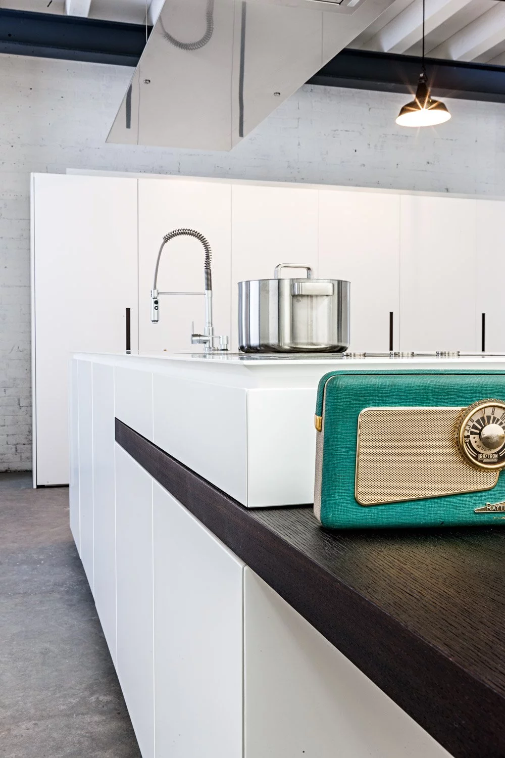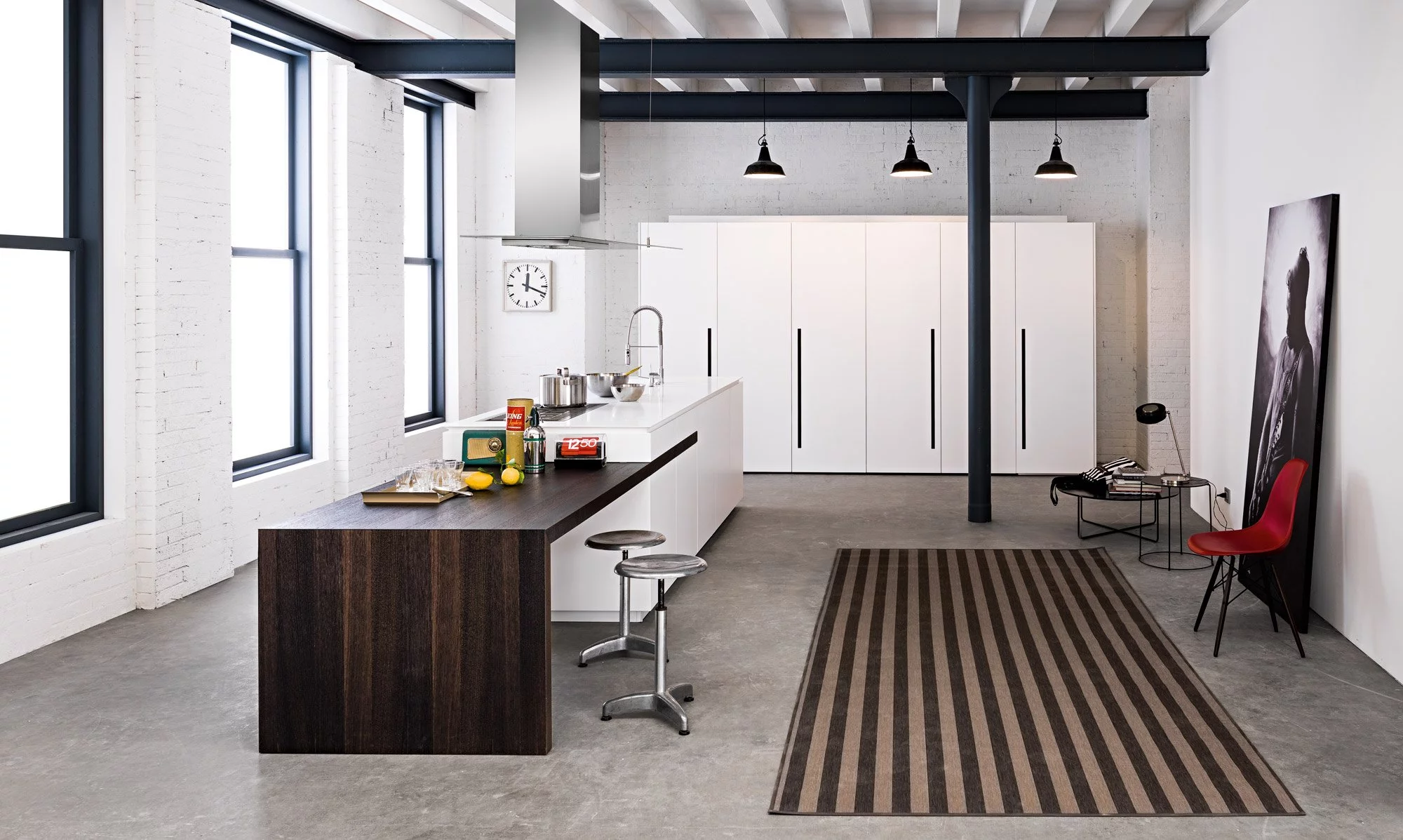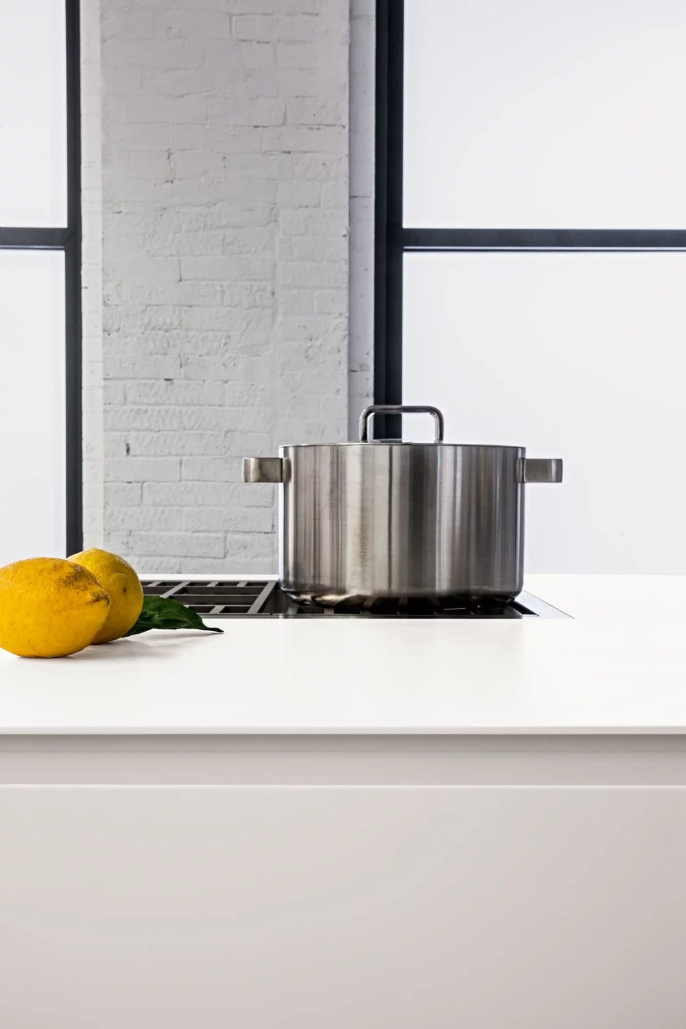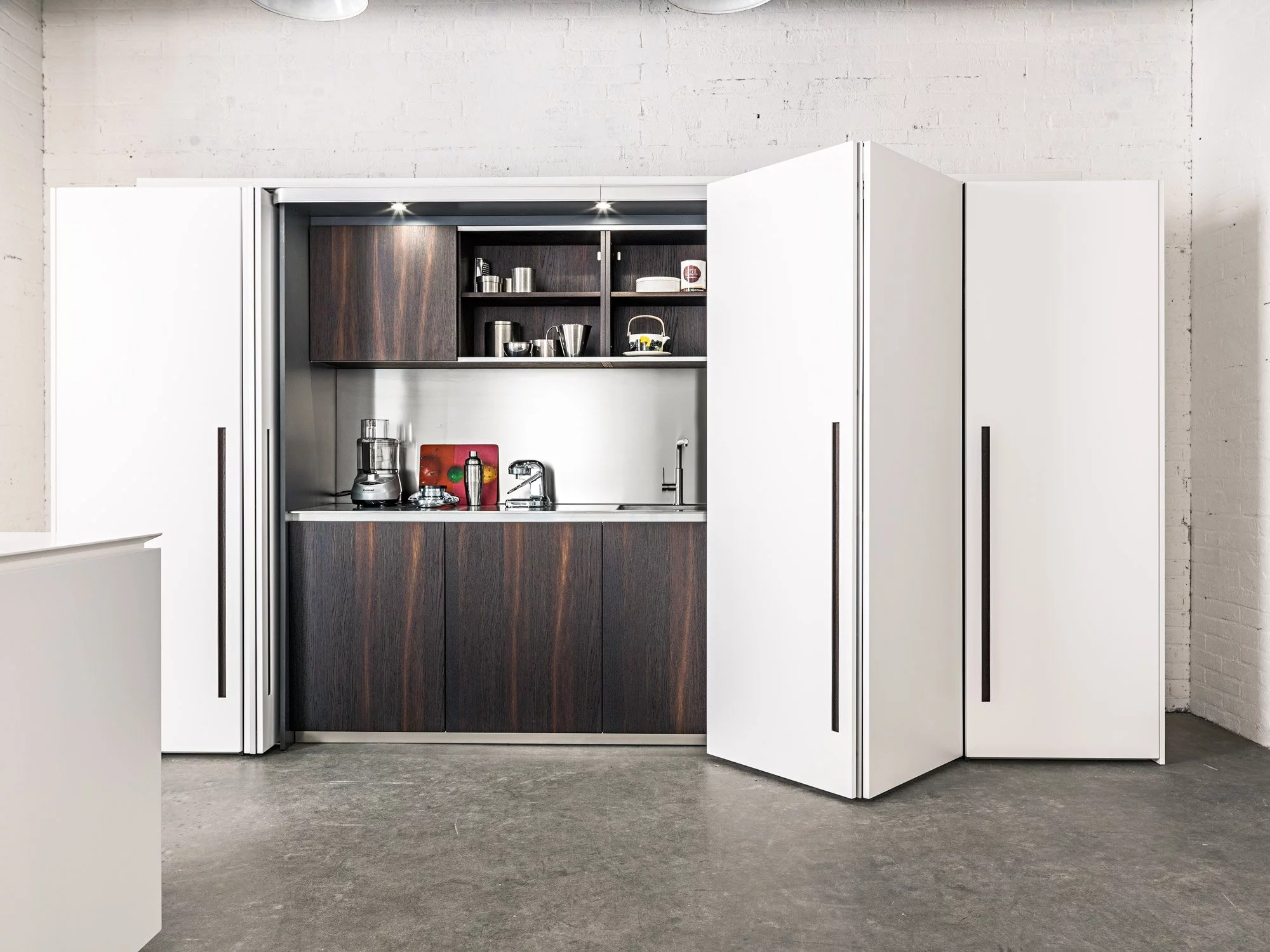 Столешница выполнена из нержавеющей стали толщиной 8 мм с изогнутой рукояткой. В дизайне этой композиции создана идеальная симметрия, в которой учитывается пространство для размещения как дверей, так и больших ёмкостных ящиков. Каждый модуль тщательно спланирован и разработан с применением правил линейной геометрии.