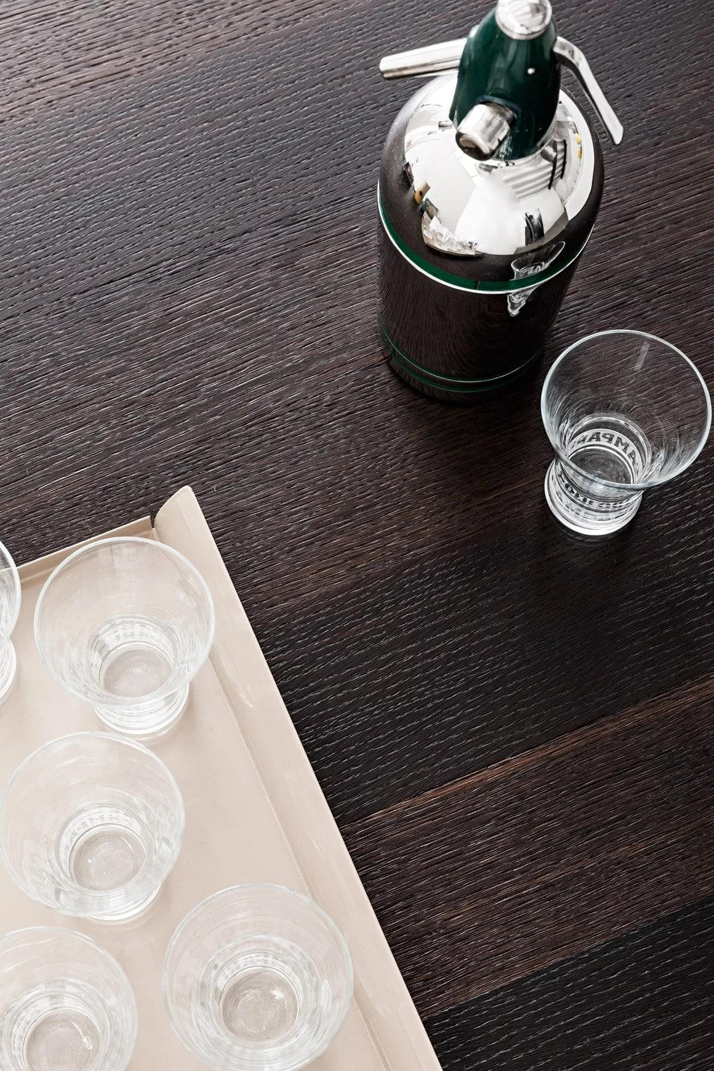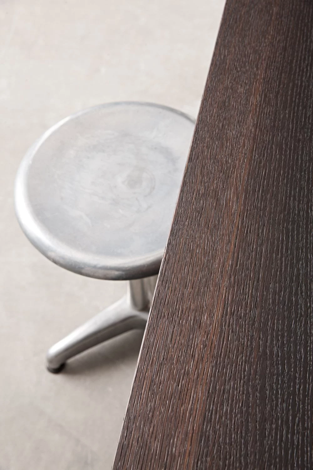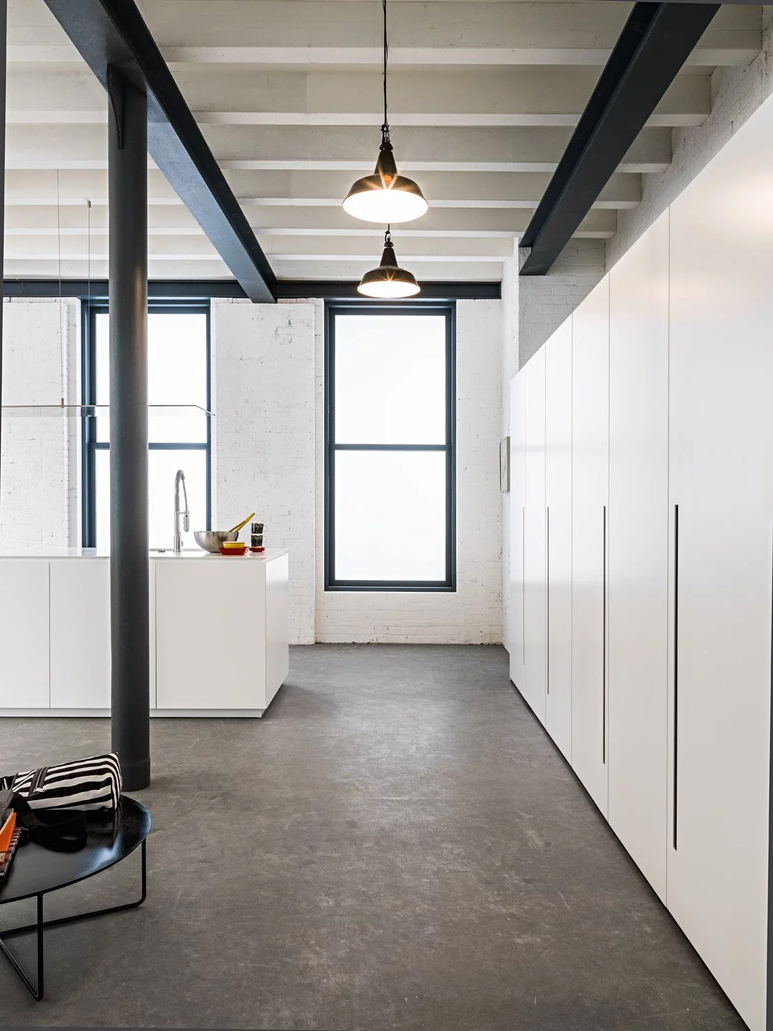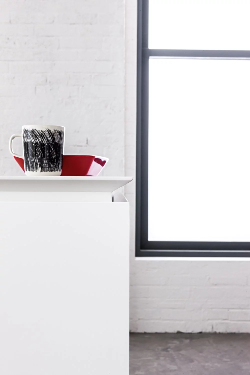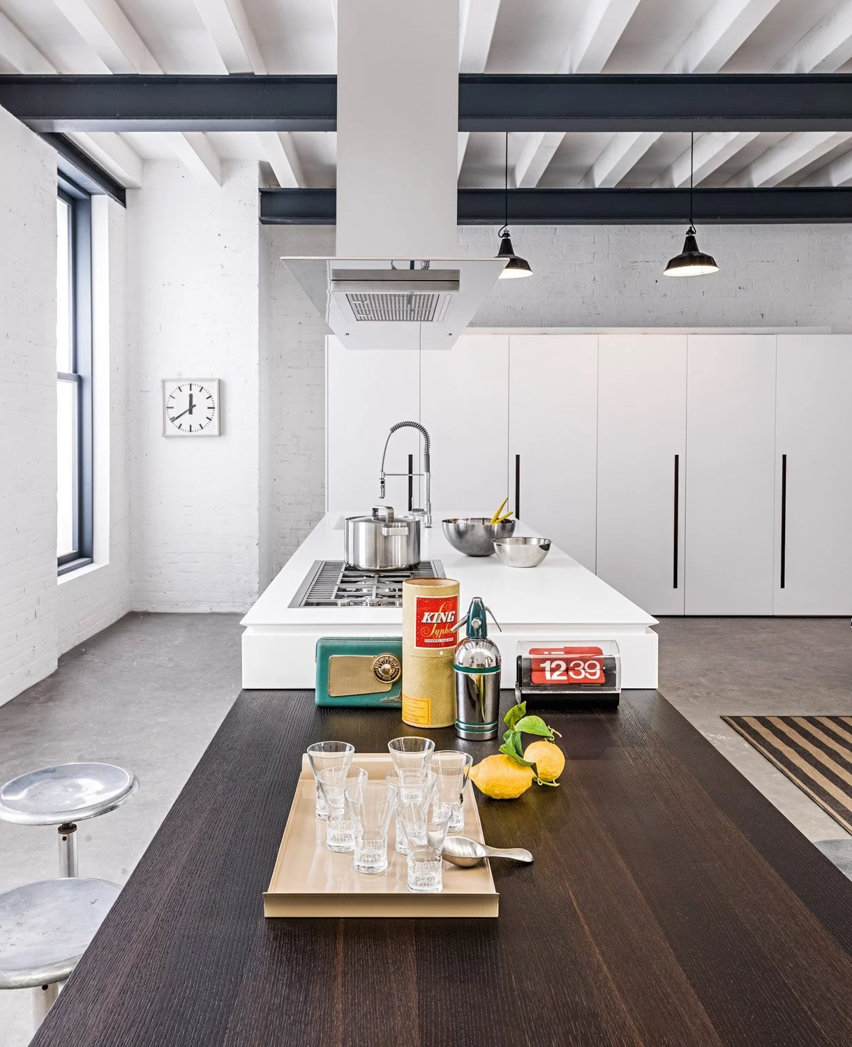 Столешница выполнена из нержавеющей стали толщиной 8 мм с изогнутой рукояткой. В дизайне этой композиции создана идеальная симметрия, в которой учитывается пространство для размещения как дверей, так и больших ёмкостных ящиков. Каждый модуль тщательно спланирован и разработан с применением правил линейной геометрии.