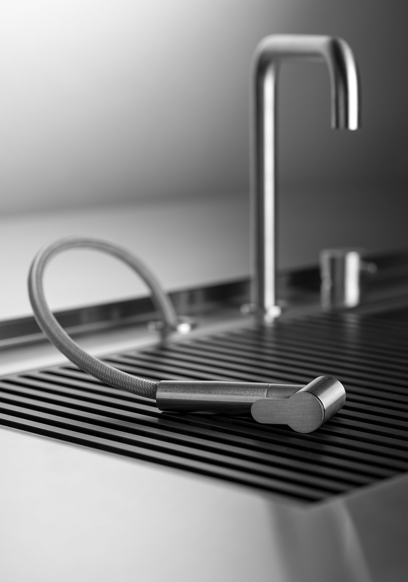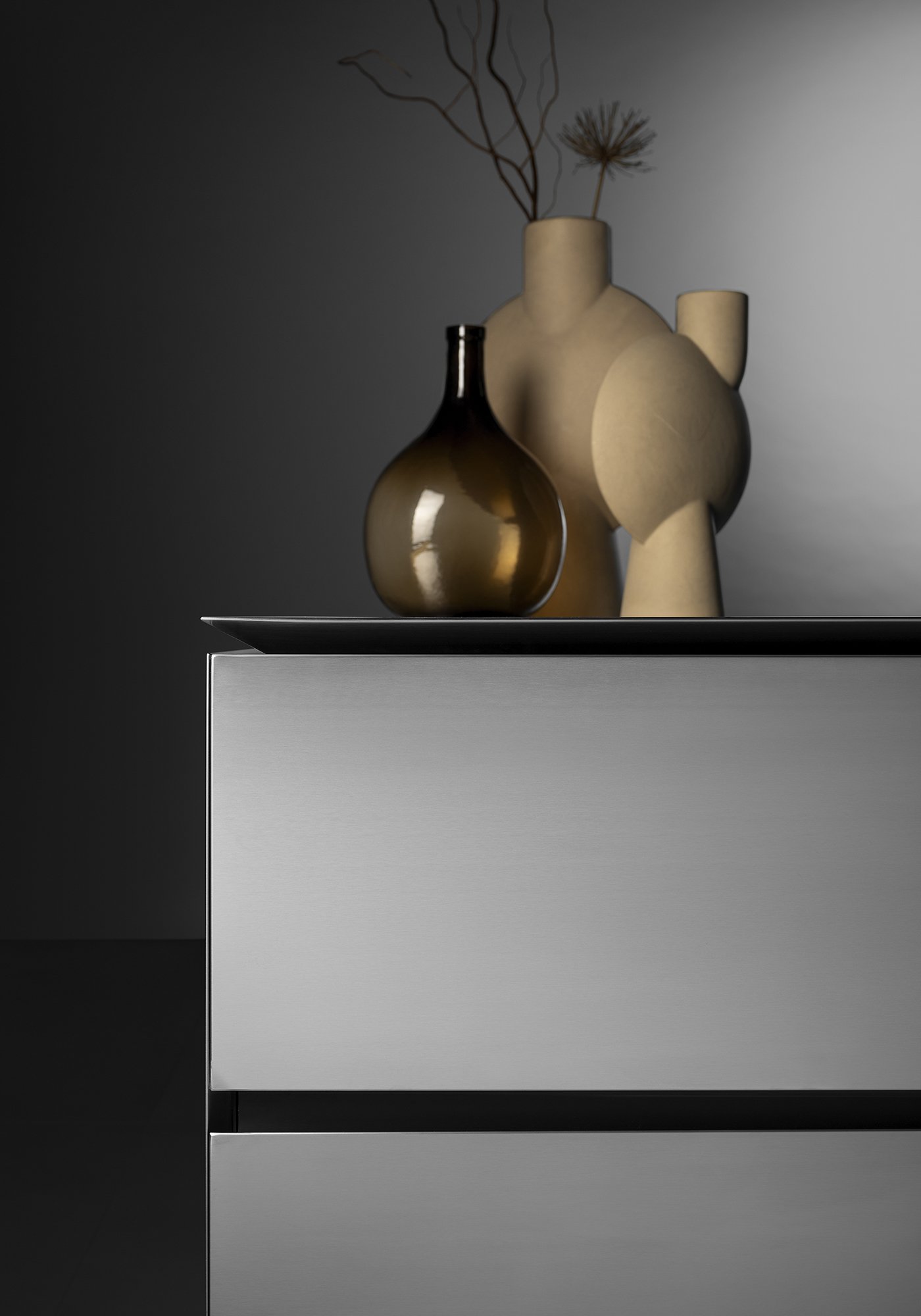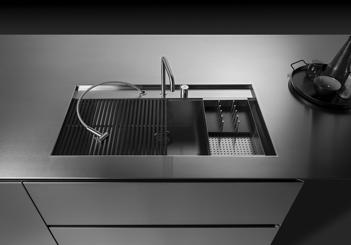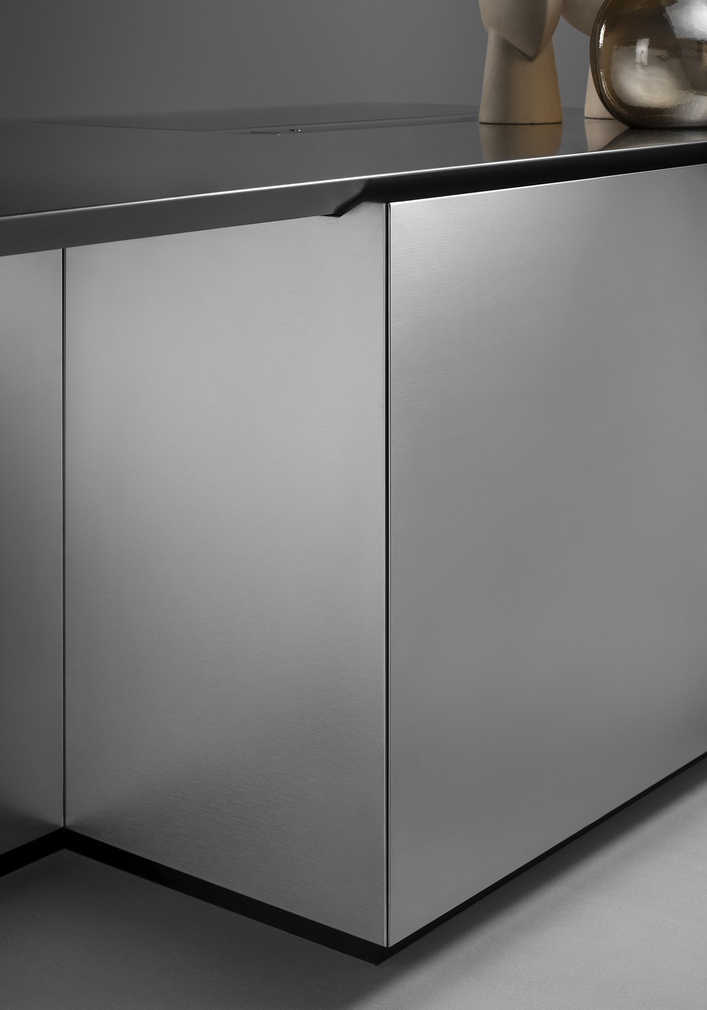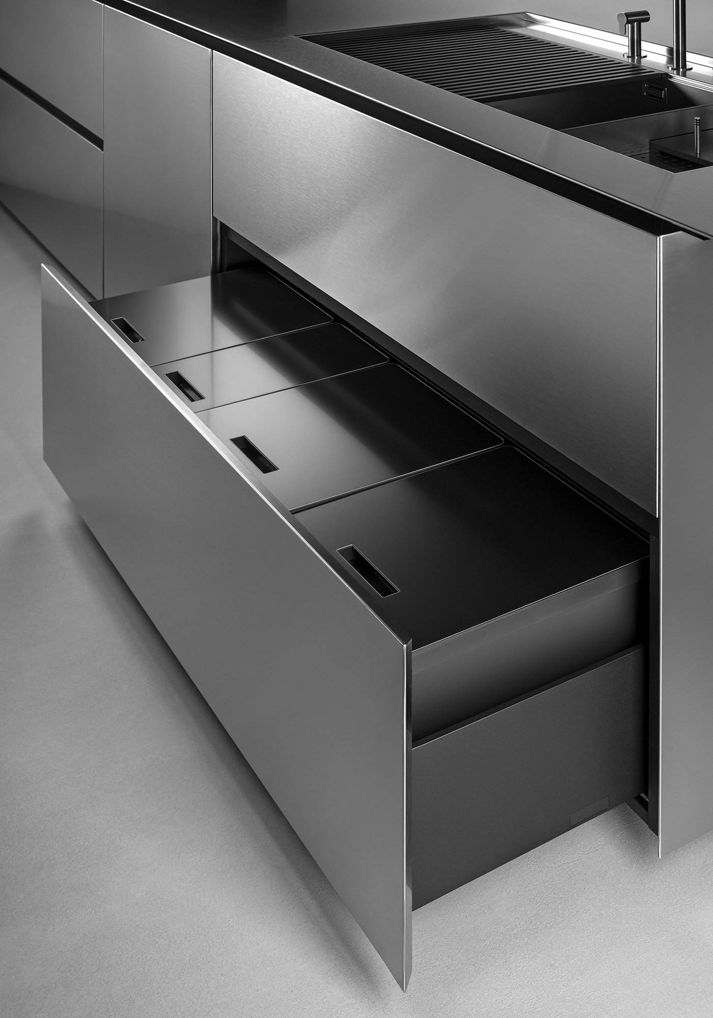 Функциональность здесь доведена до совершенства. Интегрированная стальная мойка образует единое целое с рабочей поверхностью, обеспечивая удобство и долговечность. Скрытые системы хранения с механизмом Revego позволяют трансформировать пространство, убирая из поля зрения всё лишнее и сохраняя минималистичную чистоту линий.