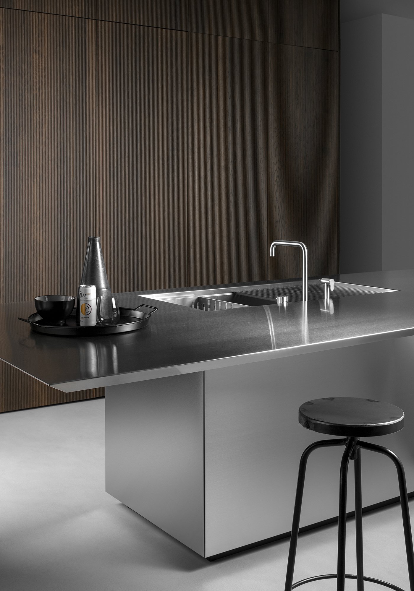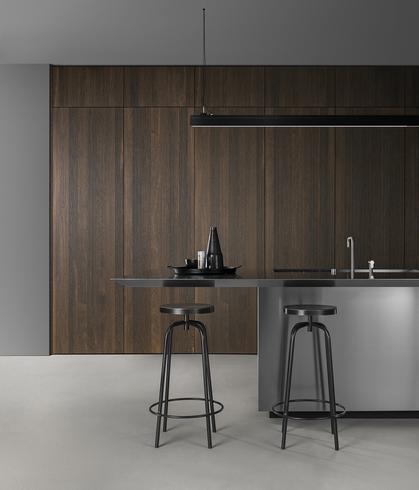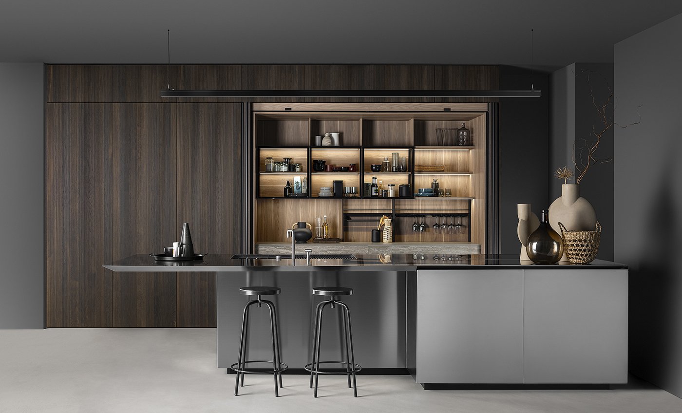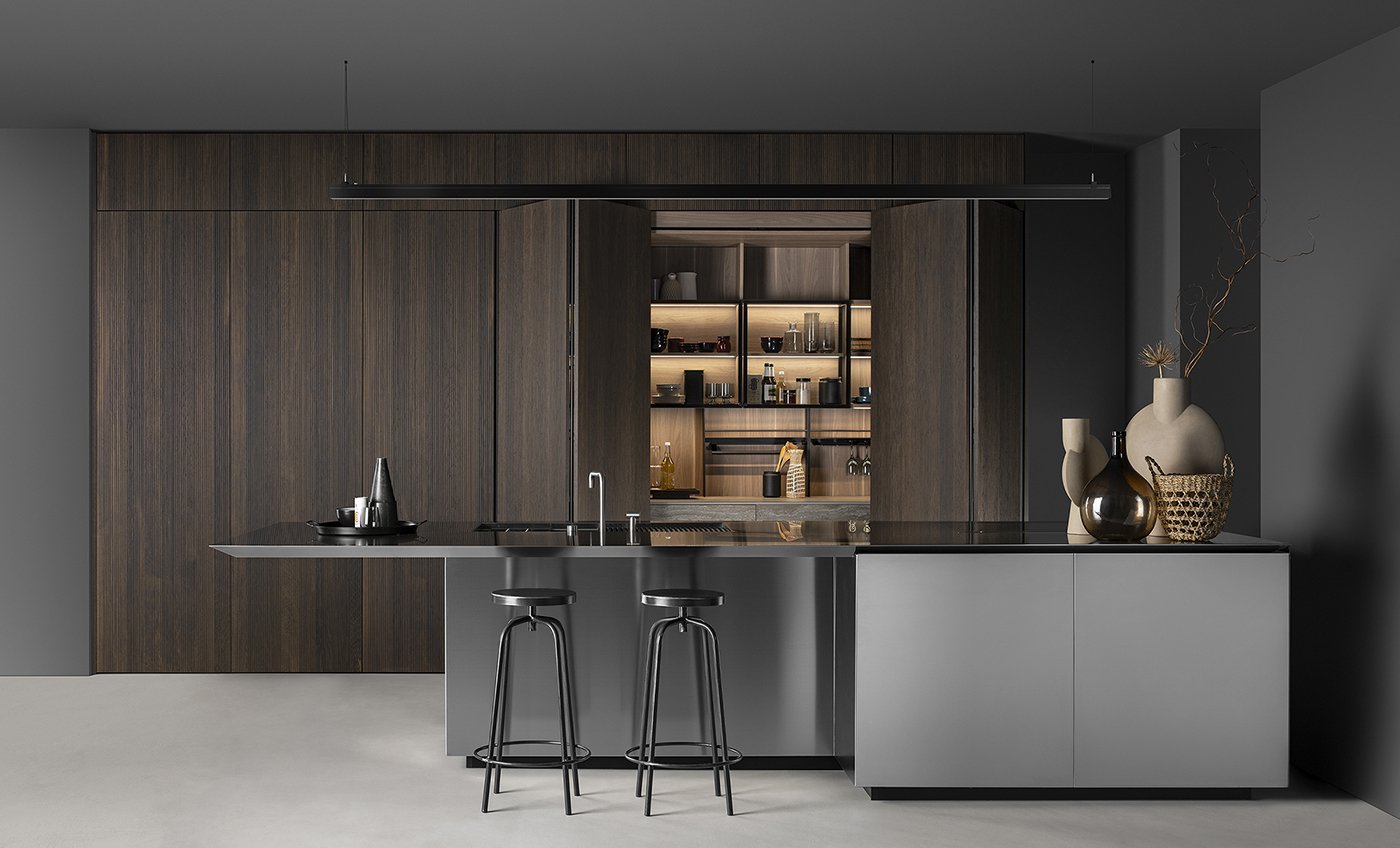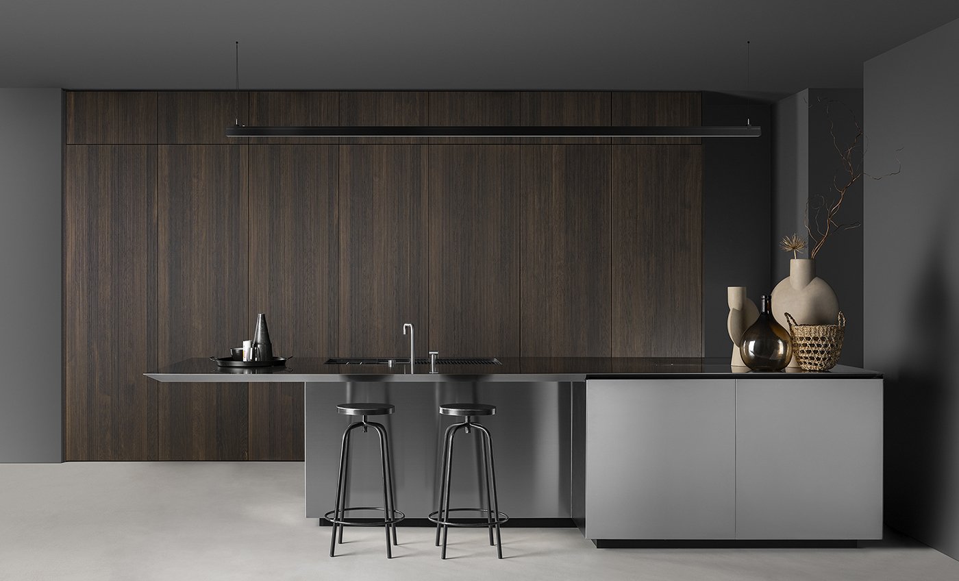 Центральный стальной остров становится ключевым акцентом композиции. Его индустриальная эстетика контрастирует с древесными фактурами, создавая эффект напряжения и динамики. Геометрия острова, сложные углы и массивная столешница подчёркивают технологичность и современный характер кухни, делая её визуально мощной и выразительной.