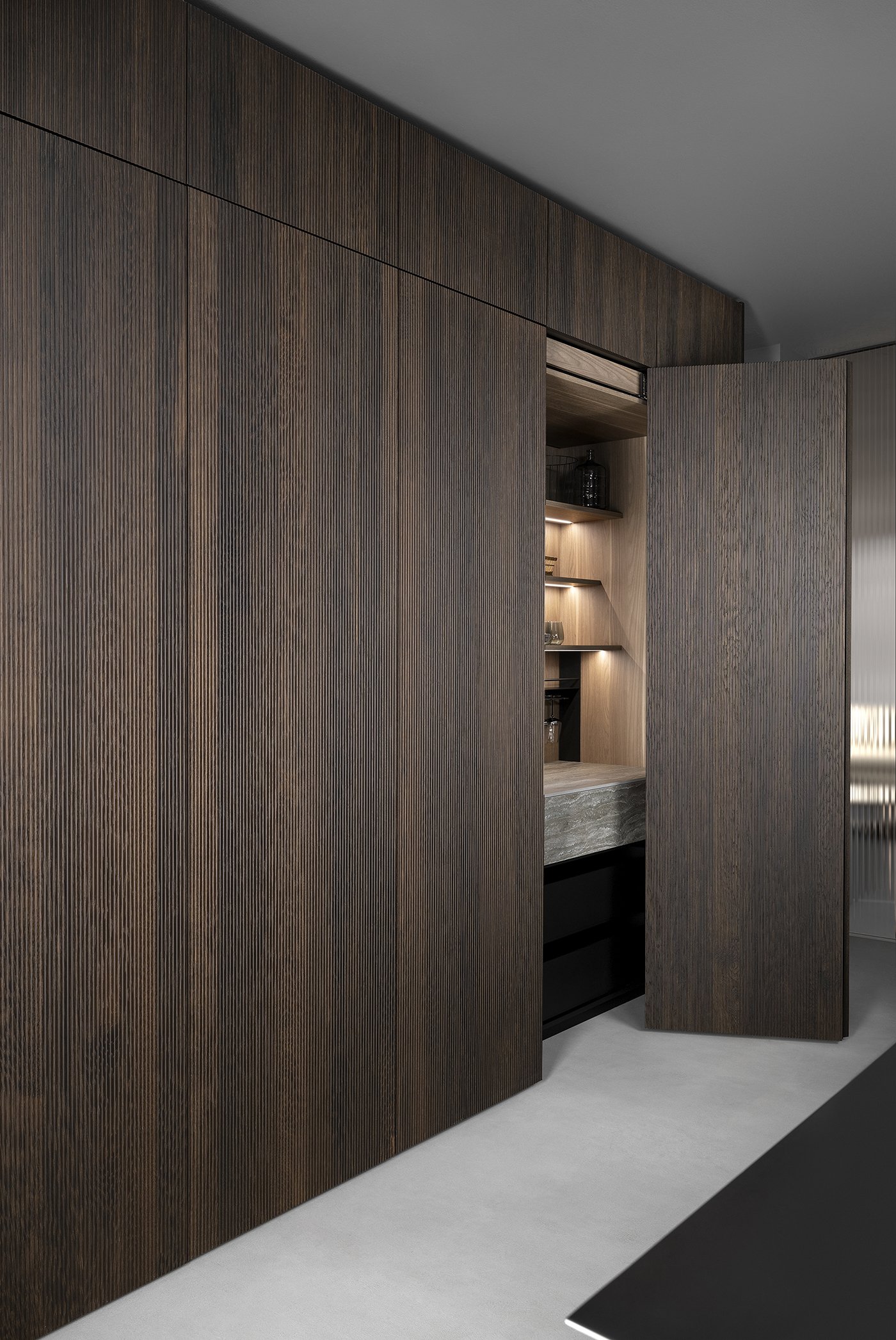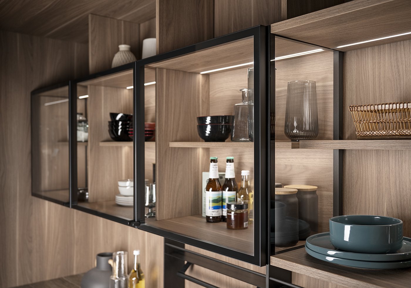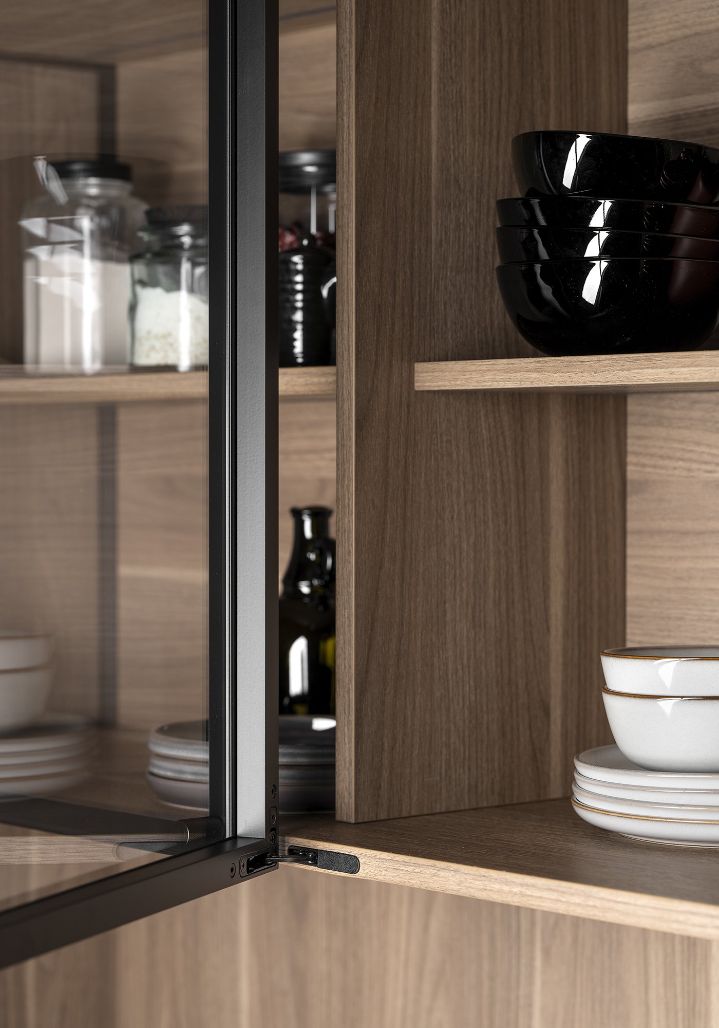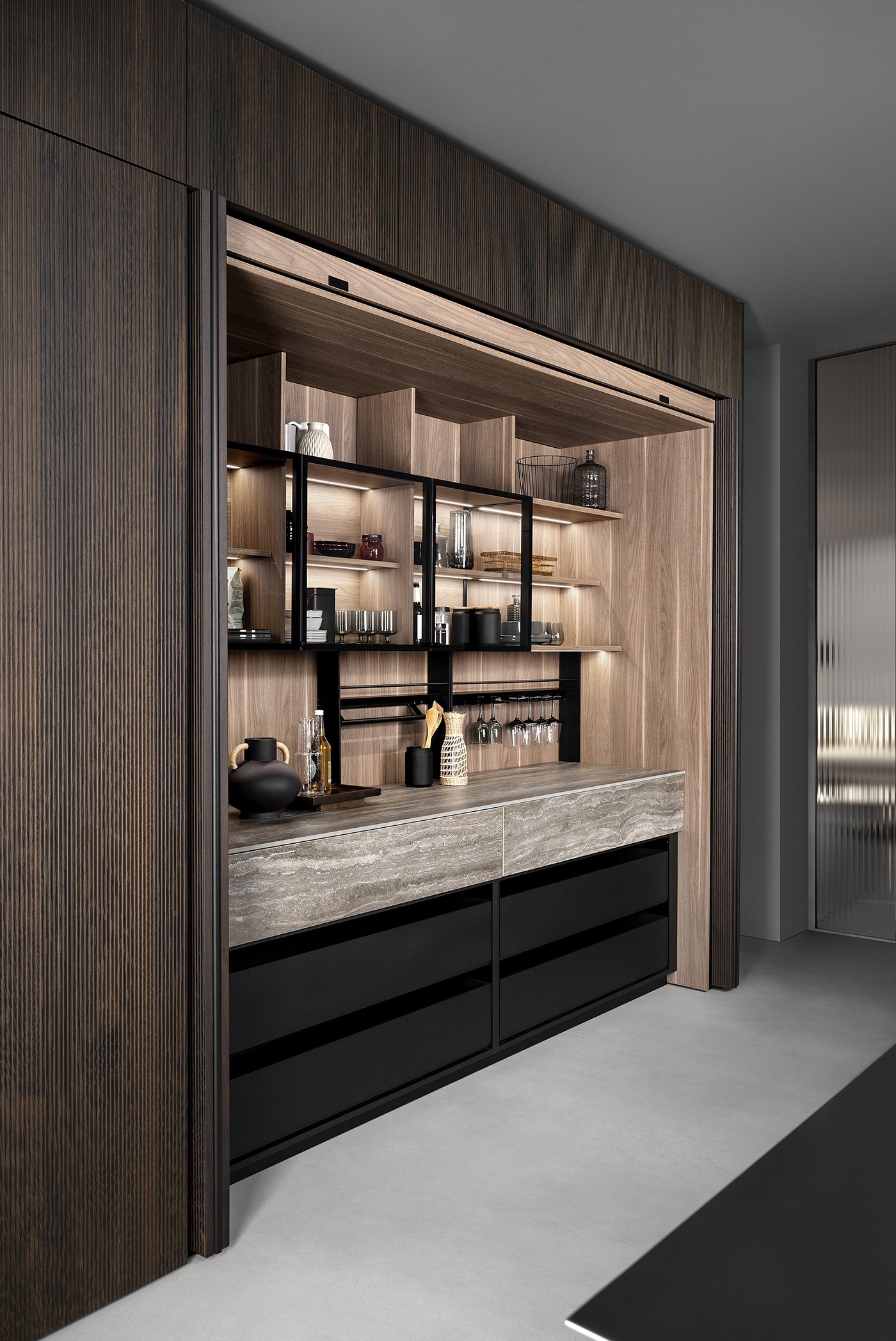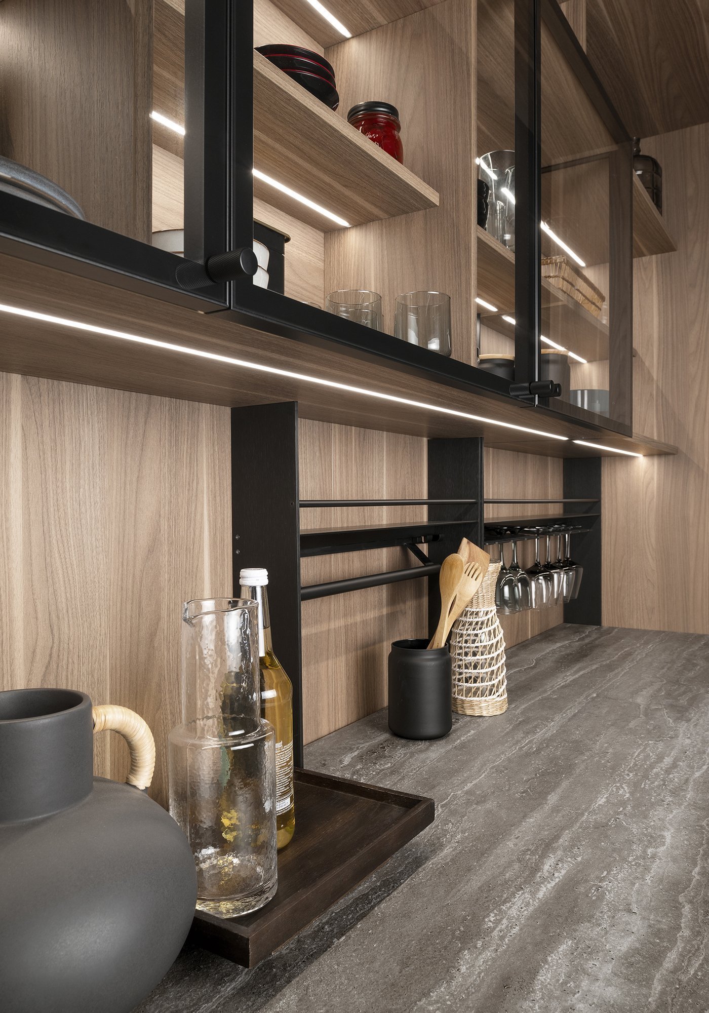 Особое внимание уделено деталям, которые формируют уникальный характер кухни. Стеклянная витрина с прозрачными боковыми панелями и тонкими петлями создаёт ощущение лёгкости и почти невесомости, контрастируя с массивными элементами. Открытые модули из ореха с мягкой подсветкой добавляют глубину и уют, превращая кухню в живое, многослойное пространство.