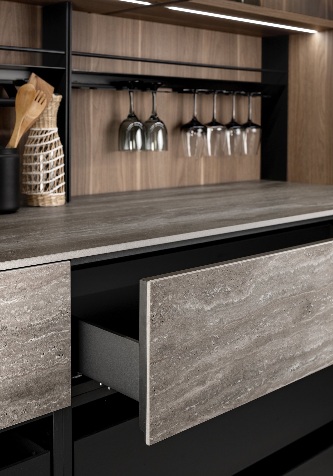 Чёрные акценты в виде функциональных подвесных элементов усиливают графичность интерьера и делают его более современным. Керамические фасады ящиков добавляют тактильное разнообразие и подчёркивают премиальный уровень исполнения.