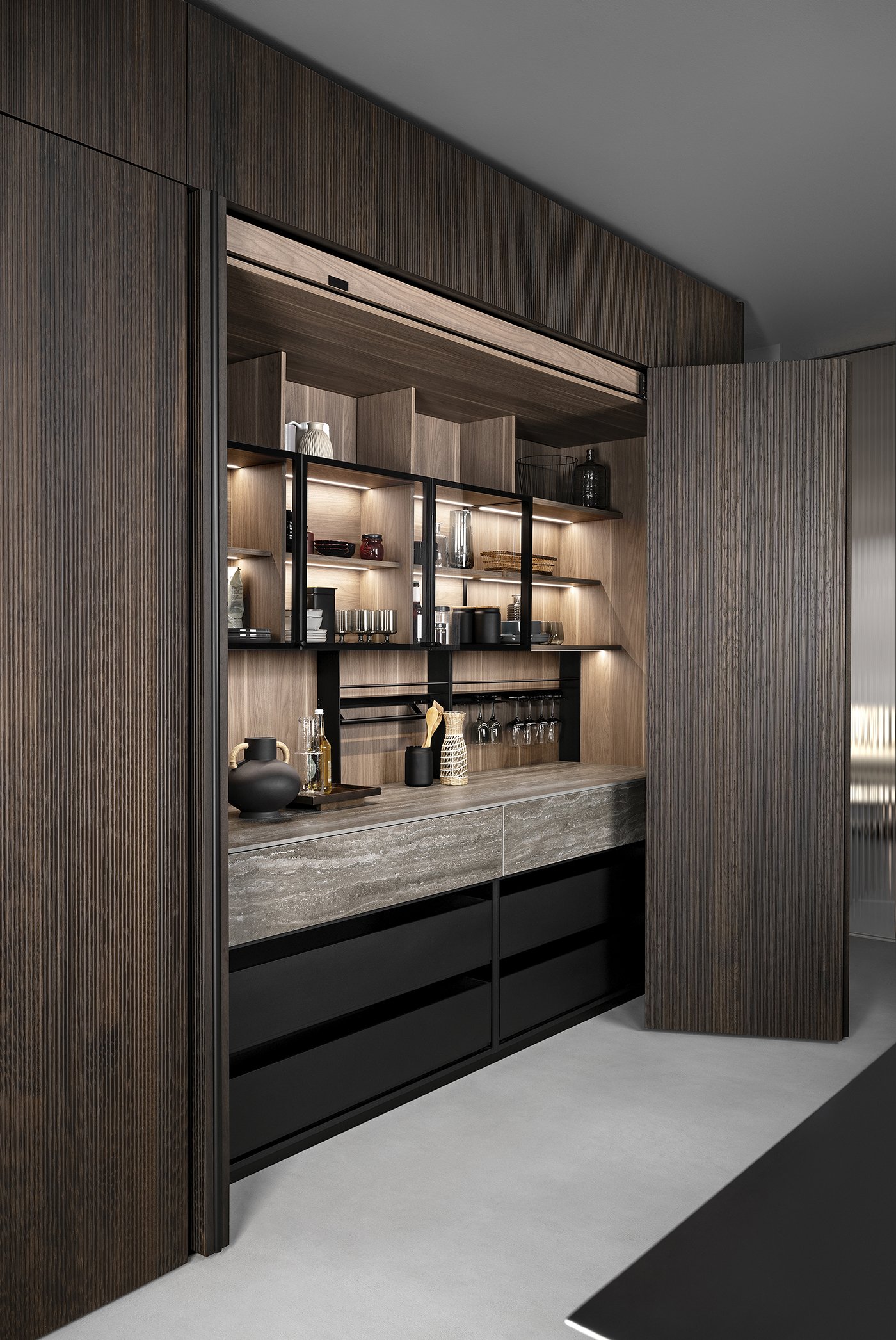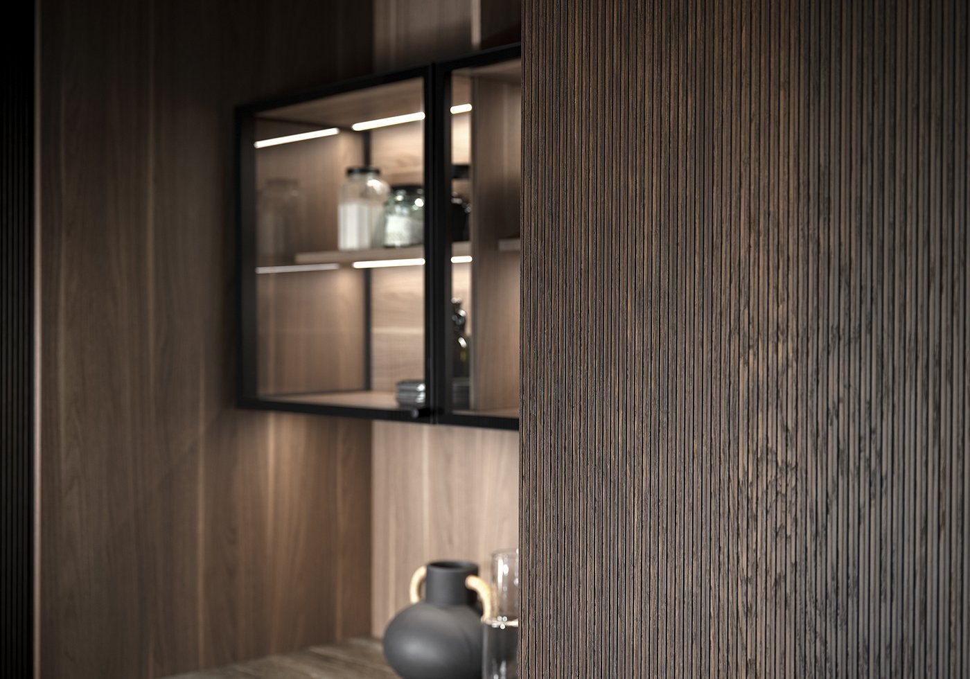 Кухня Linea - это смелое и продуманное пространство, построенное на игре контрастов, где традиционные материалы обретают новое звучание в современной интерпретации. В основе концепции лежит диалог между теплом натурального дерева и холодной выразительностью стали, создающий яркий и запоминающийся визуальный образ. Фасады из термообработанного дуба с ритмичной рифлёной текстурой формируют глубокую, почти архитектурную поверхность. Они выглядят монументально и при этом сохраняют природную теплоту, создавая ощущение уюта и стабильности. Однако за этой внешней строгостью скрывается тщательно продуманное внутреннее пространство: ниши из благородного ореха с керамическими элементами добавляют интерьеру глубину и утончённость.