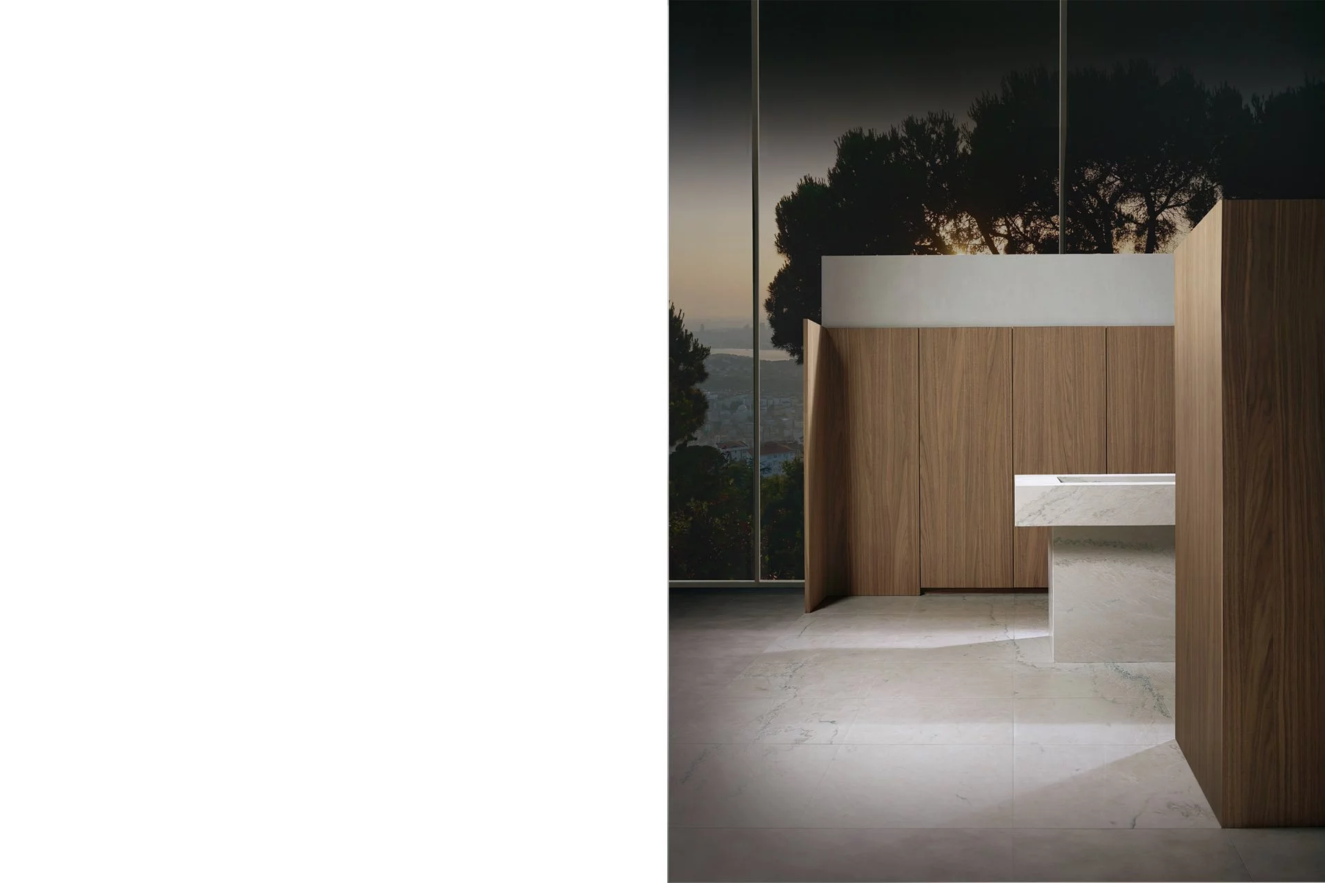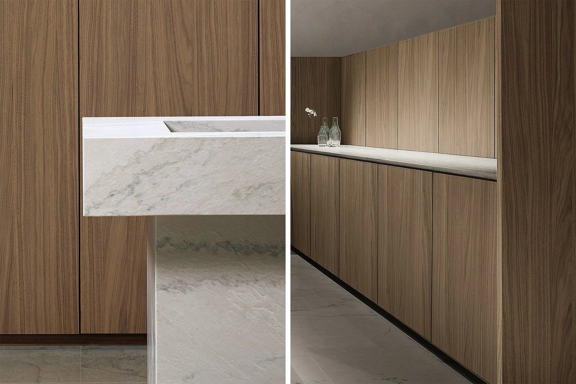 Для больших любителей кулинарии предлагается масштабная кухня из современной коллекции 045. Модель вместит не только большое количество кухонной утвари, и позволит органично интегрировать бытовую технику. Отделка системы хранения в виде дерева позволяет слиться с основным дизайном комнаты при выборе аналогичного покрытия.