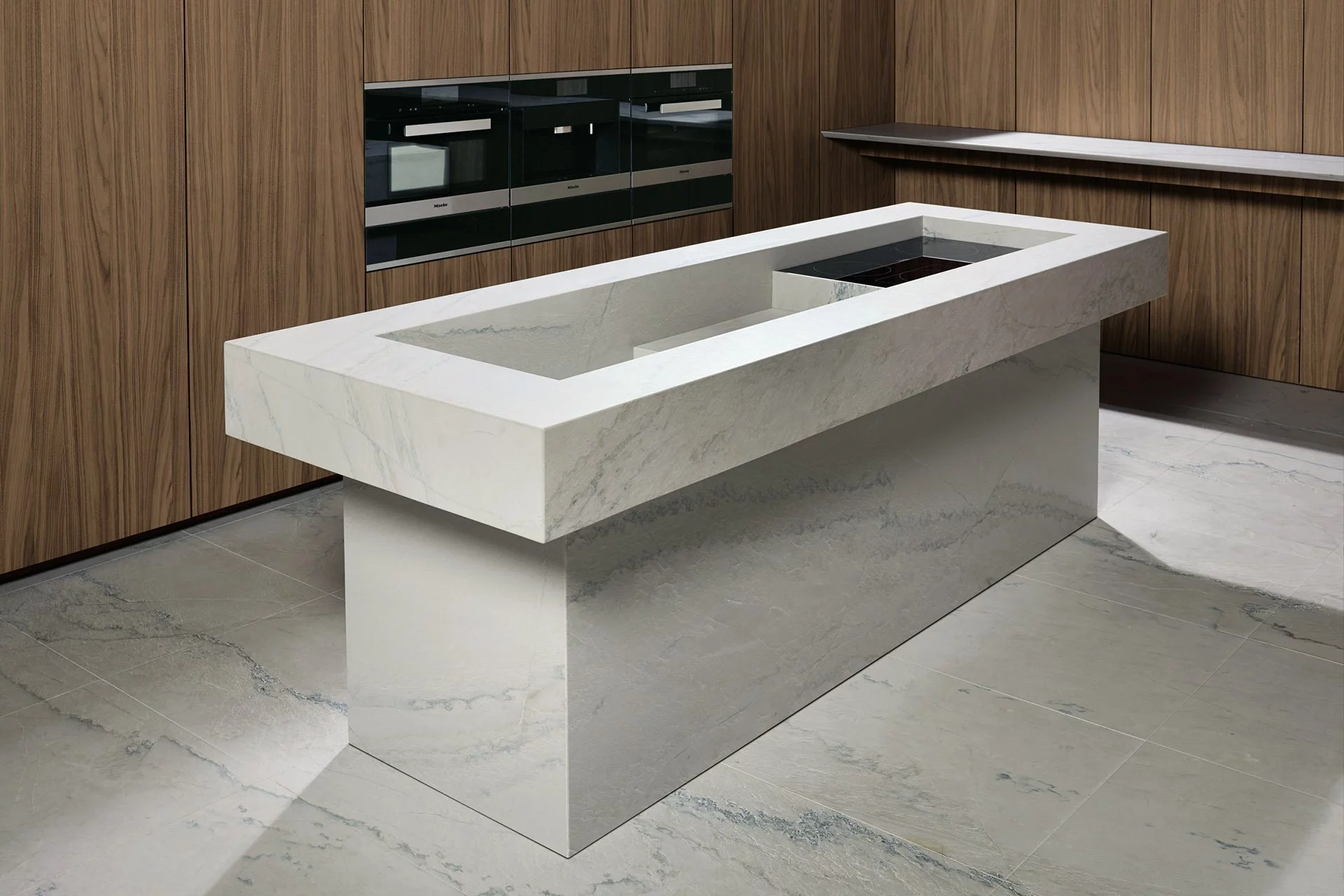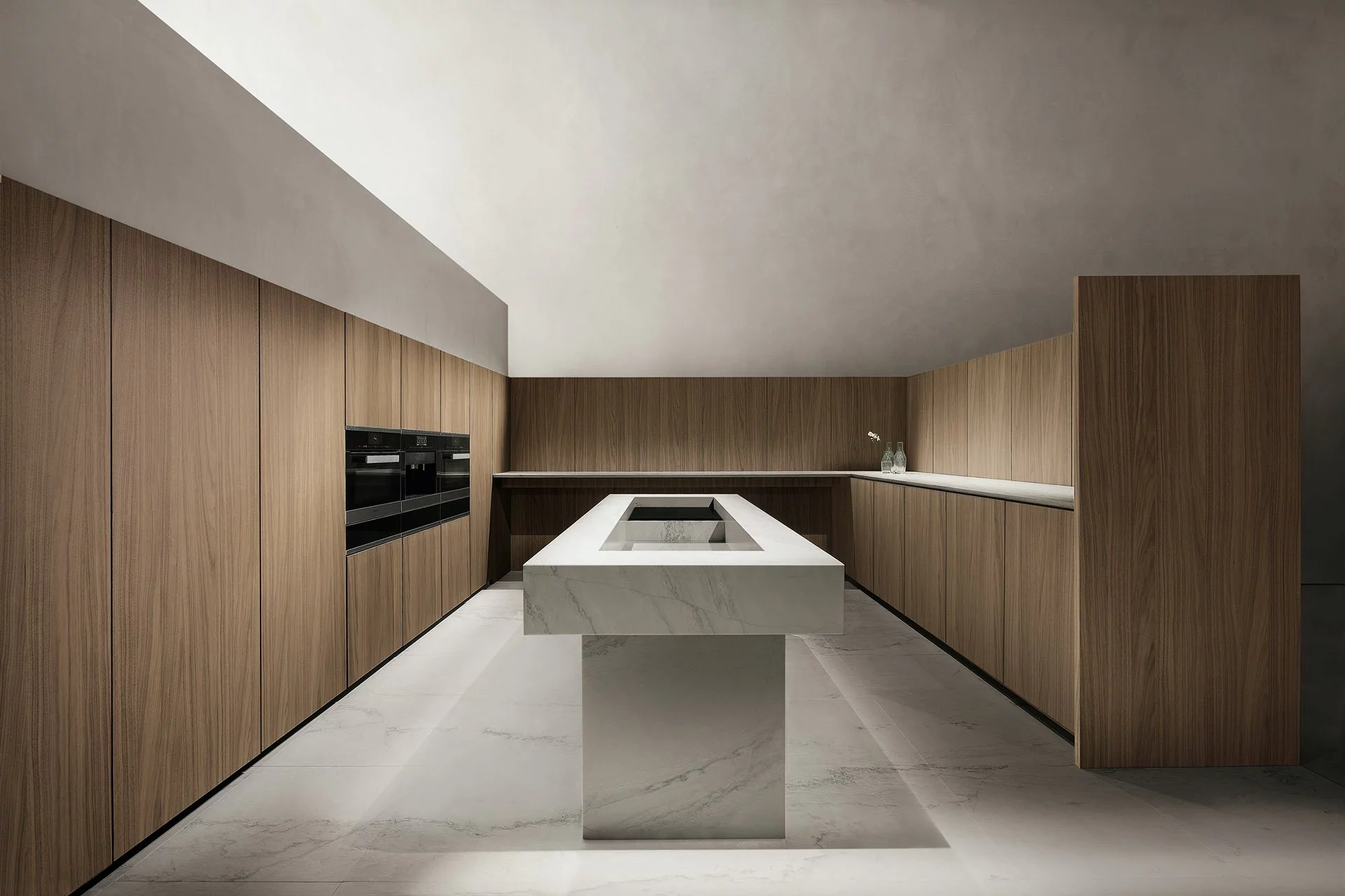 Кроме вместительной системы хранения, кухня 045 впечатляет своим островом, где можно с легкостью промыть продукты благодаря встроенной мойке и приготовить на интегрированной индукционной плите. Область для нарезки представлена столешницей, расположенной на тумбах.
