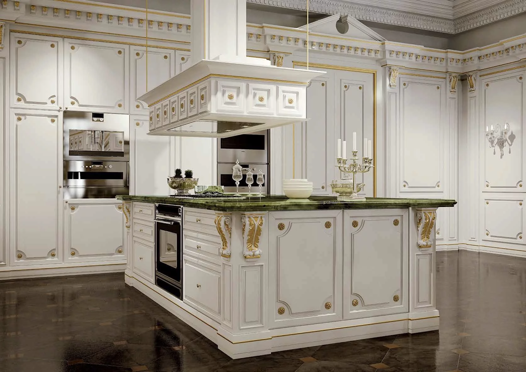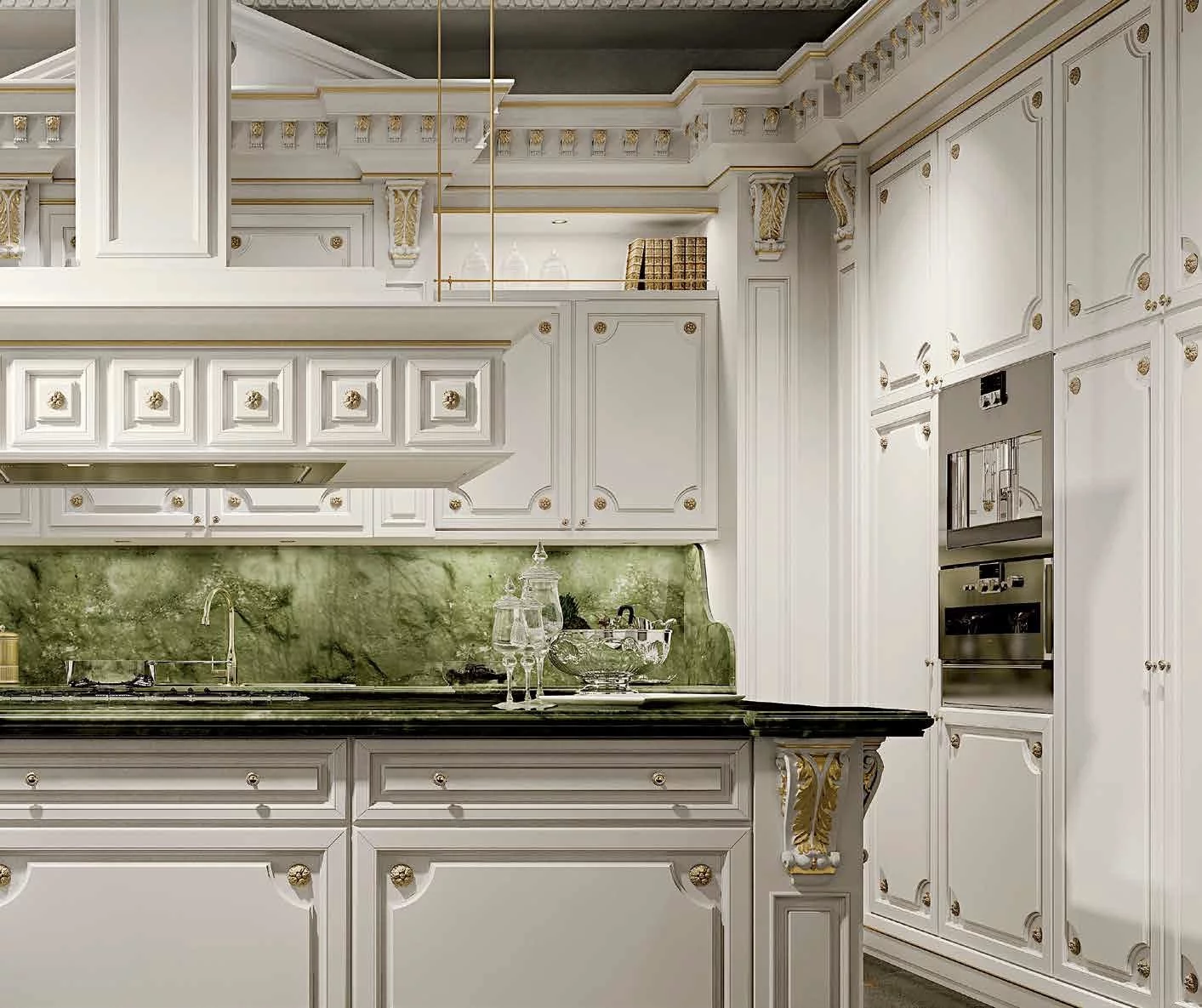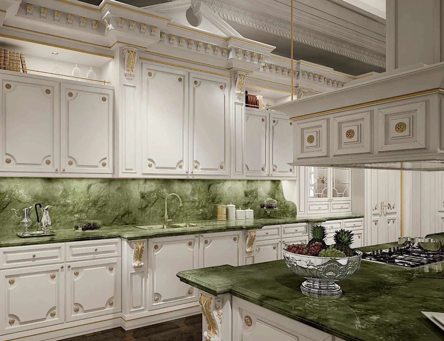 Великолепная отделка патиной, малахитовые столешницы и резная фурнитура дополняют модель шиком и элегантностью. При этом вся современная бытовая техника органично вписывается в изделие, не нарушая целостность дизайна.