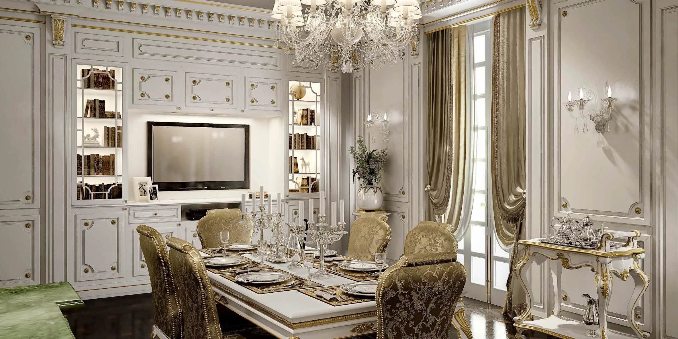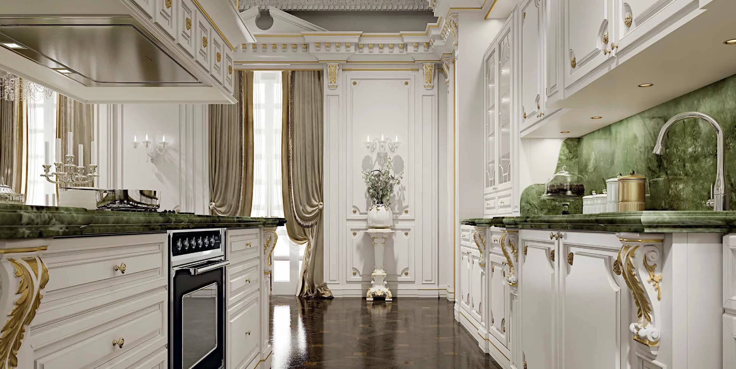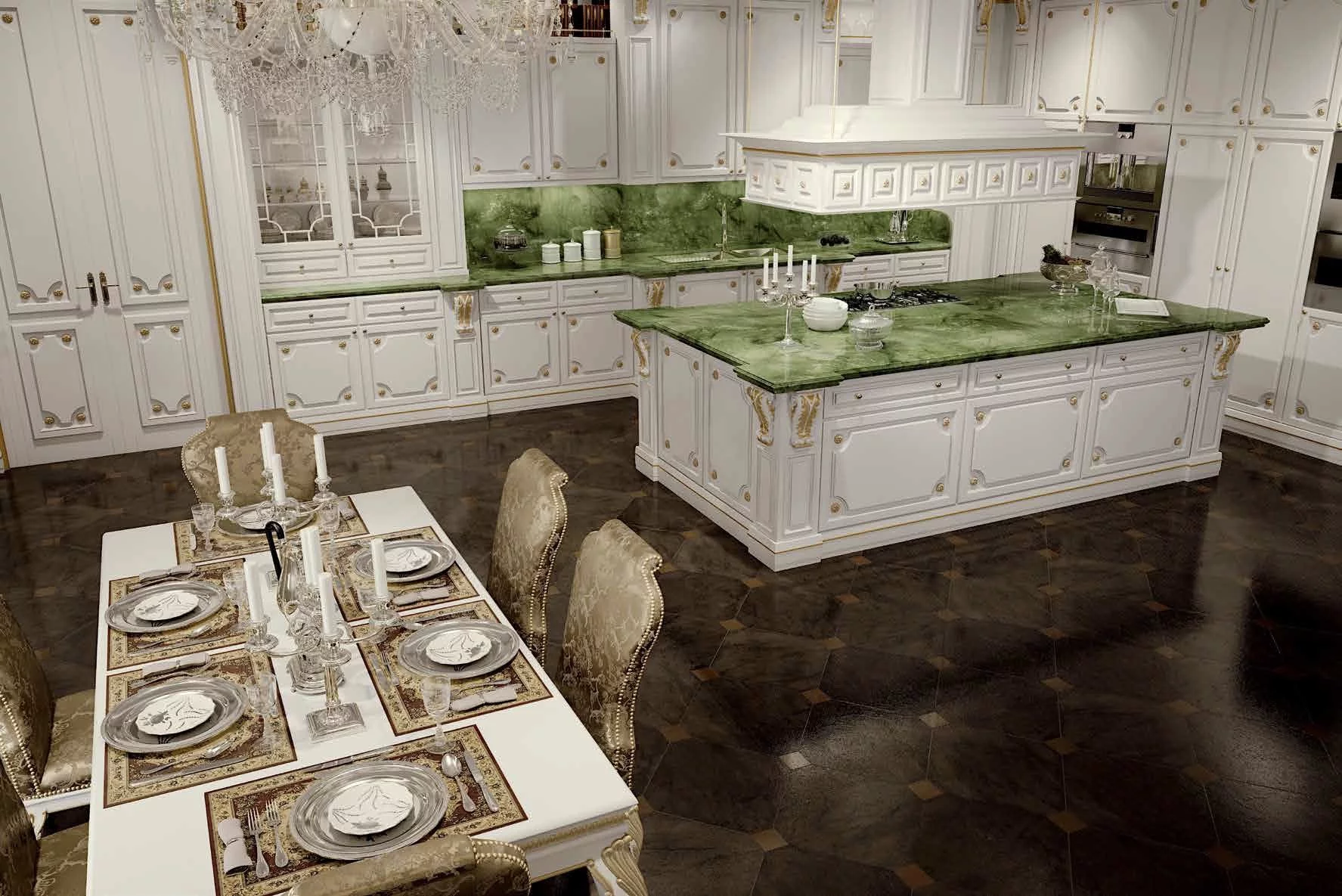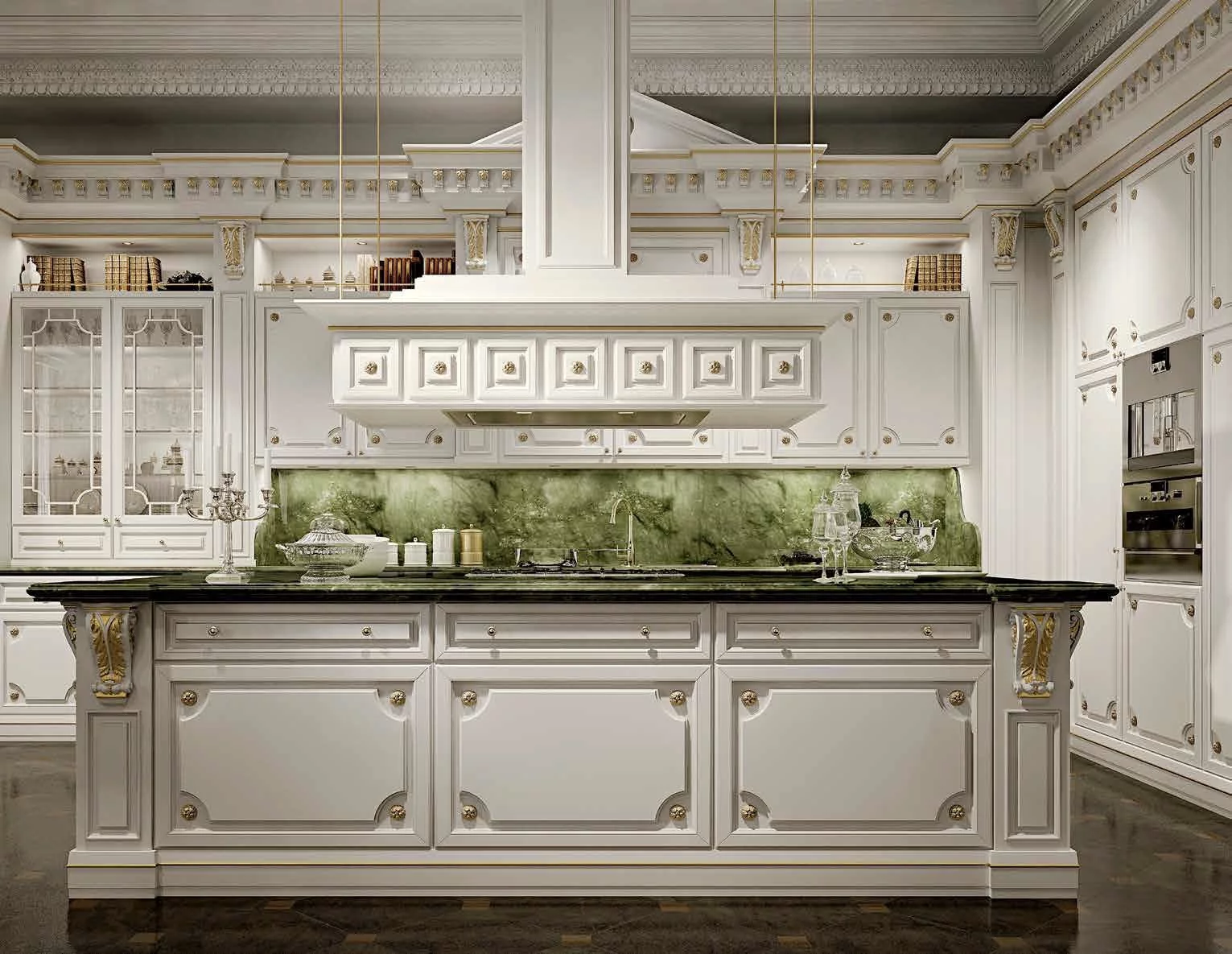 Великолепная отделка патиной, малахитовые столешницы и резная фурнитура дополняют модель шиком и элегантностью. При этом вся современная бытовая техника органично вписывается в изделие, не нарушая целостность дизайна.