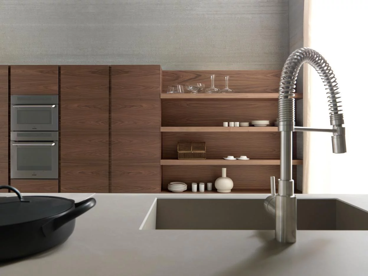 При этом кухня не только красива, но и предельно функциональна благодаря большим секциям и просторной рабочей поверхности, выполненной из акрилового камня. Покрытие из такого камня (кориана) идеально подходит для тех, кто стремится угнаться за модой и одновременно с успехом противостоять течению времени: Corian устойчив к износу, экологически чист и легок в обслуживании. Керлит, который также используется в отделке Twenty, обладает похожими свойствами: он устойчив к воздействию высоких температур, растворителей, дезинфицирующих средств и при этом полностью безопасен в качестве рабочей поверхности для приготовления еды.