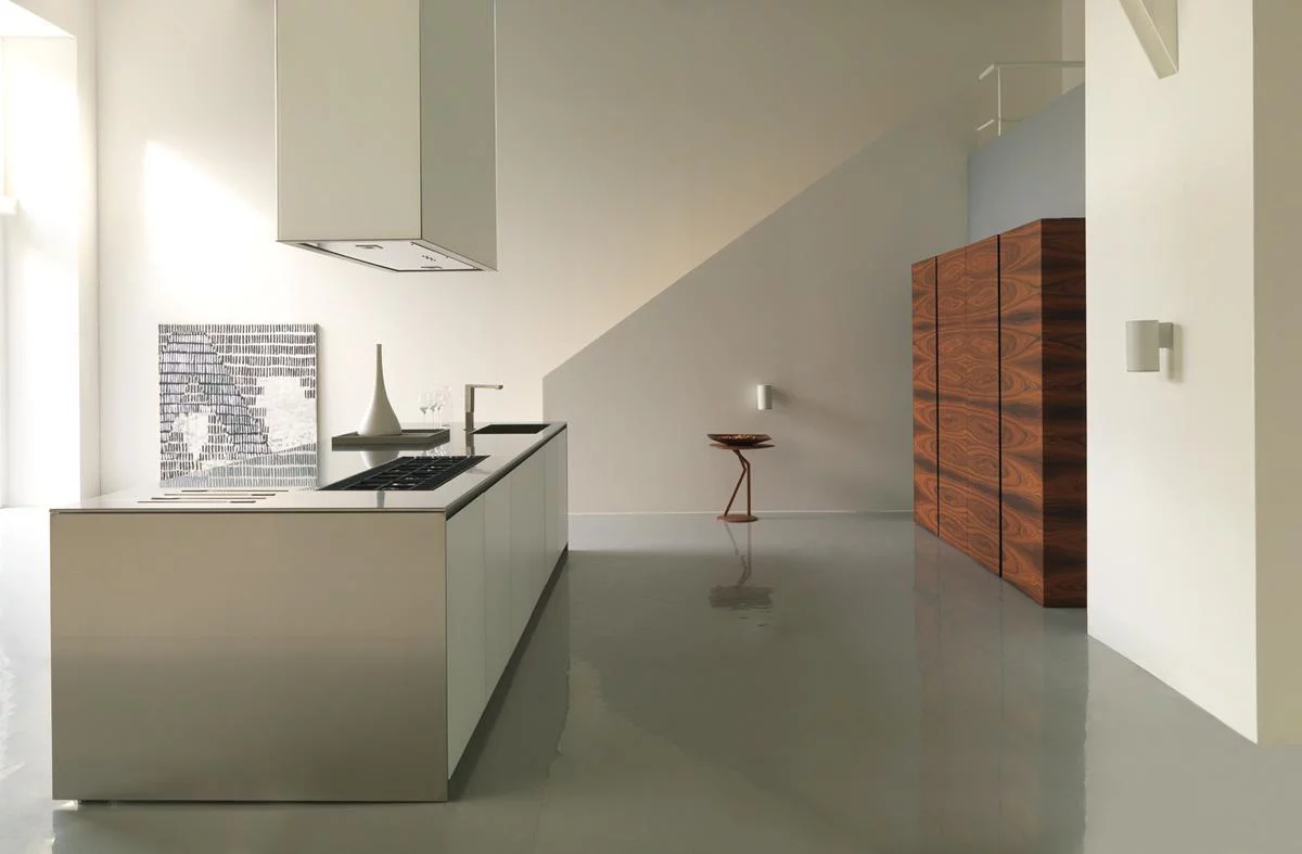 Дизайн кухонь Twenty, созданный специалистами итальянской фабрики Modulnova, сочетает в себе одновременно кухню и гостиную. Ее простой модульный стиль подчеркивается живописными пейзажами, которые открываются из окна.