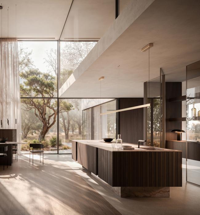 Программа Groove добавляет острову динамику: фасад из ореха Moka с каннелированием формирует ритмичный рисунок и создаёт плавное ощущение пространства. Ещё одной инновацией стала система Gola Verticale Vertical — уникальное решение для открывания фасадов без ручек. Выступающий элемент скрывает LED-подсветку, которая подчёркивает игру фактур, создаёт эффект лёгкости и делает остров центром притяжения интерьера.