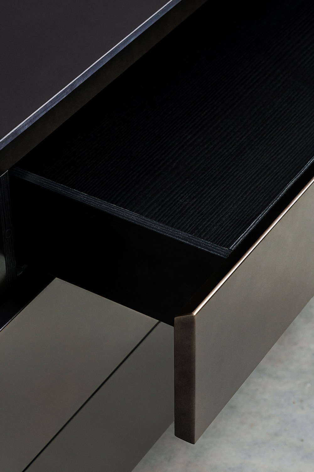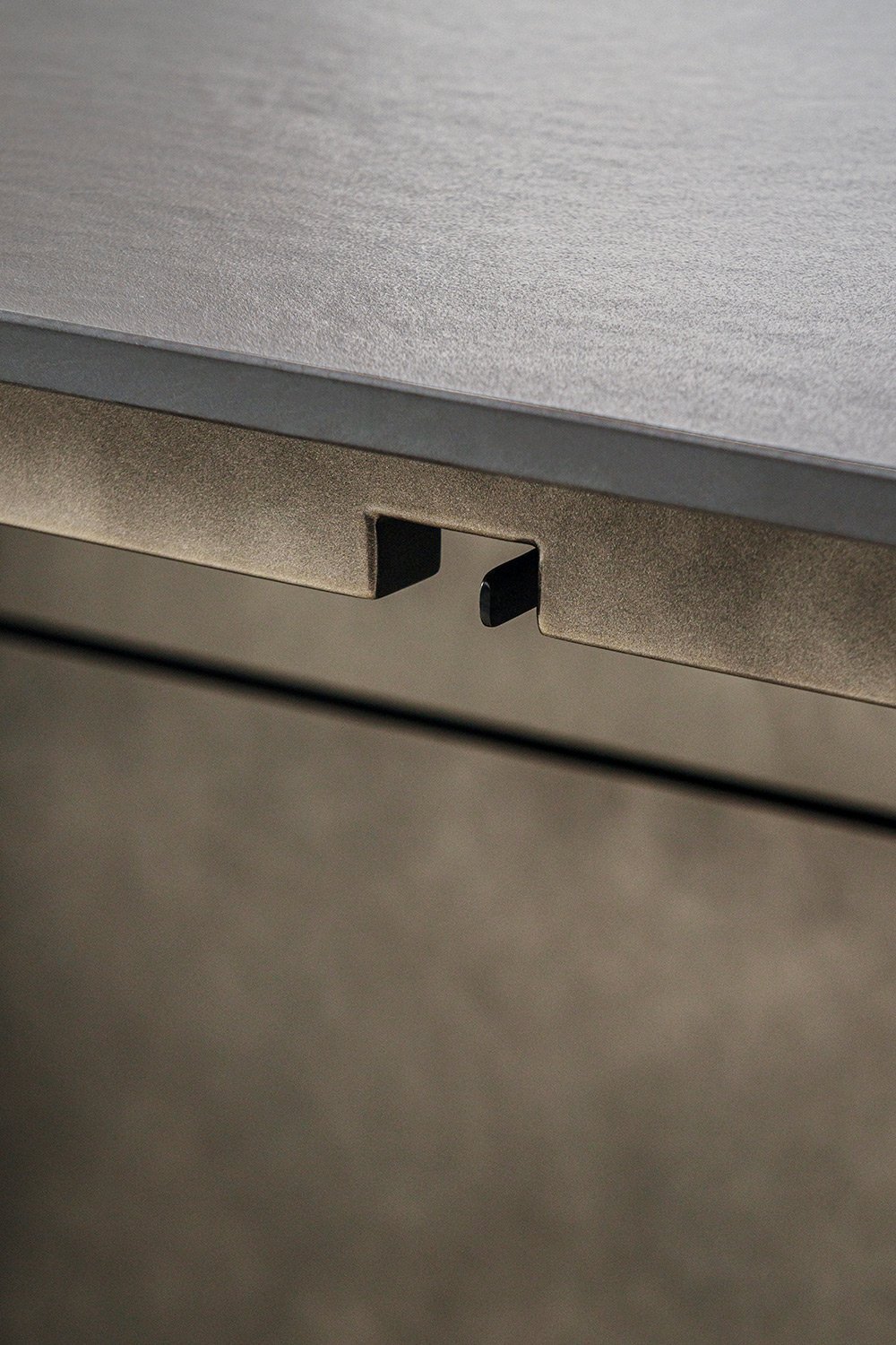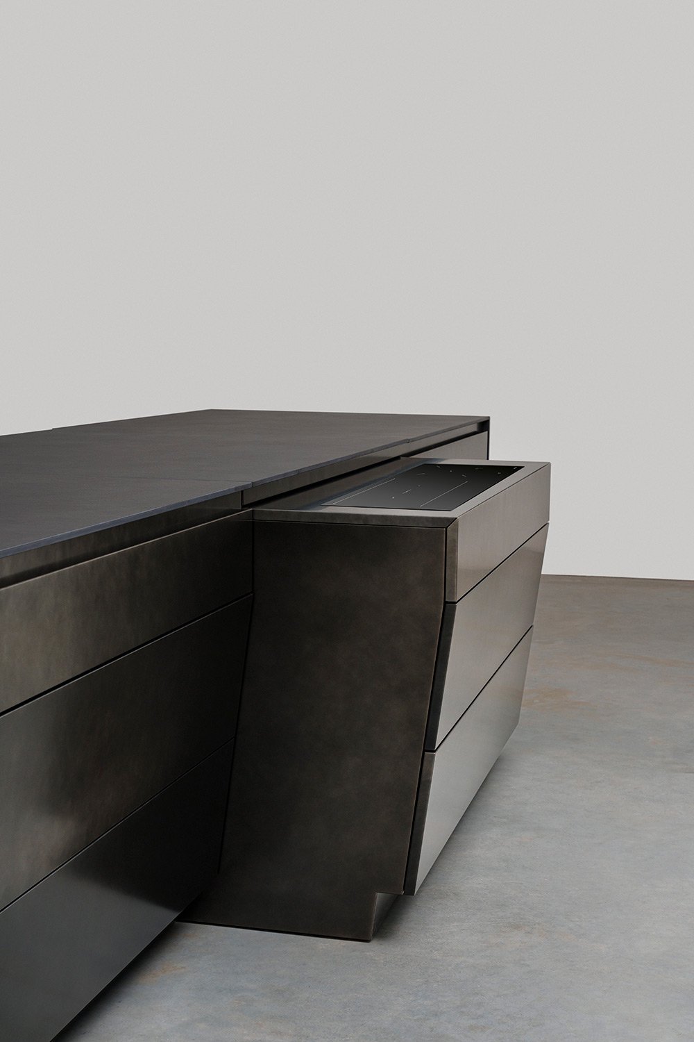 Поверхность в оттенке gunmetal и столешница из чёрного Dekton задают кухне строгий, технологичный стиль. Моторизованные ящики открываются мягко и бесшумно — никаких лишних усилий, всё работает точно и продуманно.