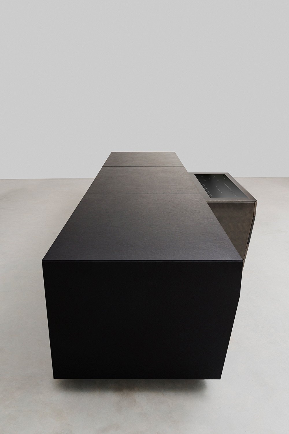 Центральный остров — сердце всей системы. Стоит сдвинуть его ядро, и перед вами открывается скрытая индукционная поверхность. Один плавный жест — и кухня превращается в зону для готовки, а противоположная сторона становится удобным местом для быстрых завтраков или общения с гостями. Всё сделано так, чтобы пространство легко подстраивалось под ваш ритм и привычки.