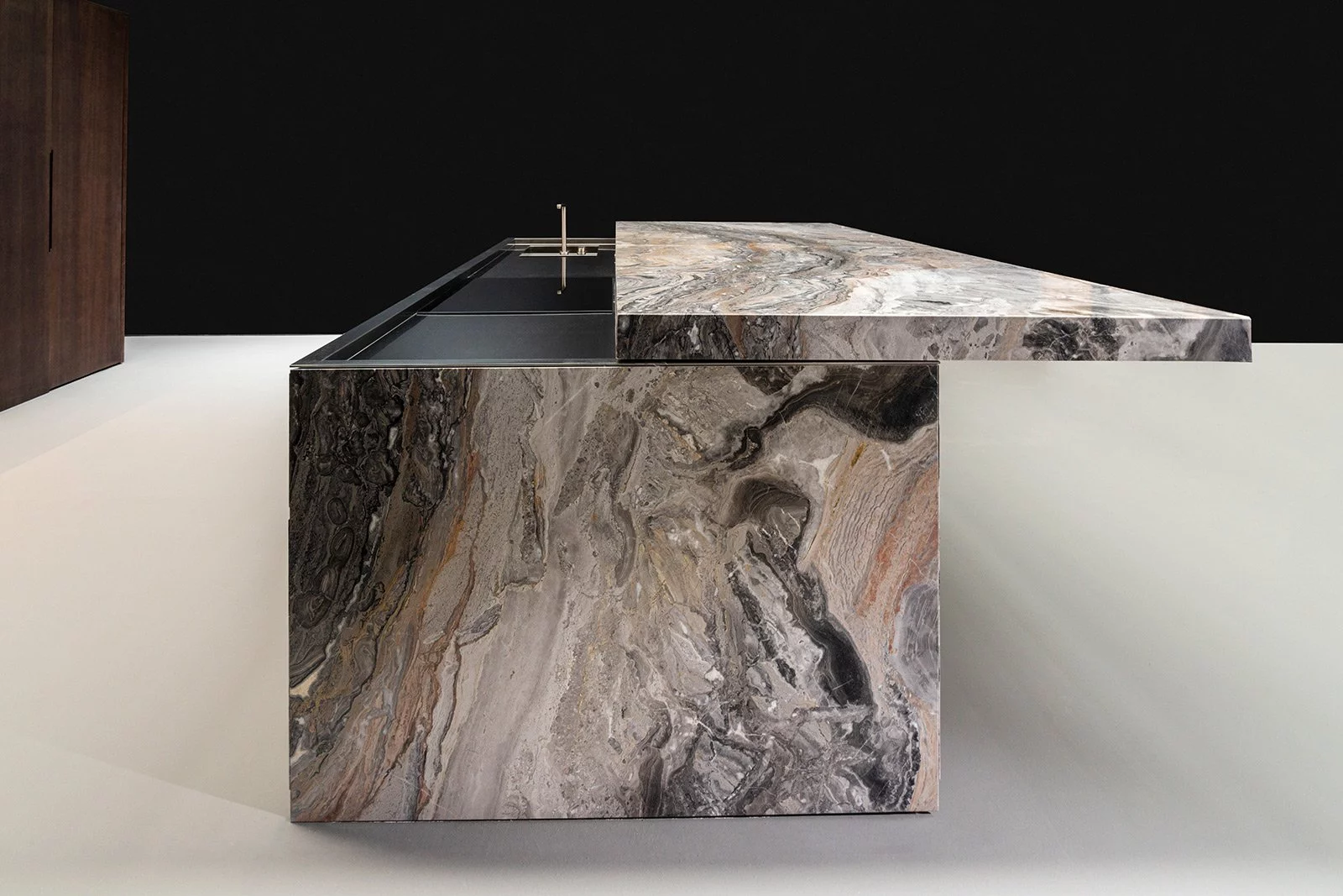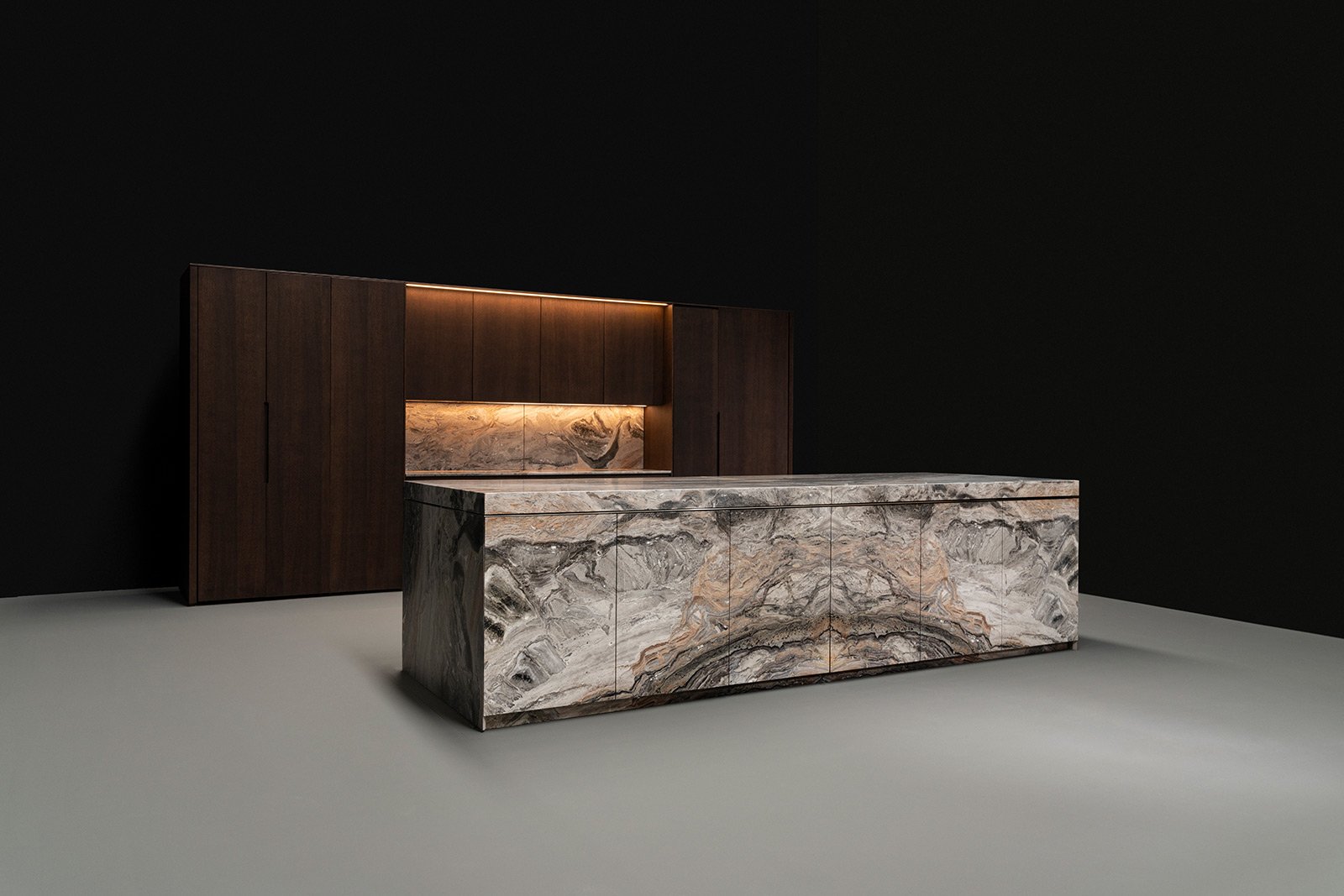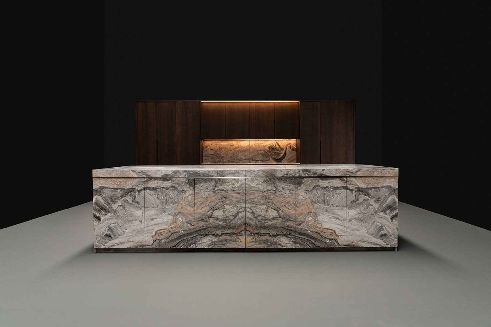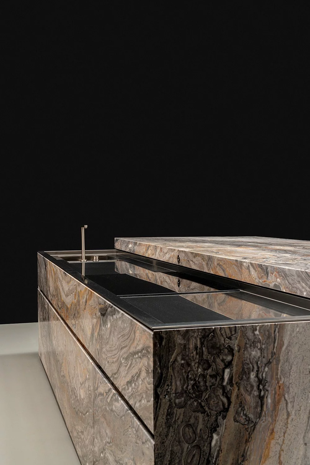 Главная роль здесь у монолитного острова из камня Grigio Orobico. Его рисунок напоминает природные потоки и создаёт сильный визуальный акцент — кухня выглядит цельной, уверенной и совремённой. Остров не только украшает пространство, но и работает как полноценный функциональный центр.