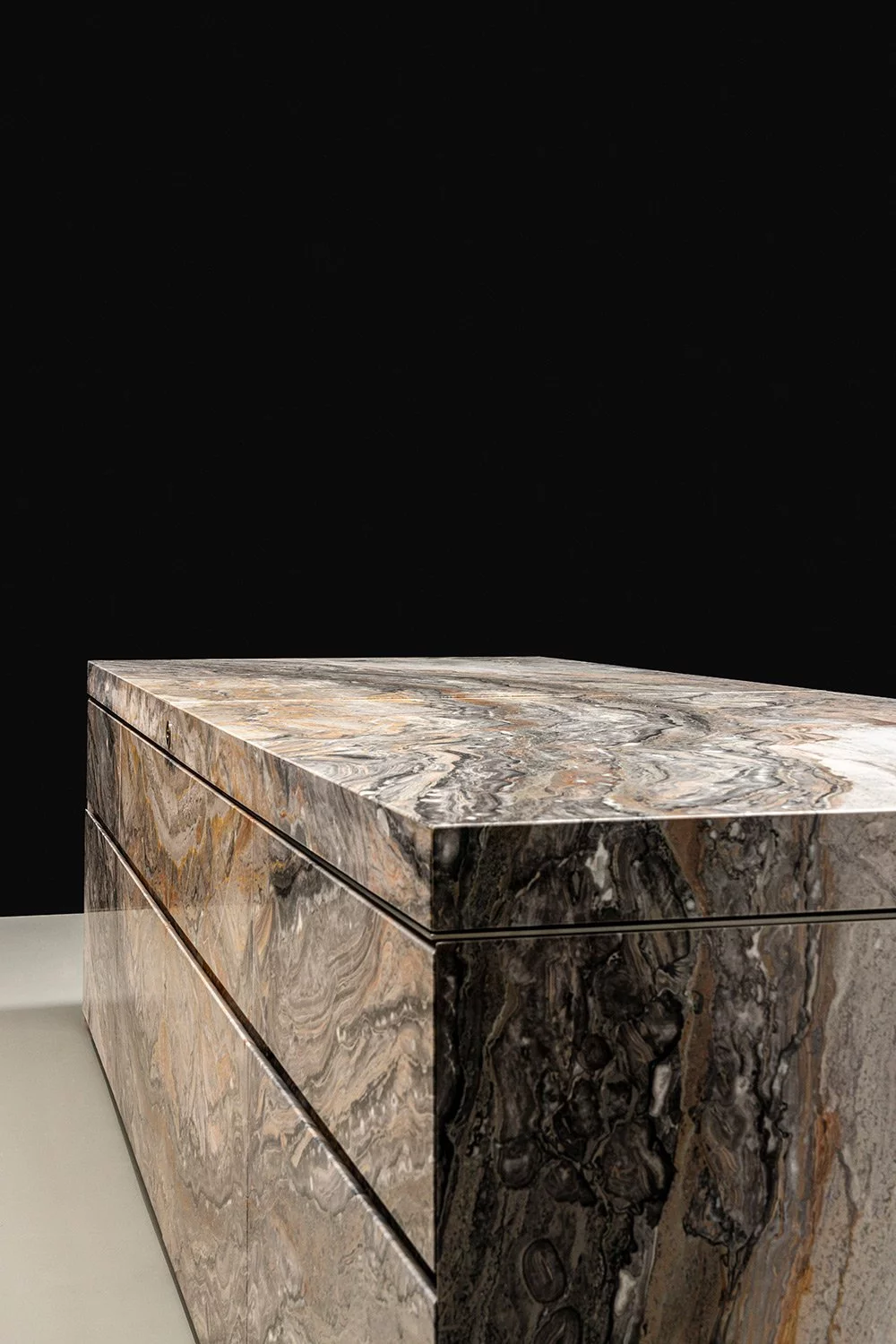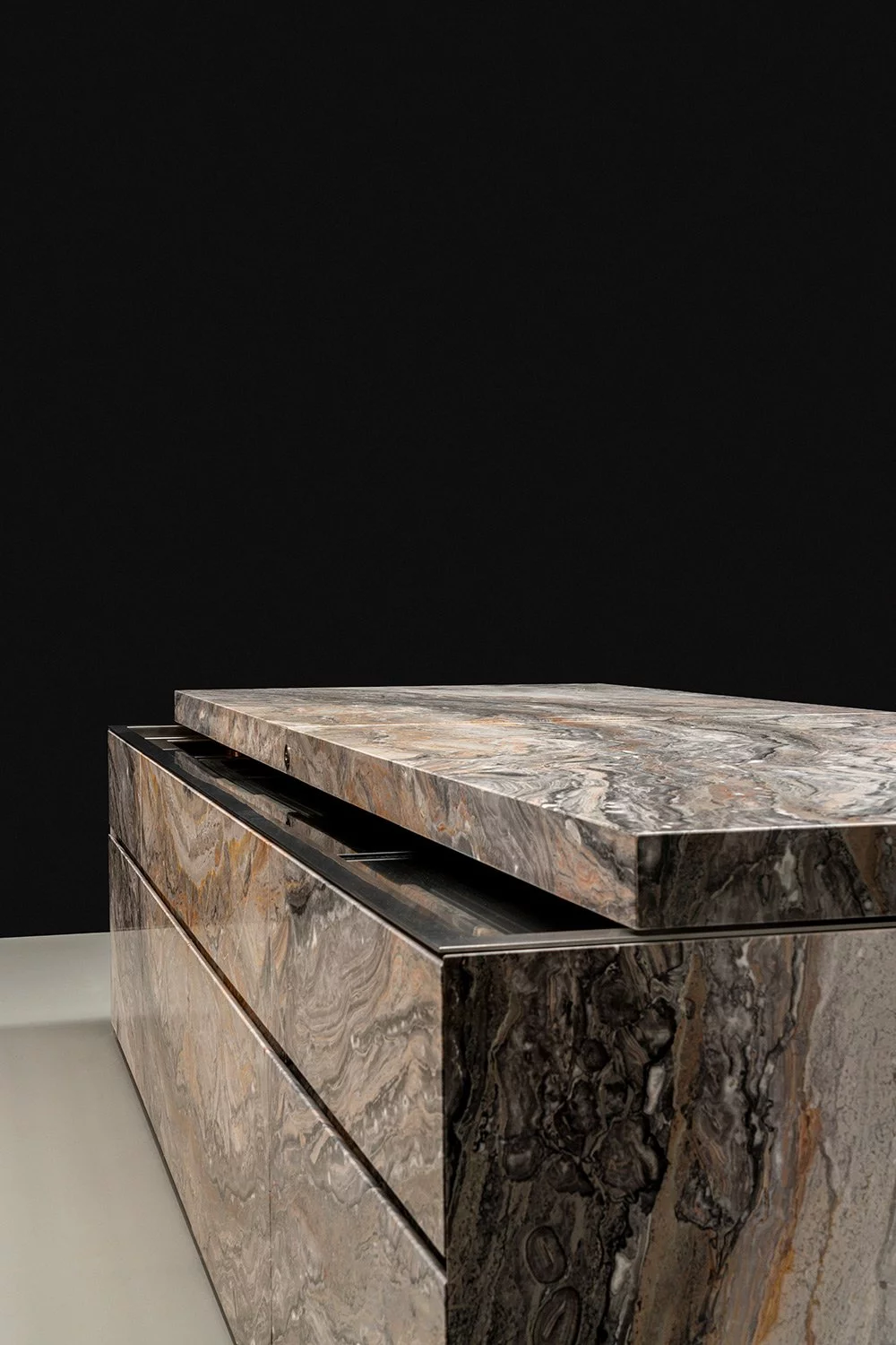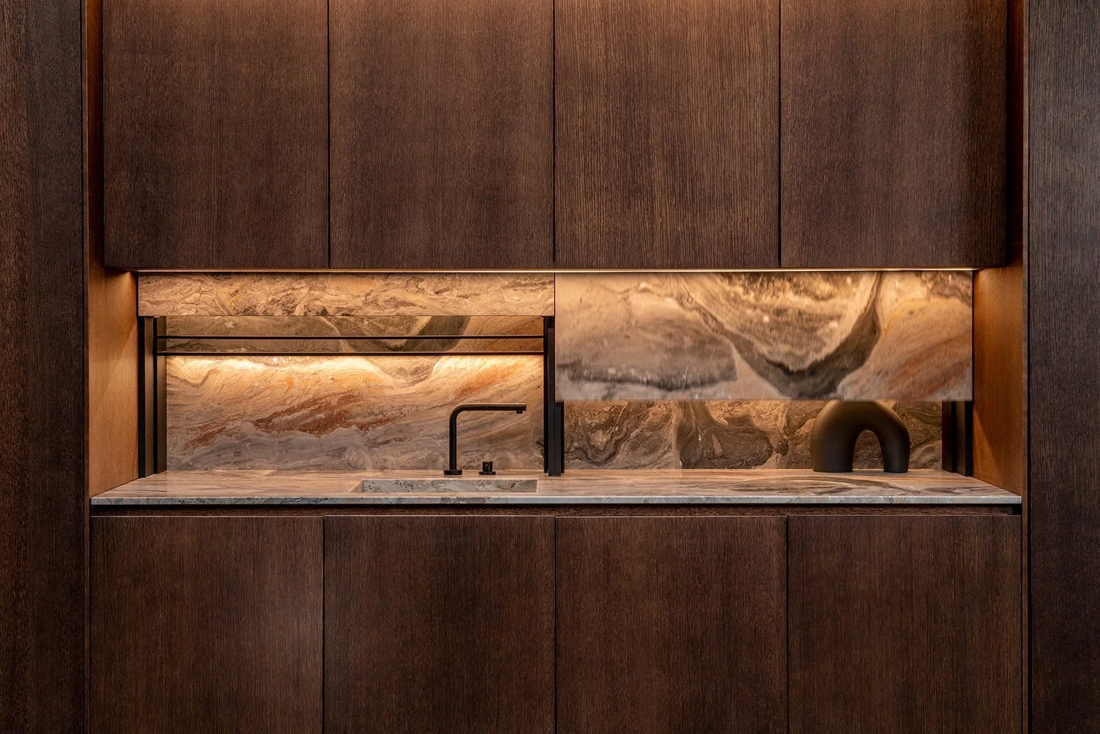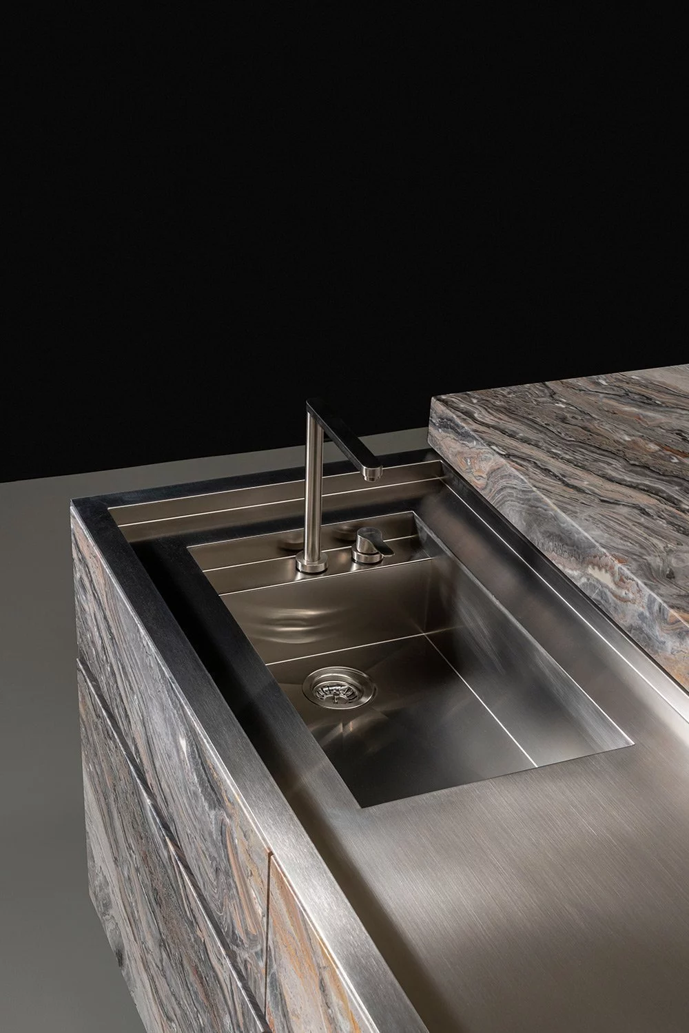 Главная роль здесь у монолитного острова из камня Grigio Orobico. Его рисунок напоминает природные потоки и создаёт сильный визуальный акцент — кухня выглядит цельной, уверенной и совремённой. Остров не только украшает пространство, но и работает как полноценный функциональный центр.