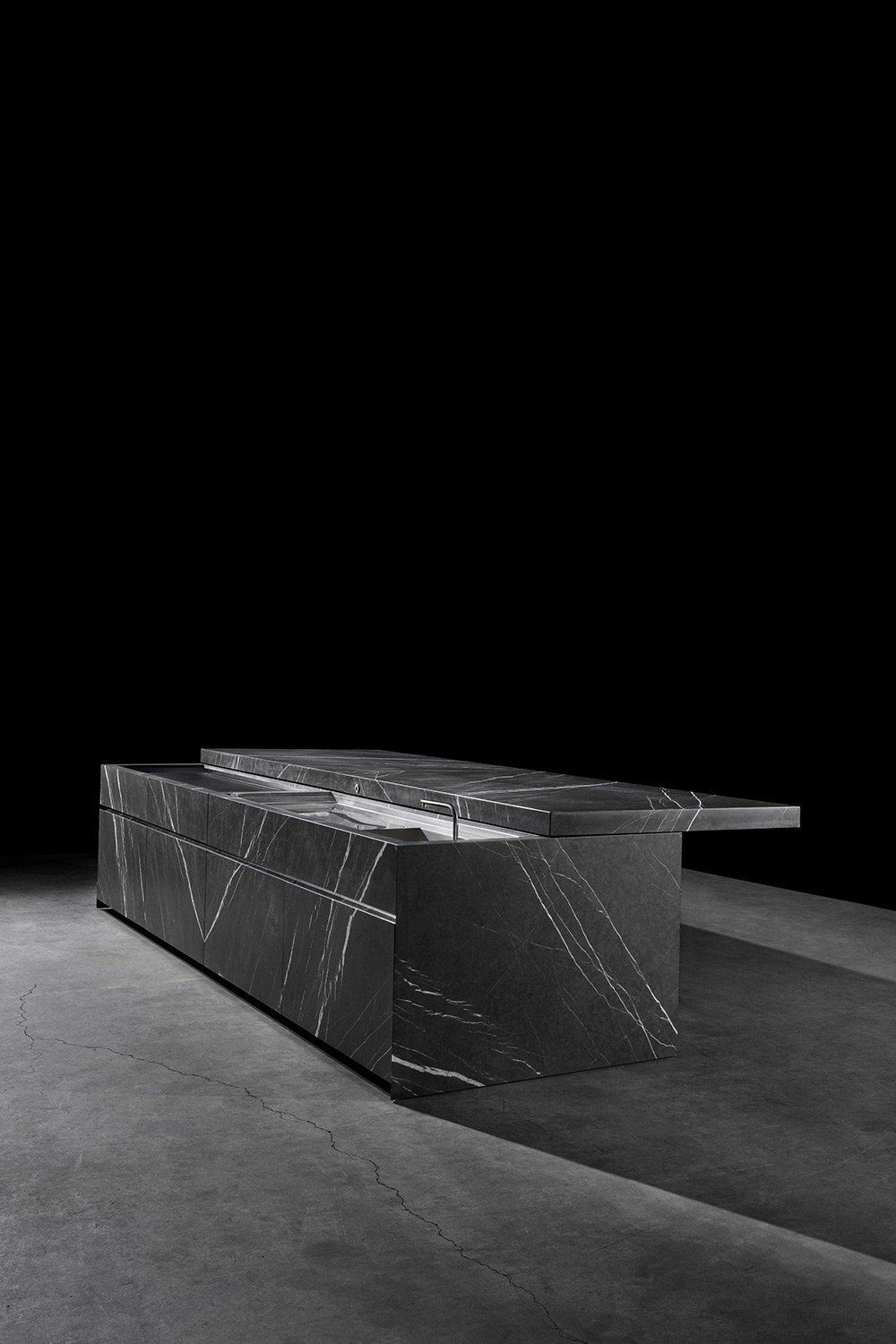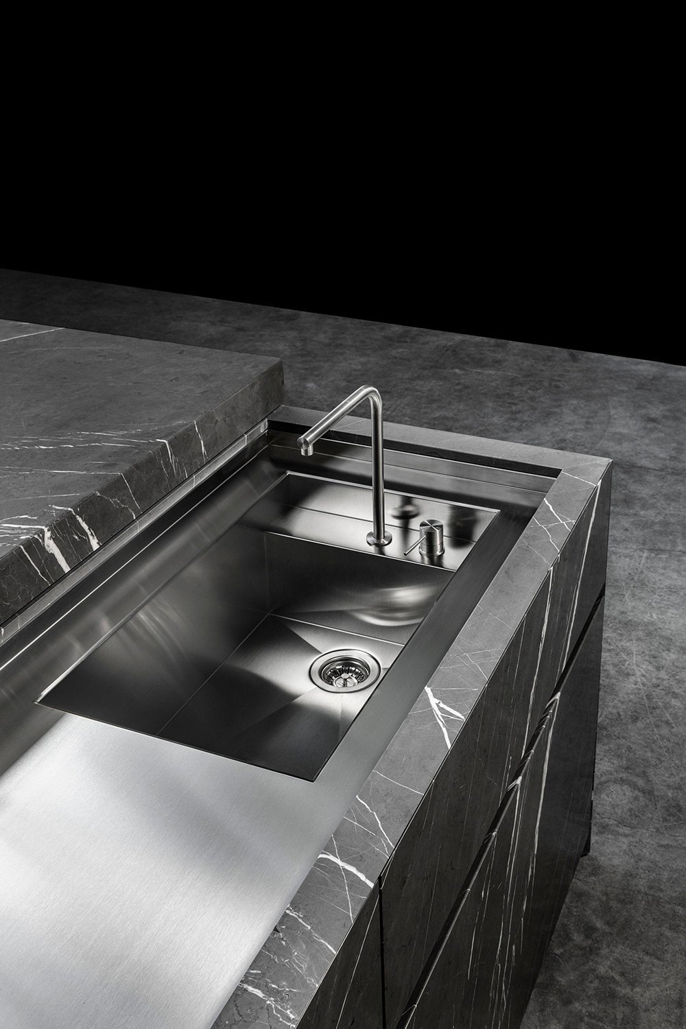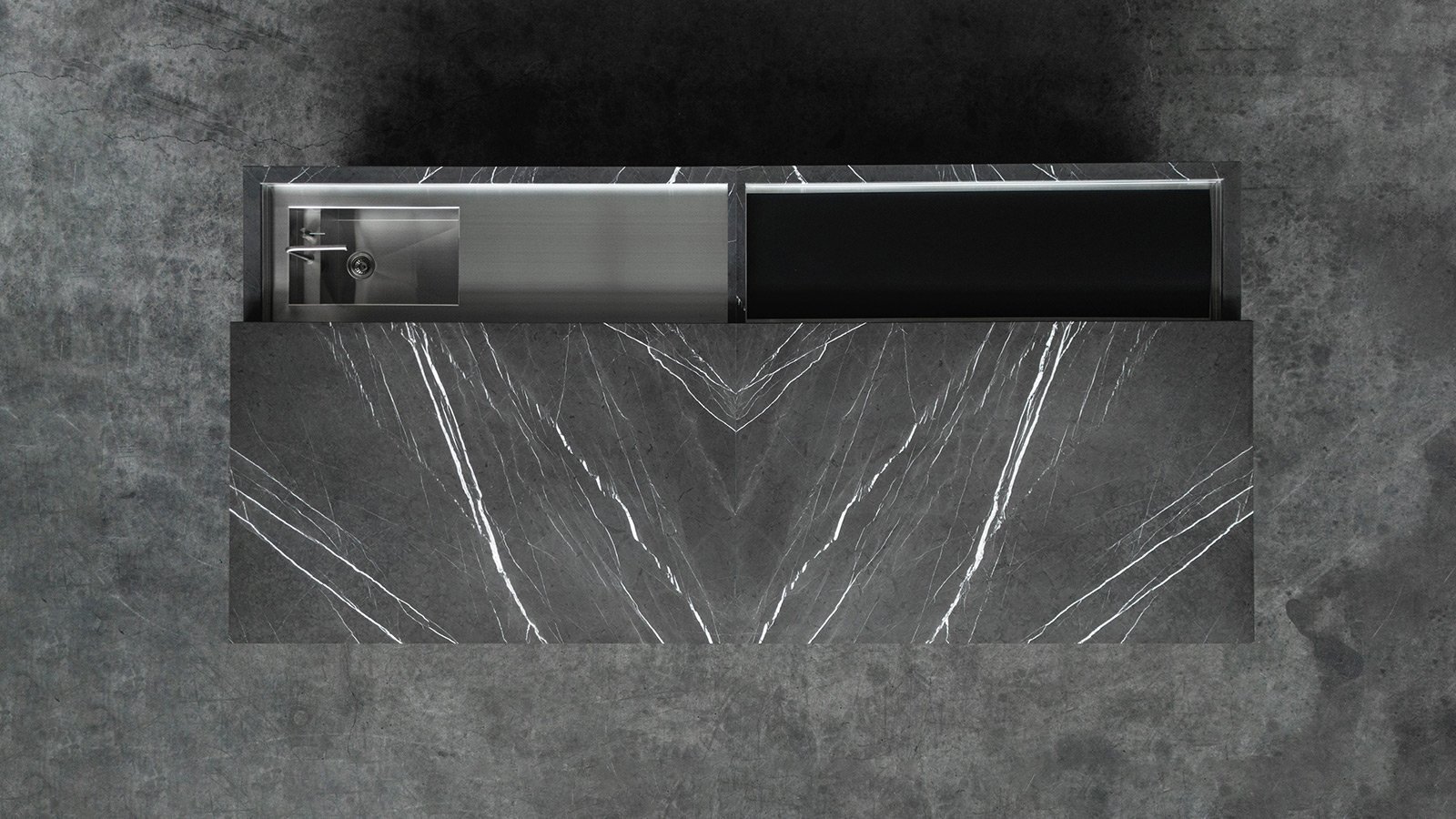 Внутри скрывается рабочая поверхность из нержавеющей стали с удобной мойкой. Можно готовить прямо на металле, не боясь испачкать камень - всё продумано для реальной, ежедневной кухни, а не просто для красивой картинки.