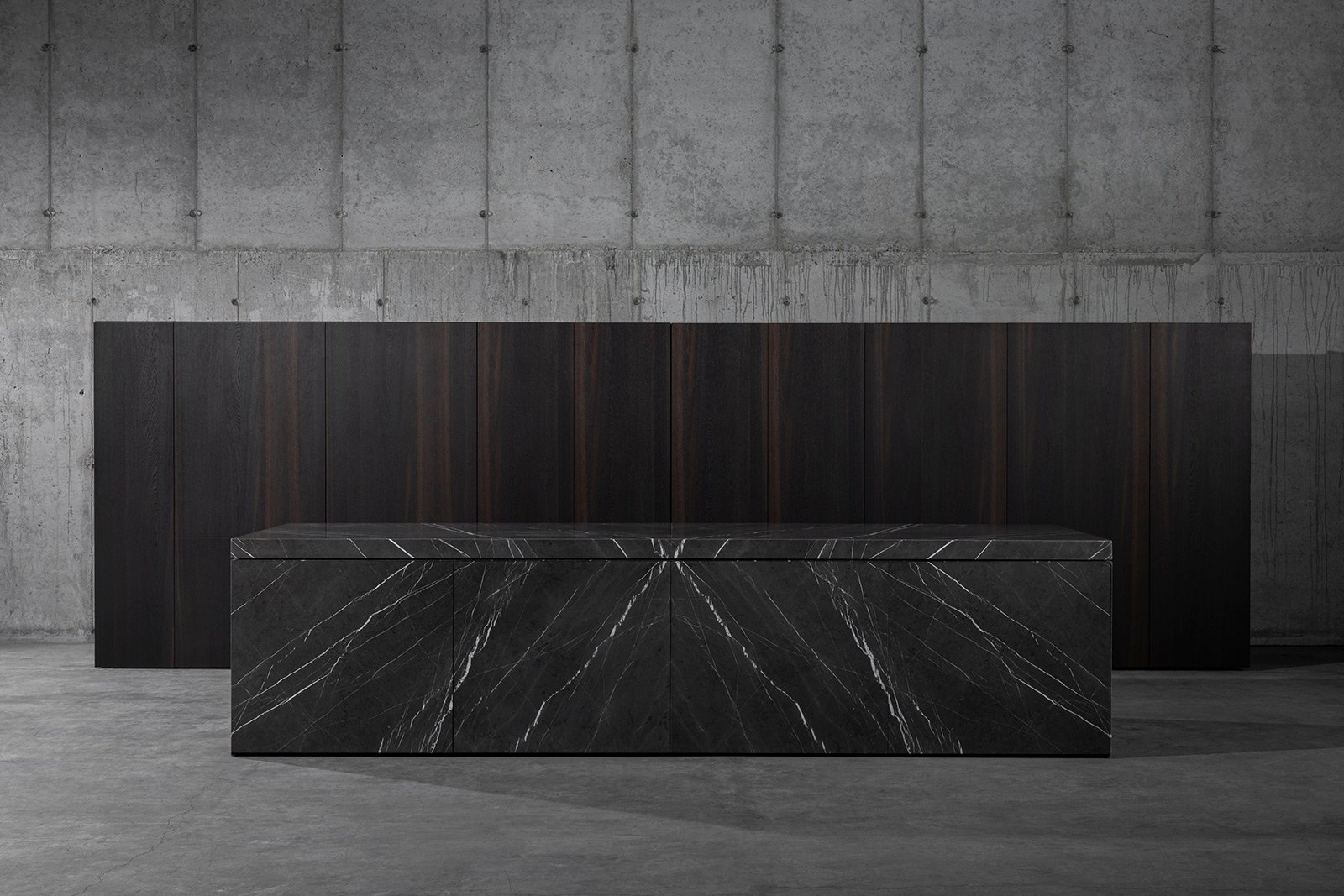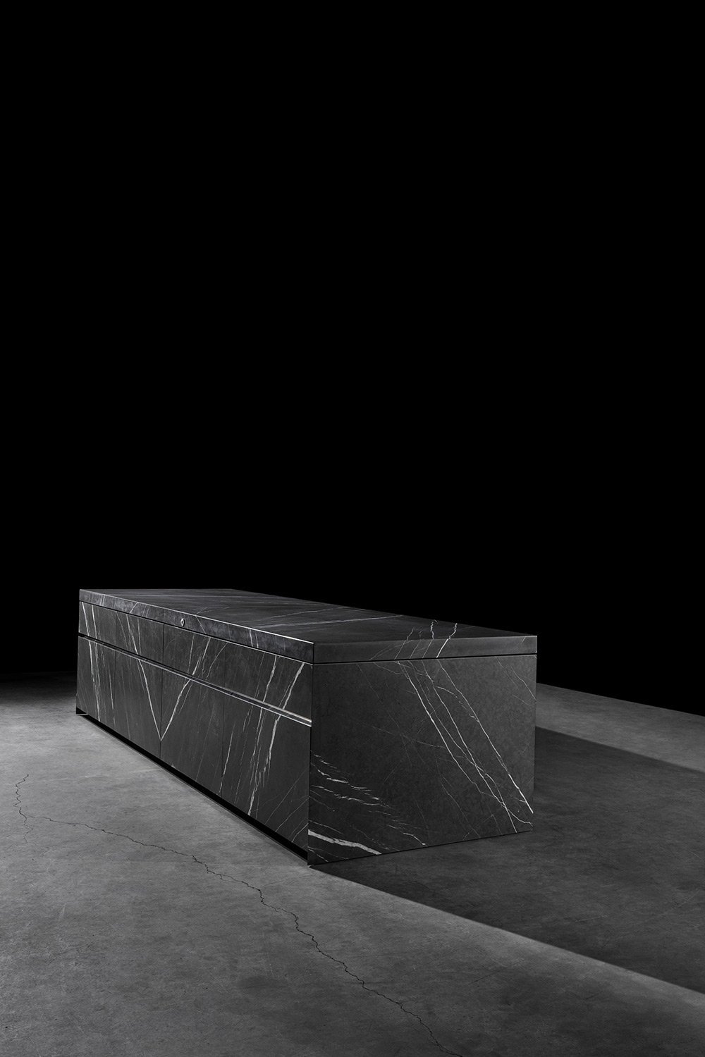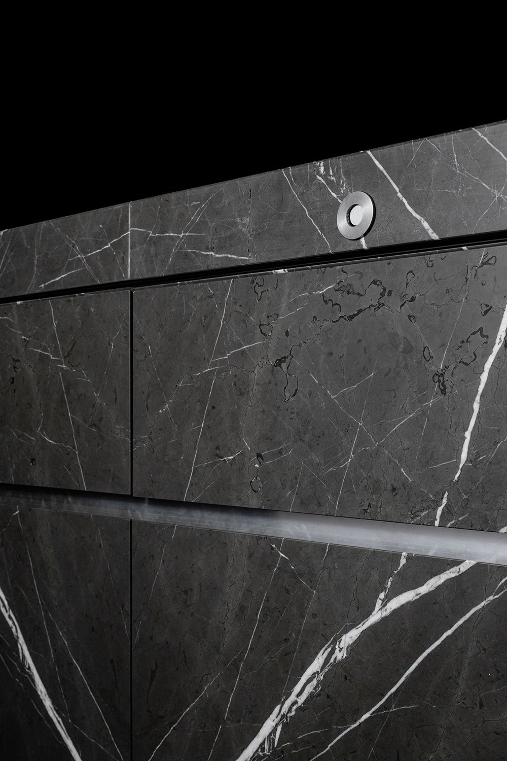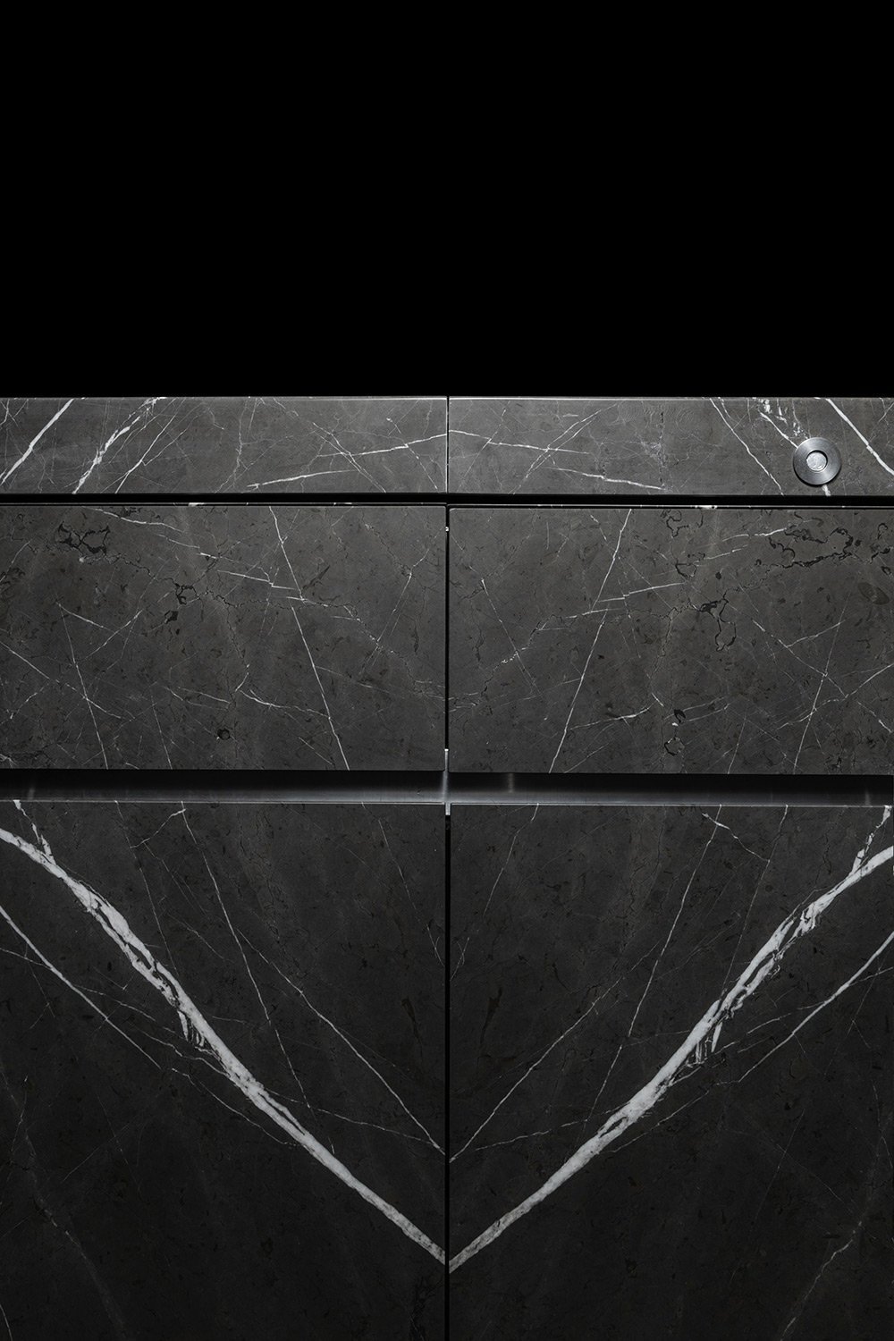 Внутри скрывается рабочая поверхность из нержавеющей стали с удобной мойкой. Можно готовить прямо на металле, не боясь испачкать камень - всё продумано для реальной, ежедневной кухни, а не просто для красивой картинки.