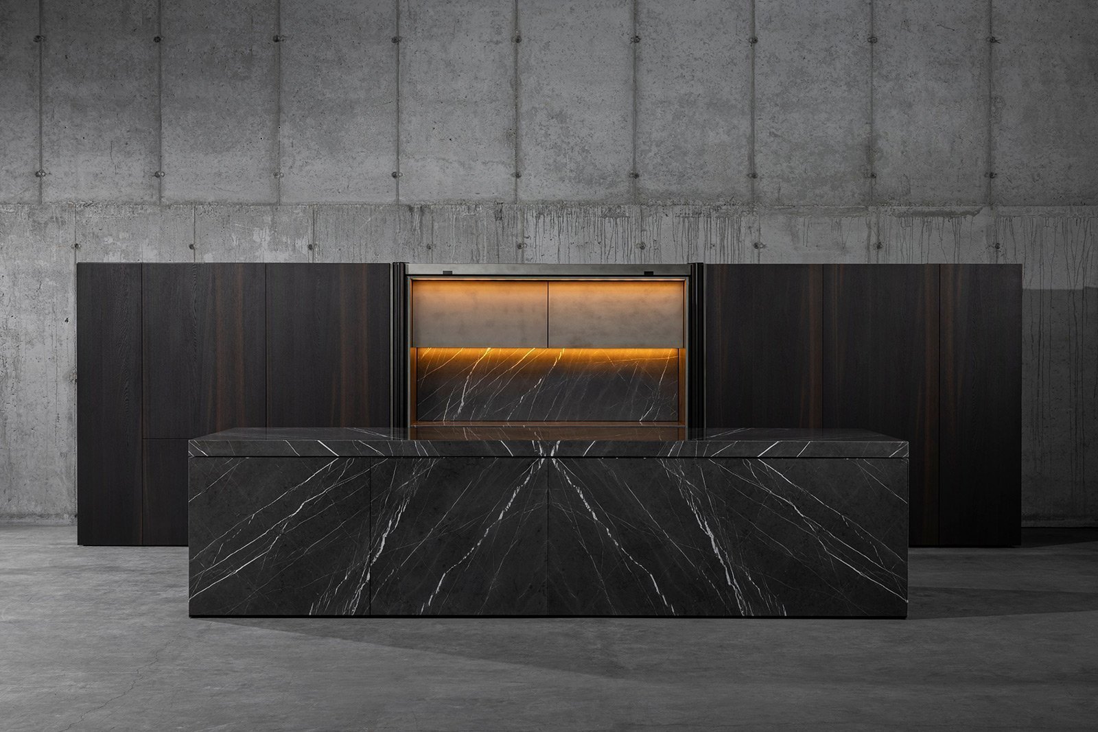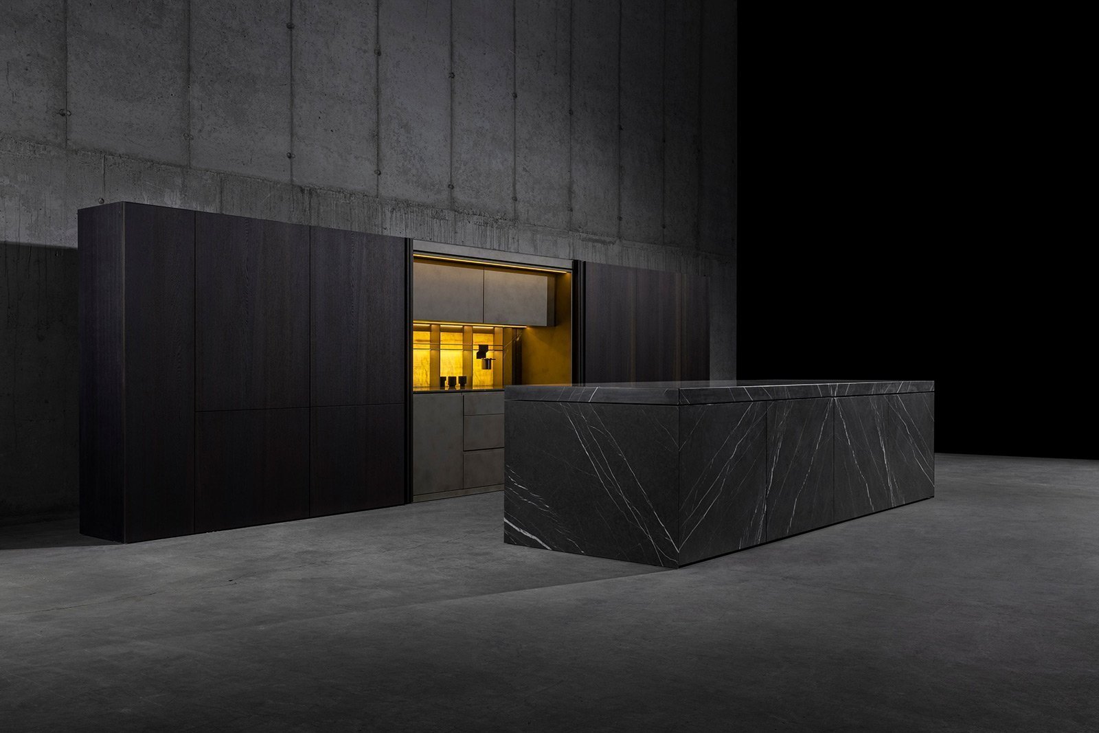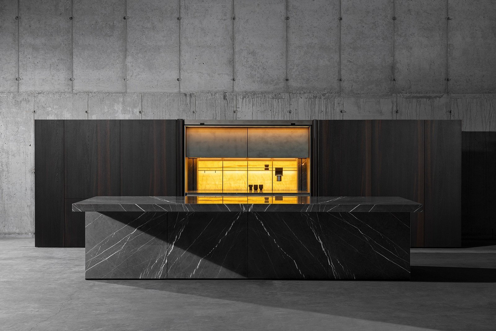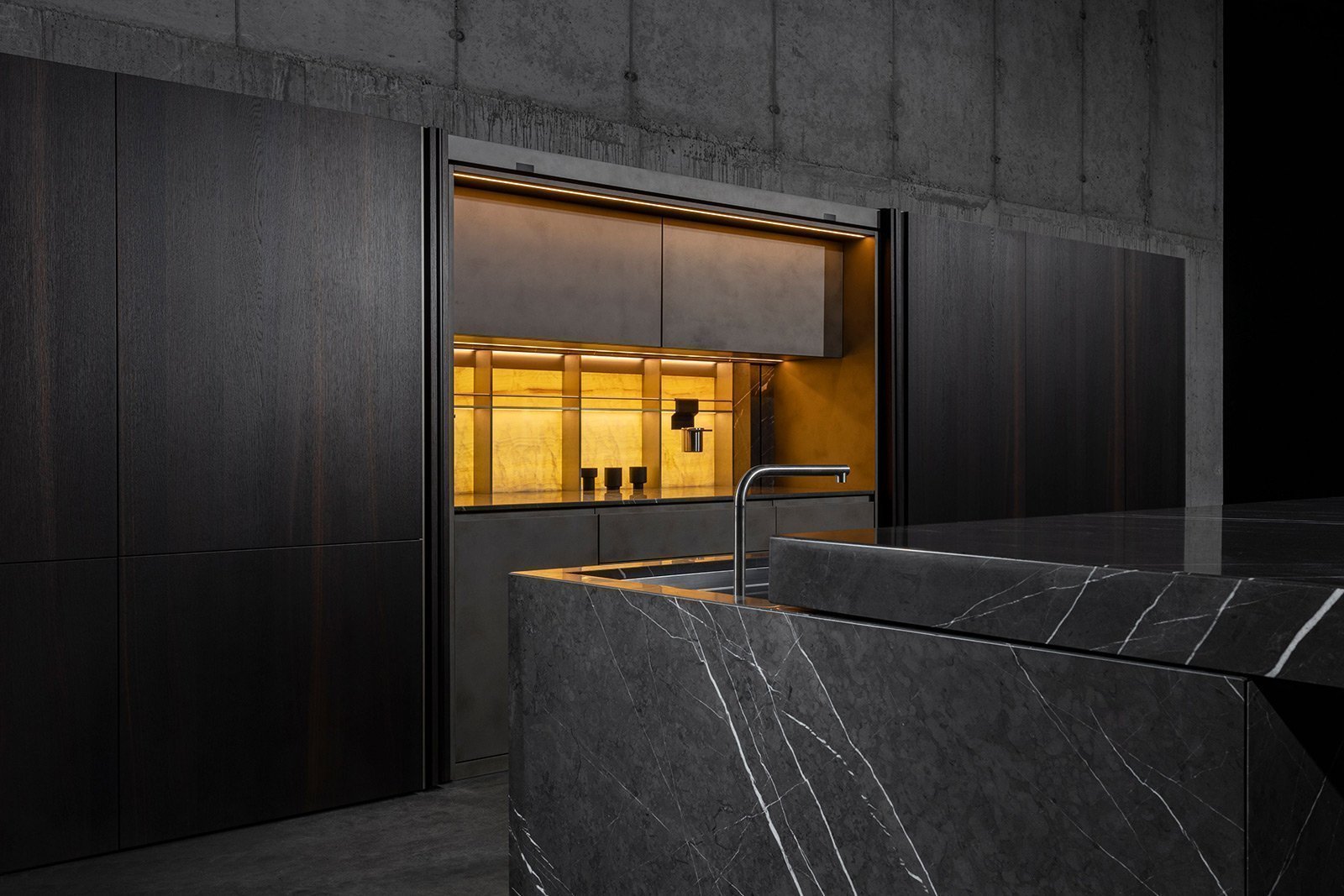 Главный акцент - массивный 4-метровый остров из серого камня. Он выглядит солидно, но не перегружает интерьер, а его фактура добавляет глубины и динамики. Раздвижная столешница - самая крупная из когда-либо созданных - превращает остров то в просторную рабочую поверхность, то в полноценную зону для сервировки. Механизм движения плавный и безопасный, поэтому конструкция фиксируется уверенно и надёжно.