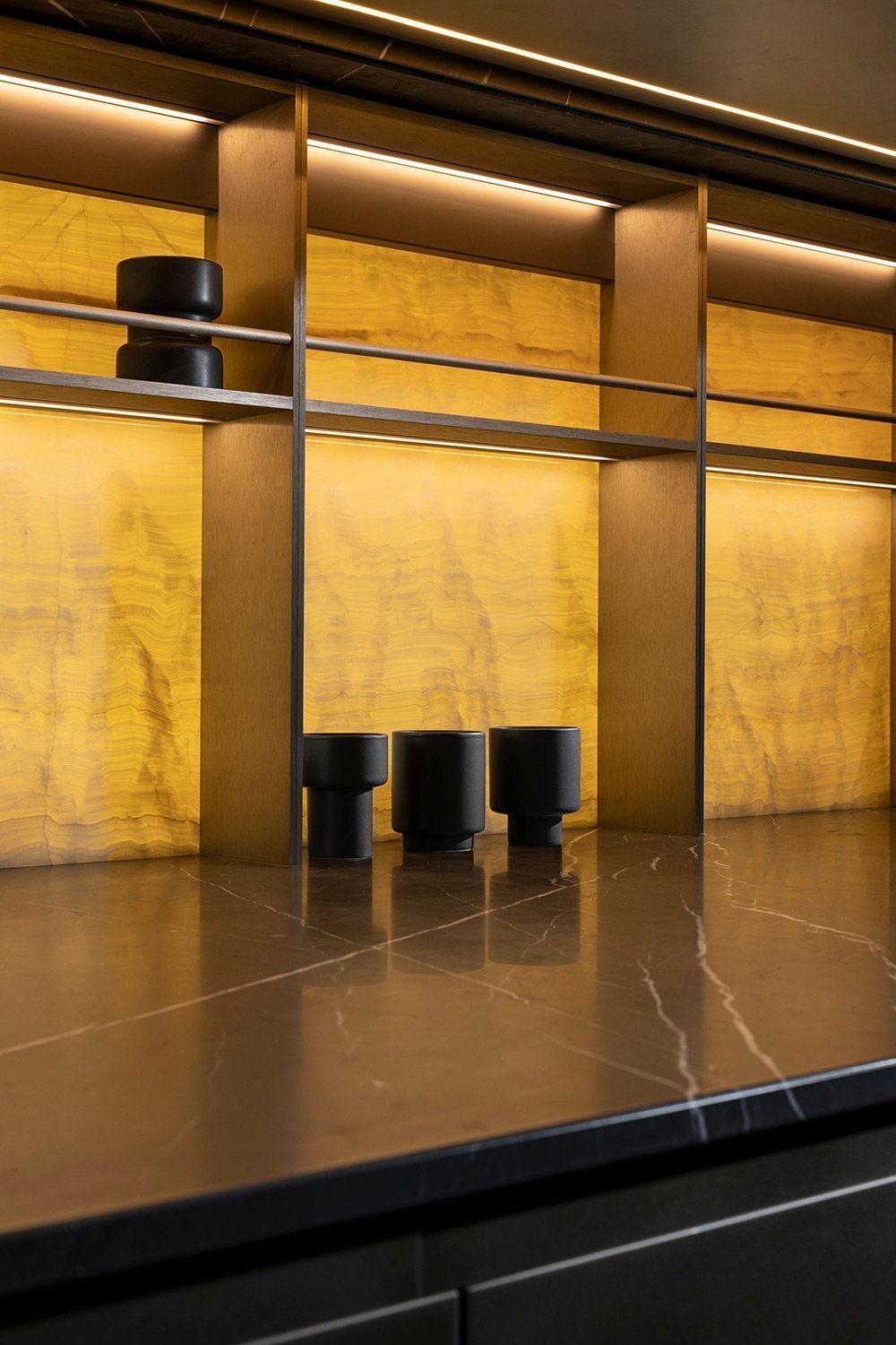 Техника аккуратно спрятана за дверцами из термообработанного дуба, которые добавляют уют и естественность. А моторизованная задняя панель с подсвеченным ониксом делает кухню центром внимания - эффектно и функционально.