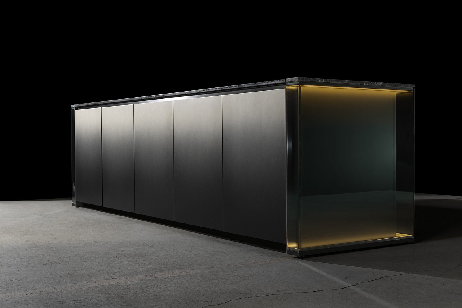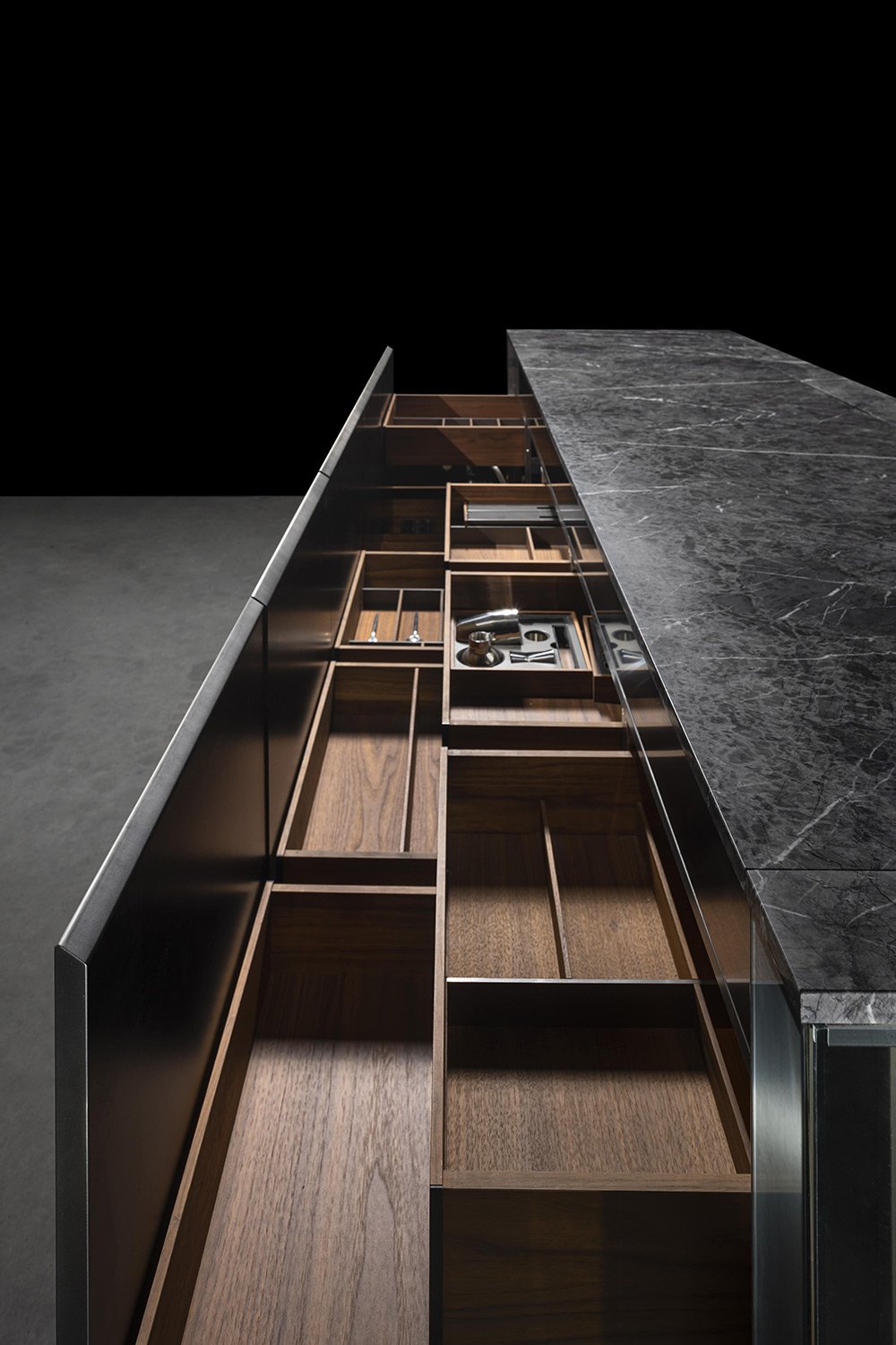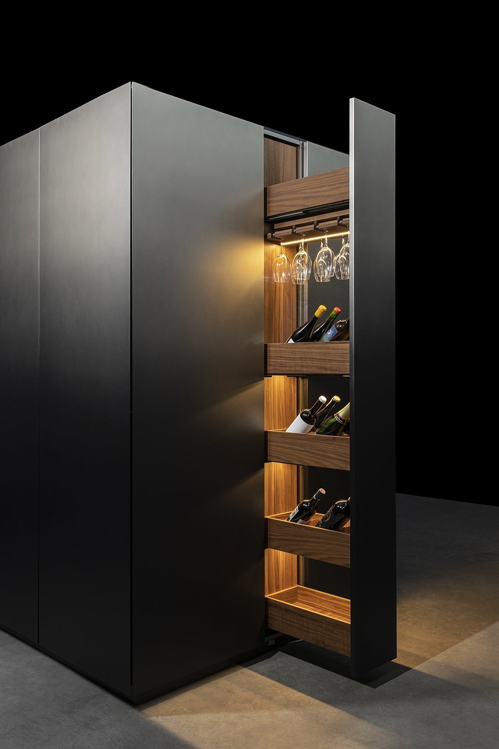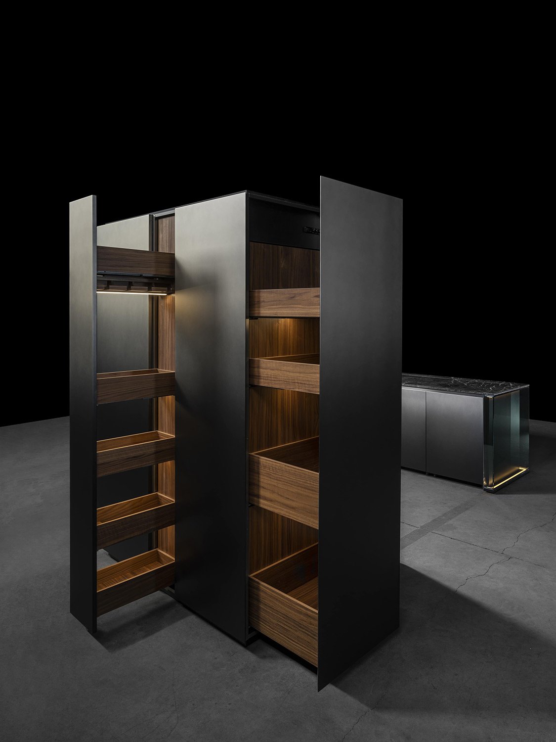 С первого взгляда NU притягивает вниманием к деталям: фасады переливаются, словно драгоценные камни, а мягкая прозрачность материалов делает пространство лёгким и насыщенным одновременно. Когда выдвигаются ящики, внутри загорается мягкий свет, подчёркивающий тёплый оттенок натурального ореха - мелочь, которая сразу ощущается как забота о пользователе.