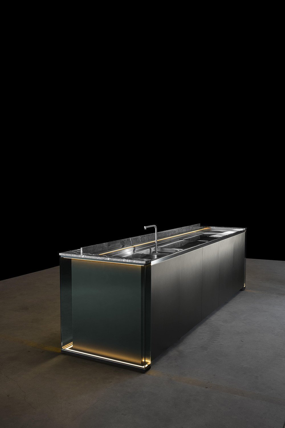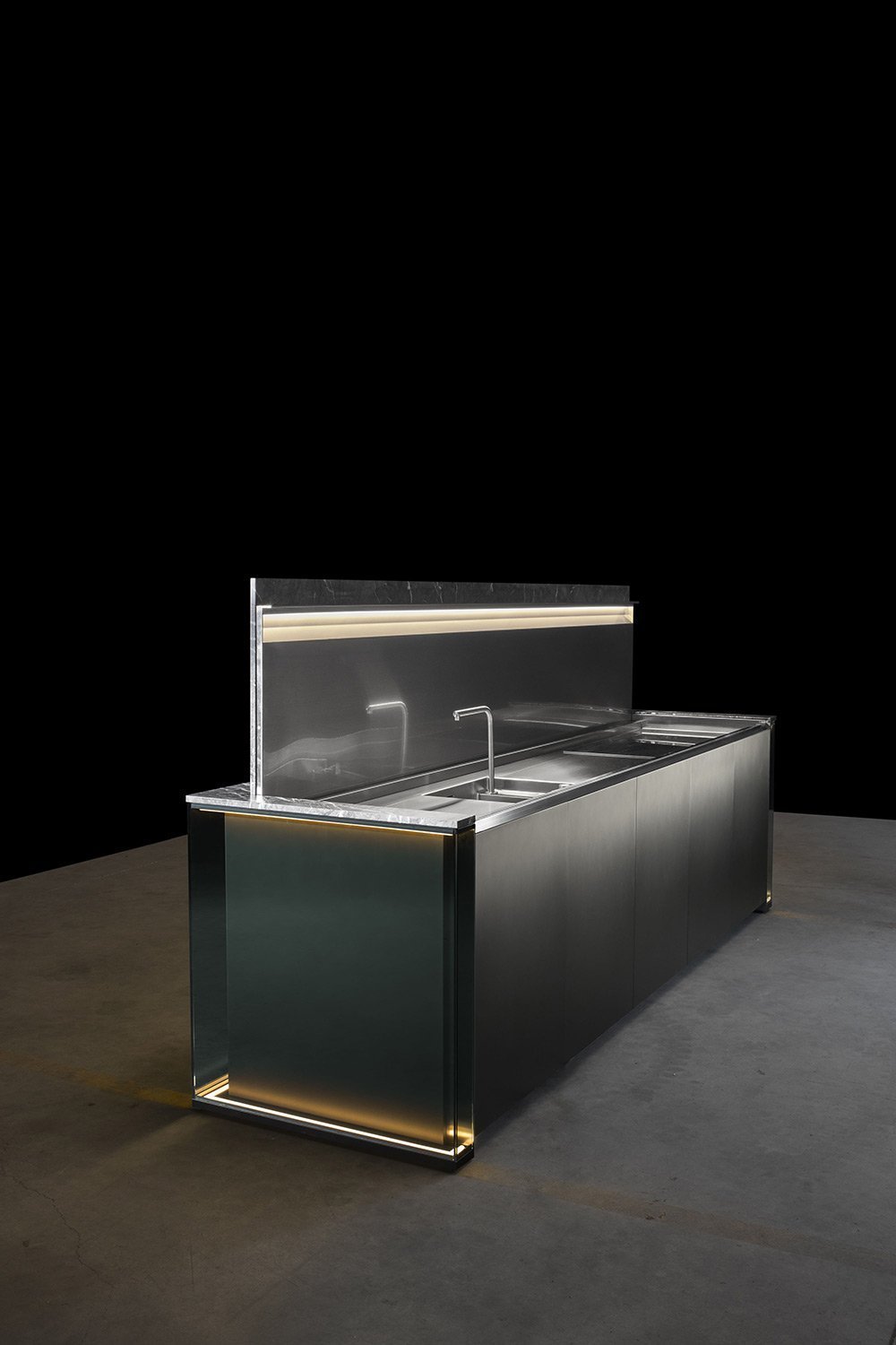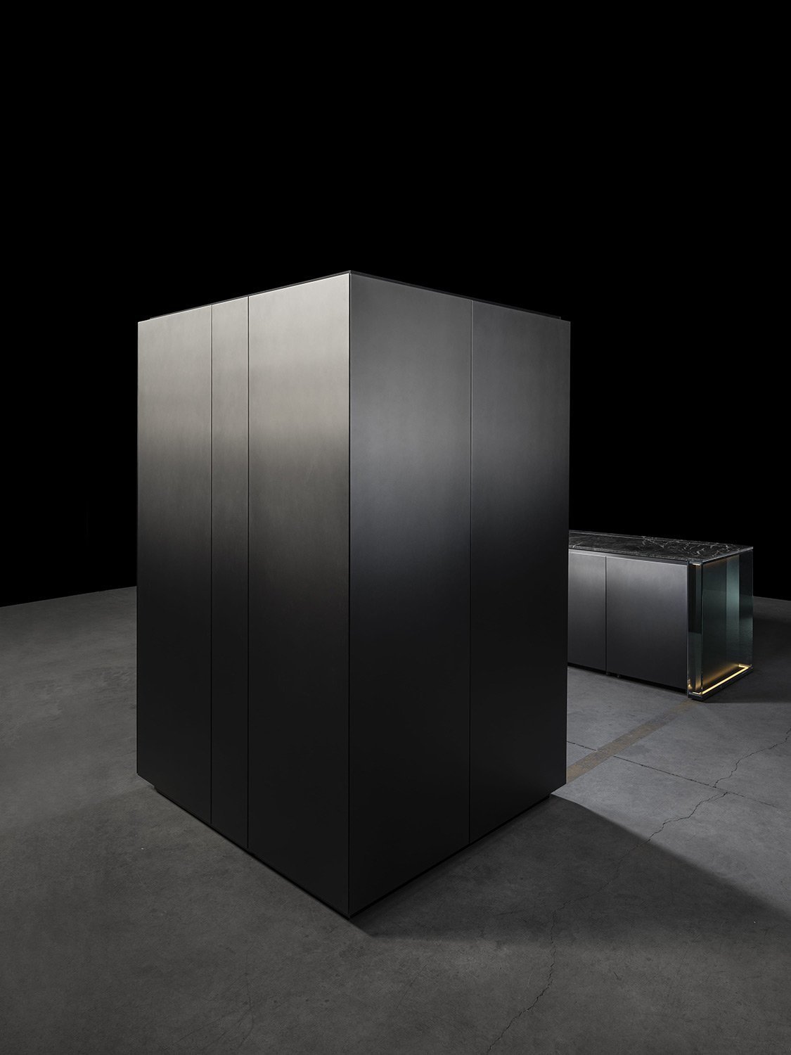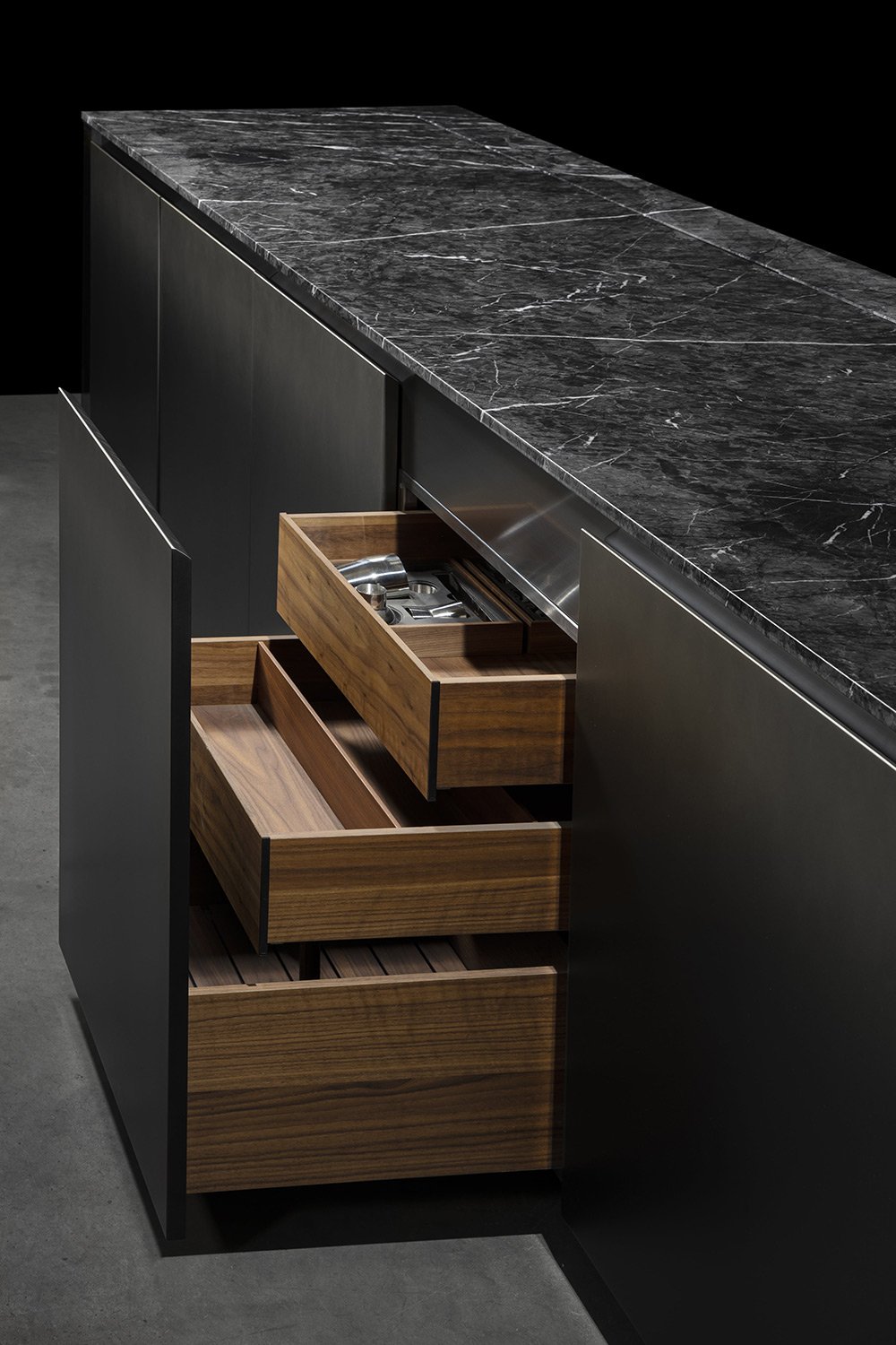 С первого взгляда NU притягивает вниманием к деталям: фасады переливаются, словно драгоценные камни, а мягкая прозрачность материалов делает пространство лёгким и насыщенным одновременно. Когда выдвигаются ящики, внутри загорается мягкий свет, подчёркивающий тёплый оттенок натурального ореха - мелочь, которая сразу ощущается как забота о пользователе.