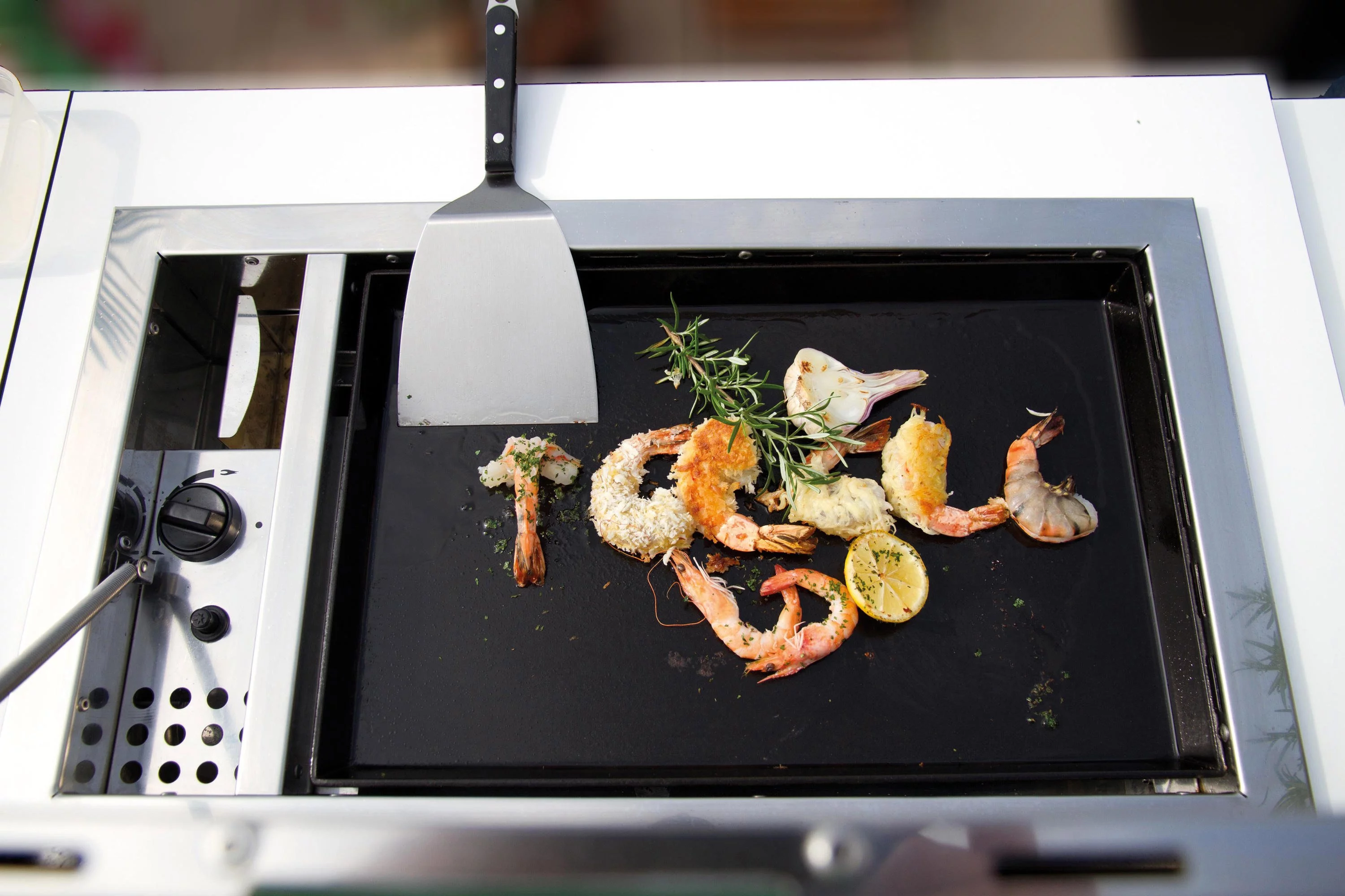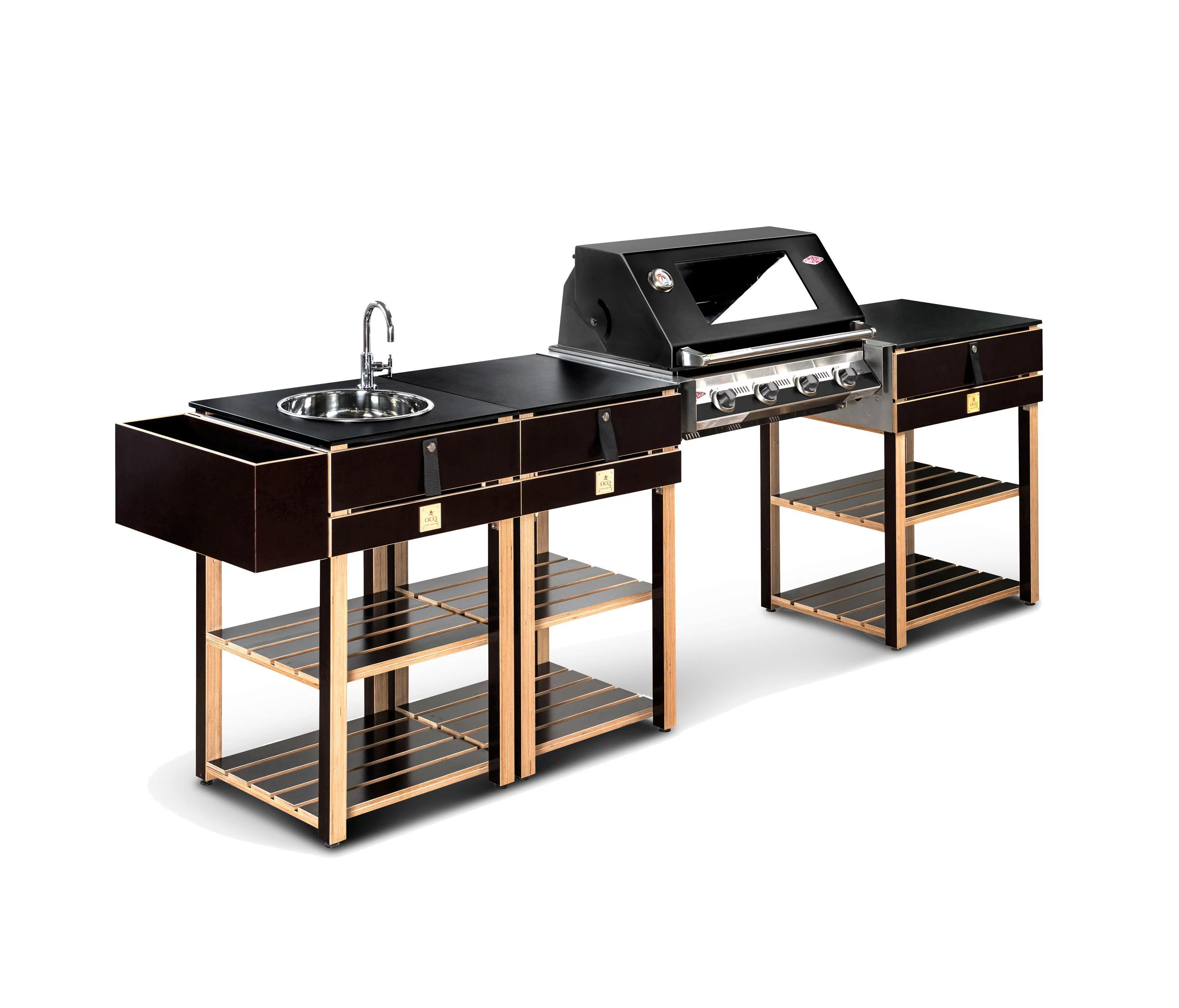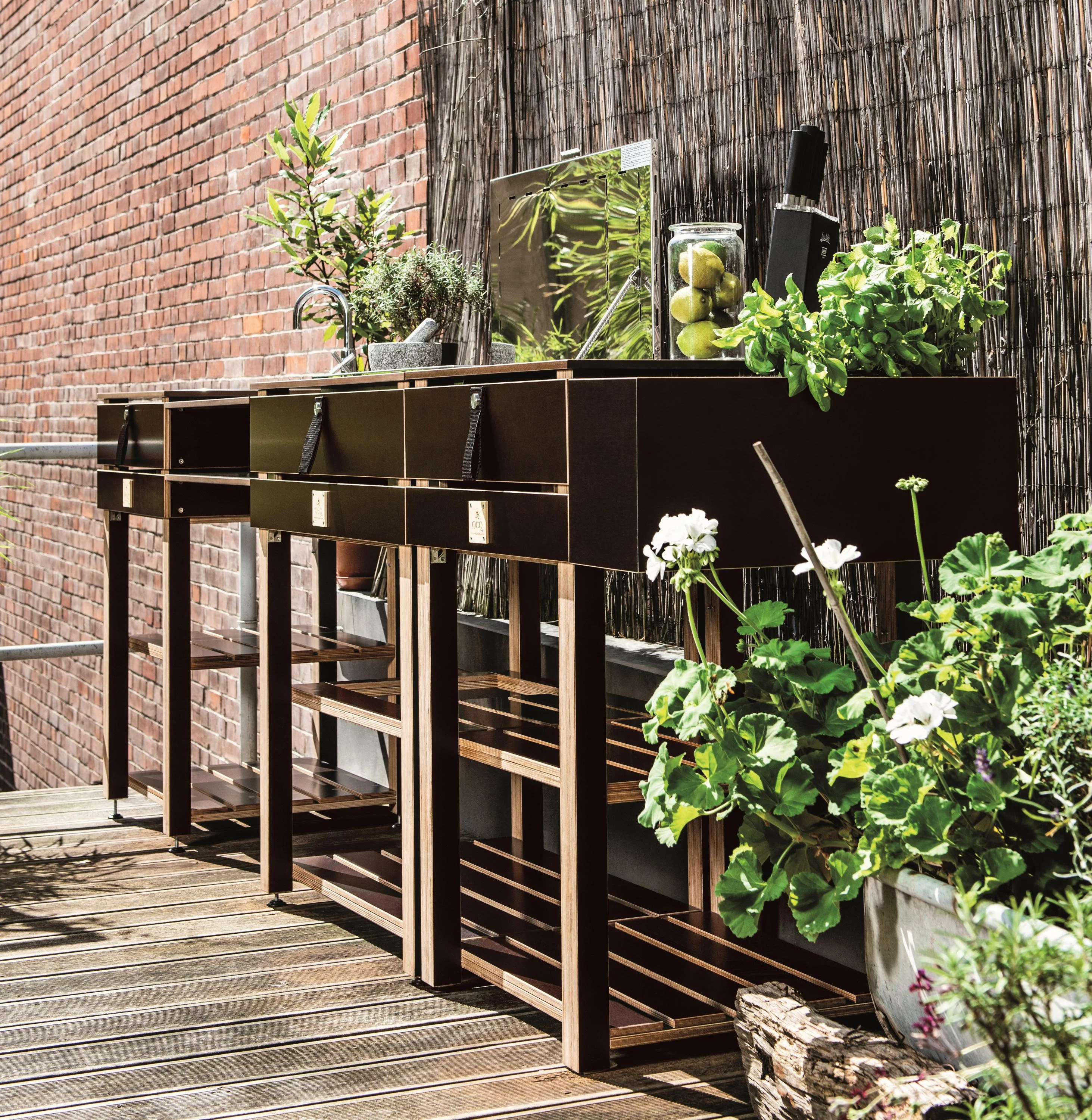 Элегантная уличная кухня Modular Wood от фабрики OCQ. В основе кухни лежат легкие открытые модули с встроенной полкой и выдвижным ящиком. Богатое оснащение аксессуарами и техникой: мойка, смеситель, рабочая зона, гриль, планч, тепан-яки, выдвижные ящики, навесными модули под хранение, функциональные открытые полки, декоративные защитные кожухи, которые закрывают от посторонних глаз разводку труб, газовый баллон и т.д. Каждый модуль устанавливается на регулируемые выдвижные ножки, которые позволяют нивелировать неровность поверхности и защитить от затопления водой. Каркас, ящики и столешница выполнены из материала HPL, он не подвержен воздействию осадков и перепадов температуры. Более 24 цветов. Производство: Германия