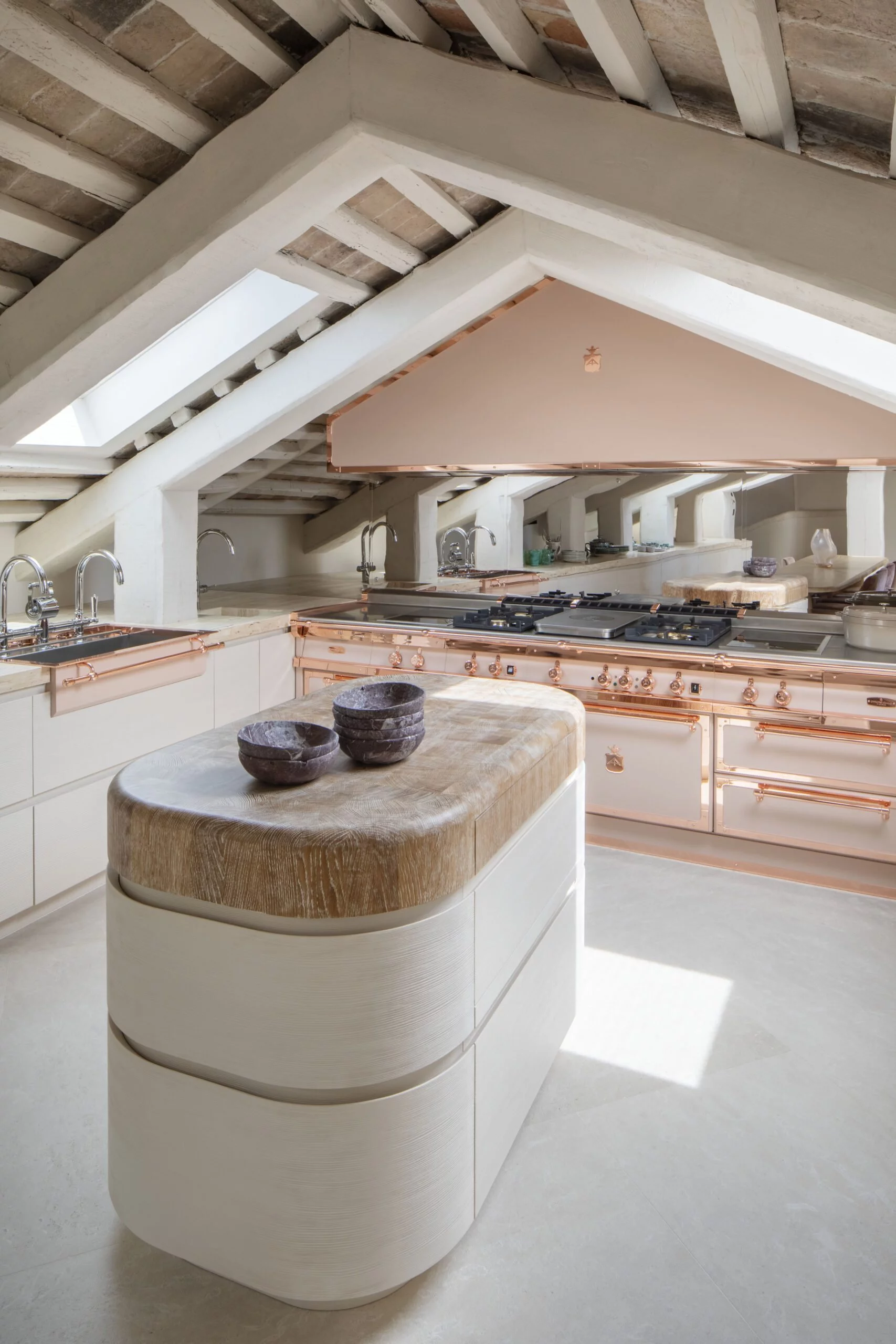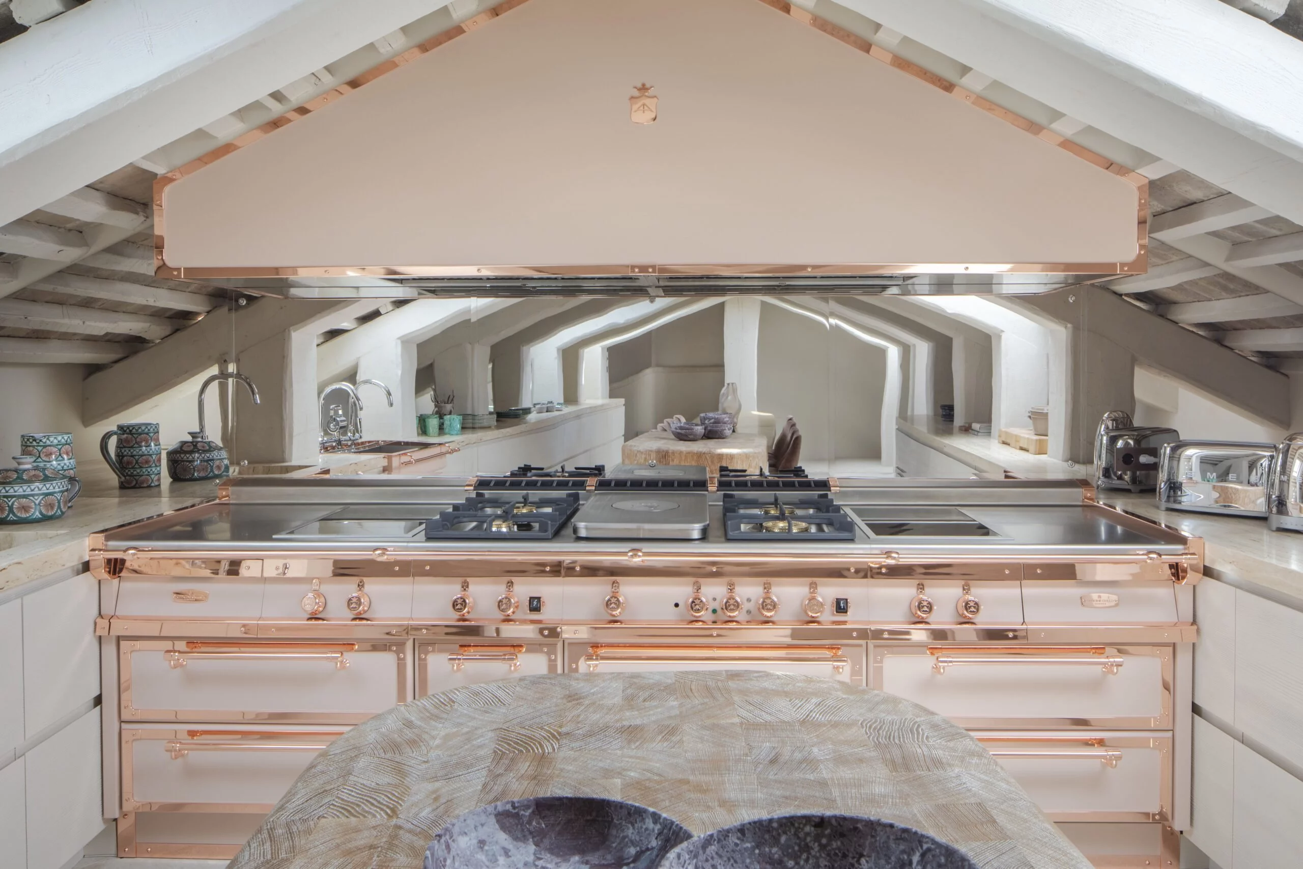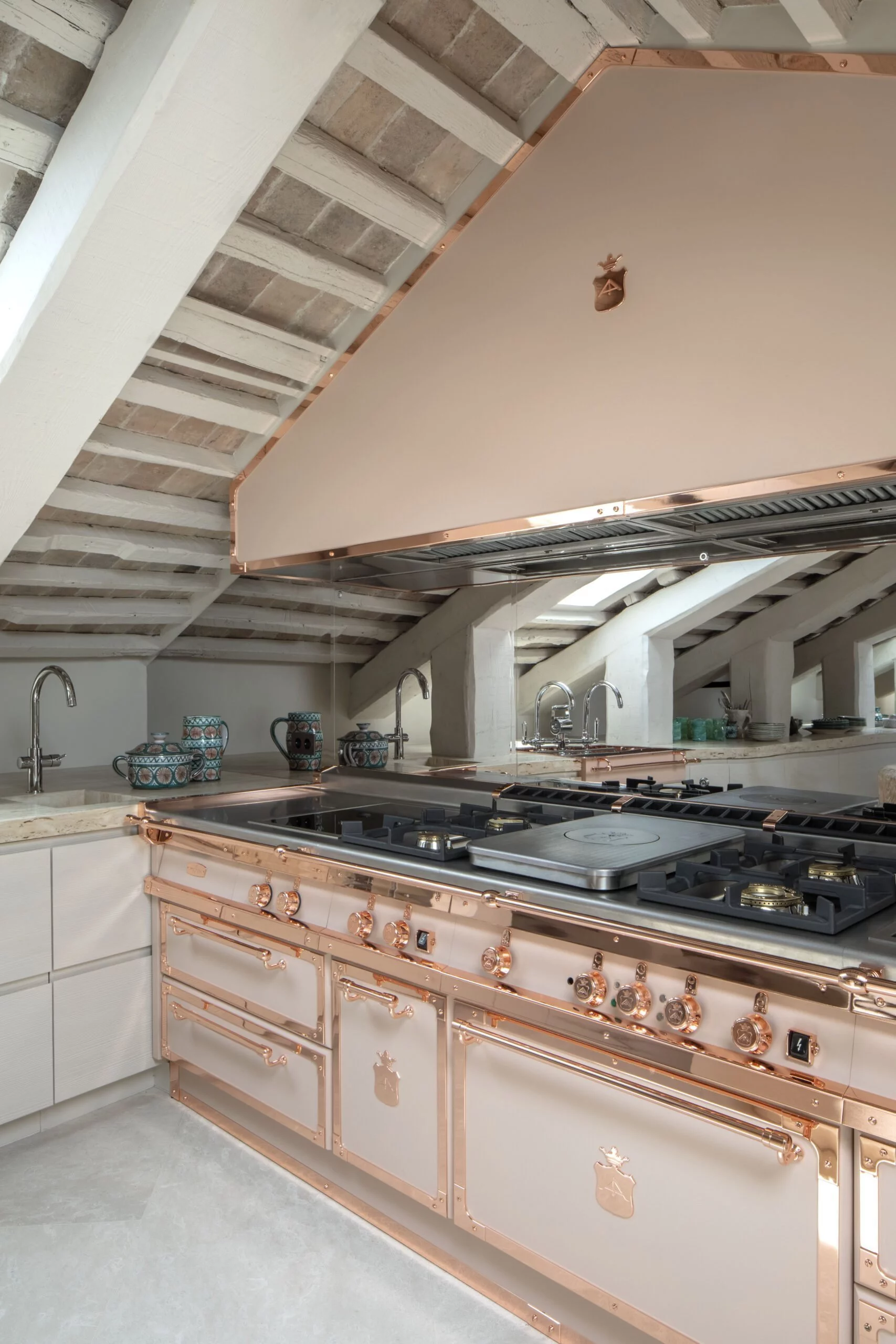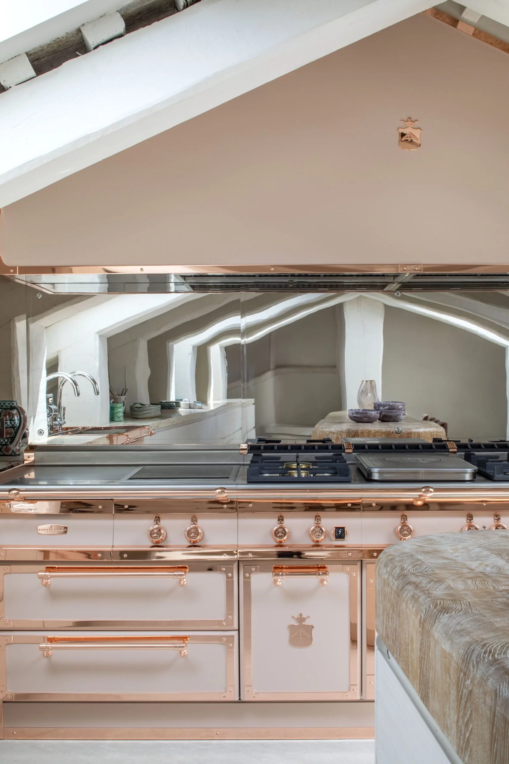 Тёплый оттенок Pantone “Cream Tan” в сочетании с сиянием меди создаёт атмосферу уюта и роскоши, делая кухню не просто местом для приготовления еды, а настоящим центром притяжения дома.