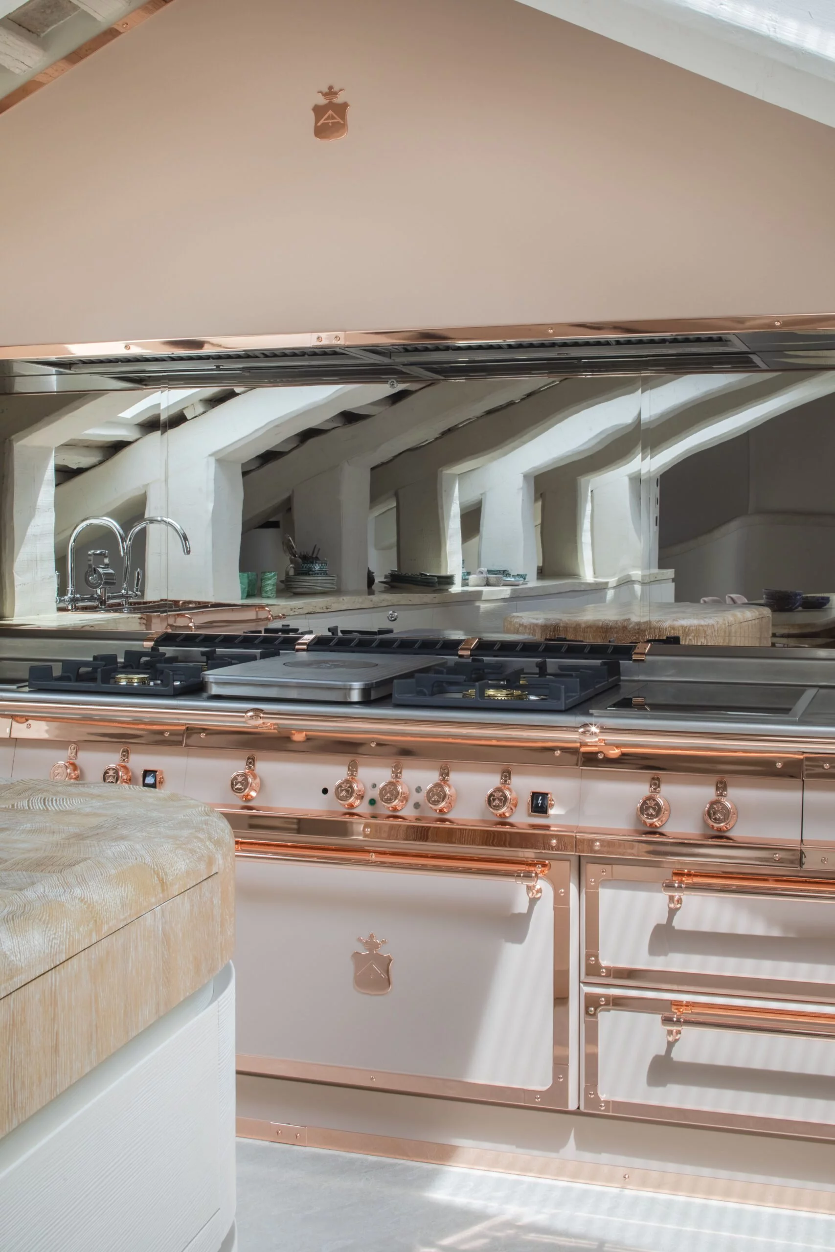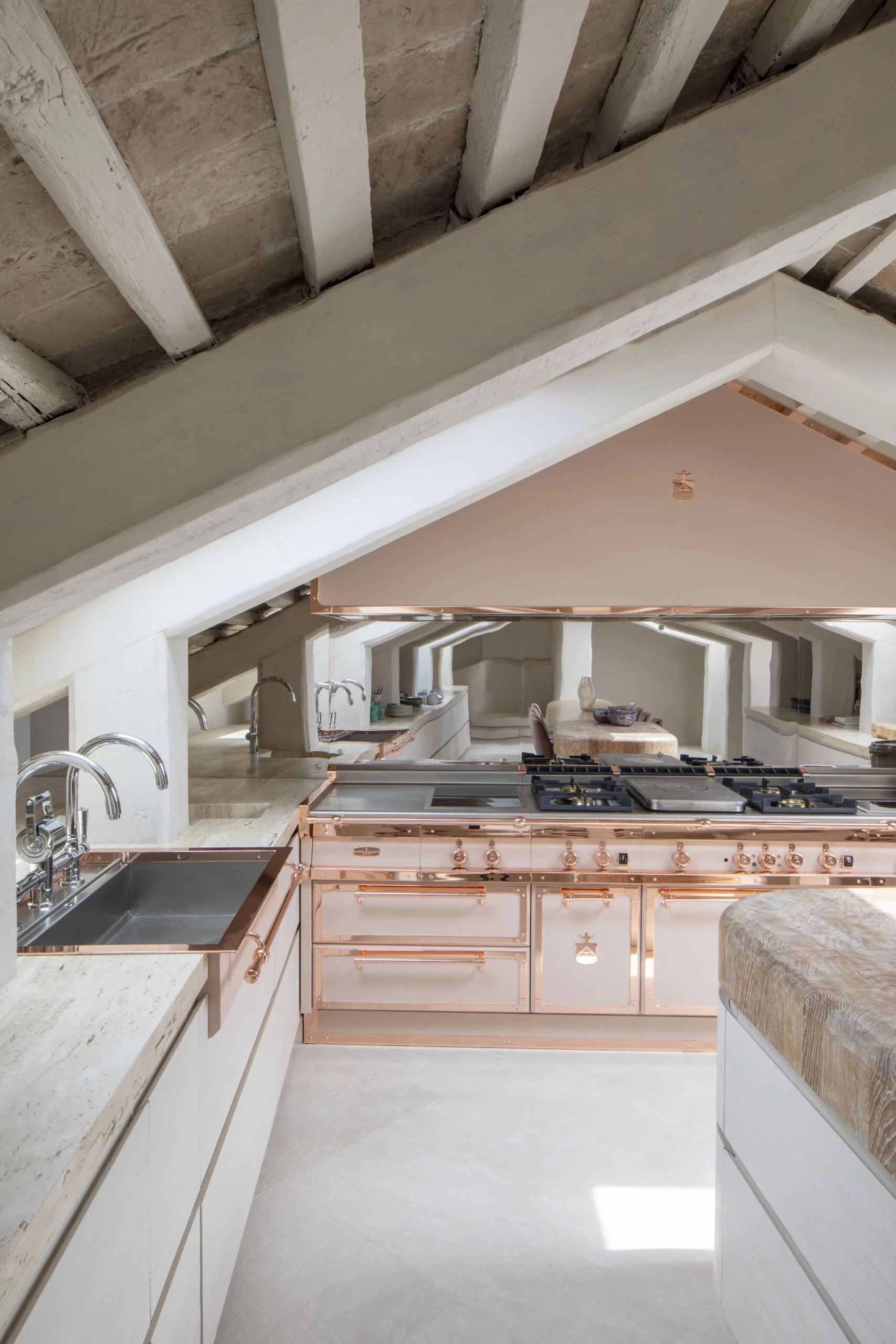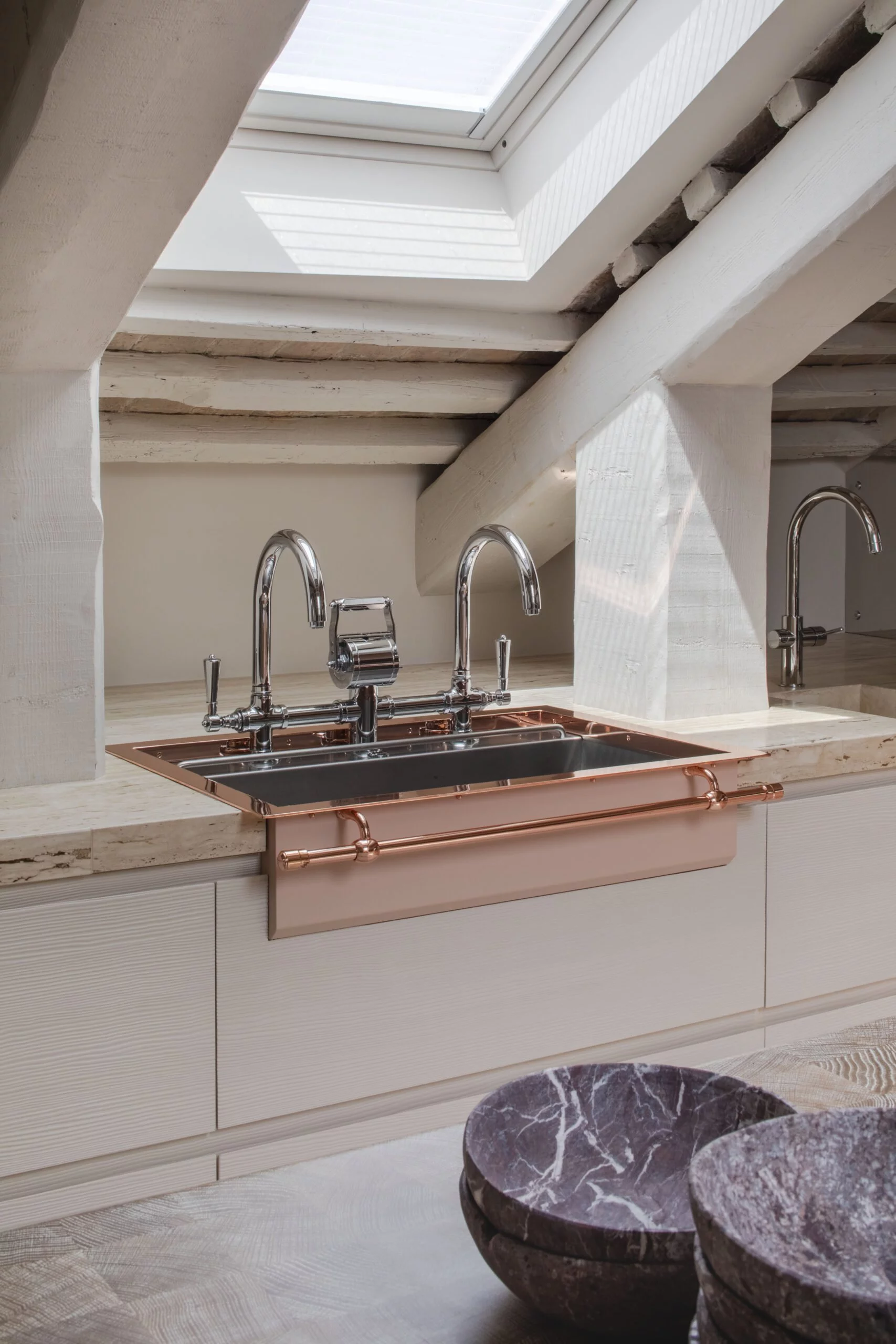 Зона мойки не уступает по стилю — полувстраиваемая раковина с элегантной стальной ступенью, смесителем с двойным режимом и деталями из полированного меди придаёт интерьеру особый шарм. Индивидуально изготовленная вытяжка органично вписывается в архитектуру помещения, подчеркивая его уникальность.