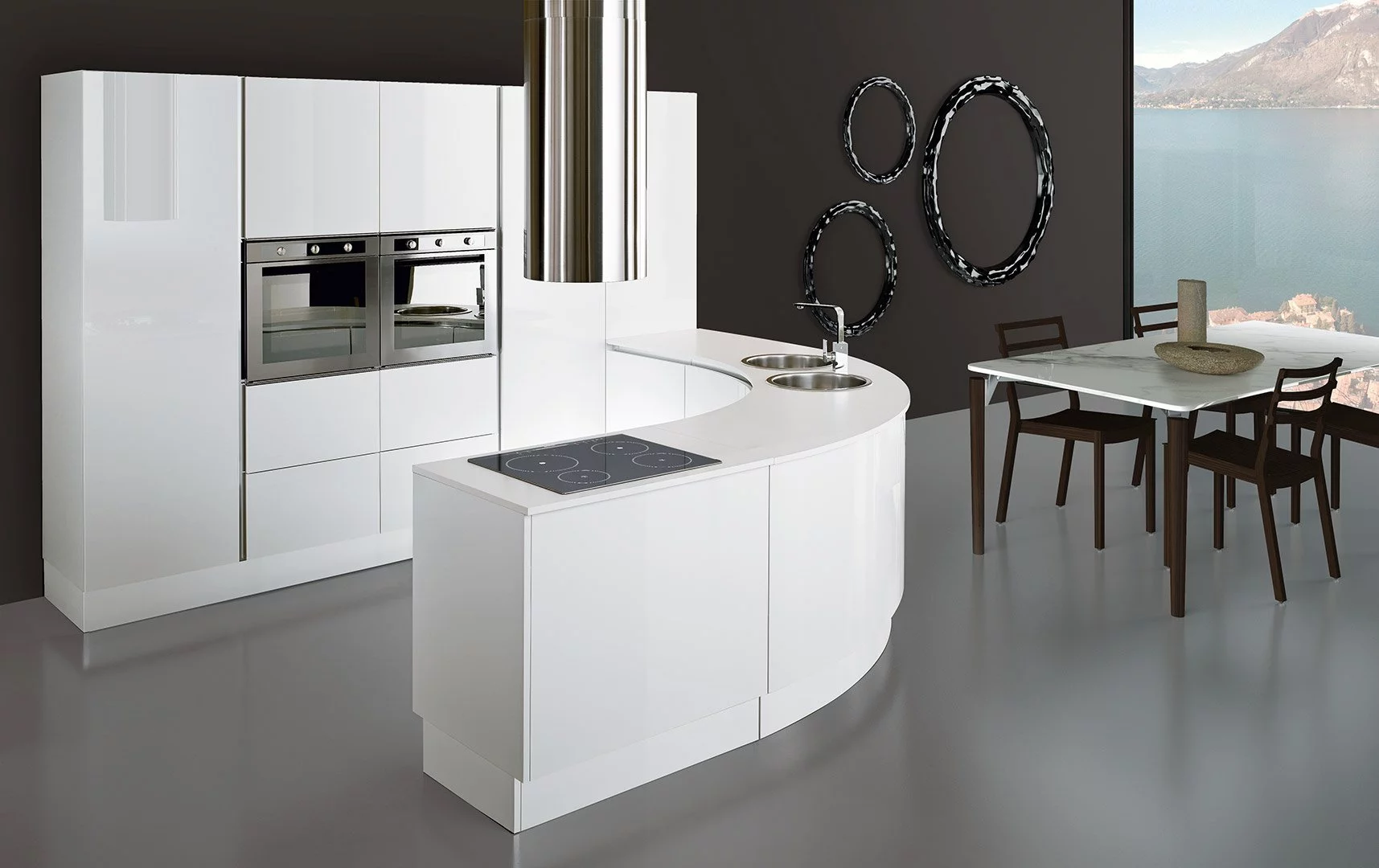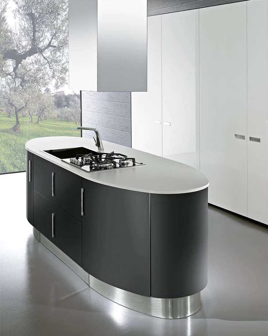 Модель доступна в двух дизайнерских вариантах: в виде самостоятельного острова с высокими шкафами и полукруглого элемента рабочей зоны, соединяющегося с одной стороны с настенным модулем.