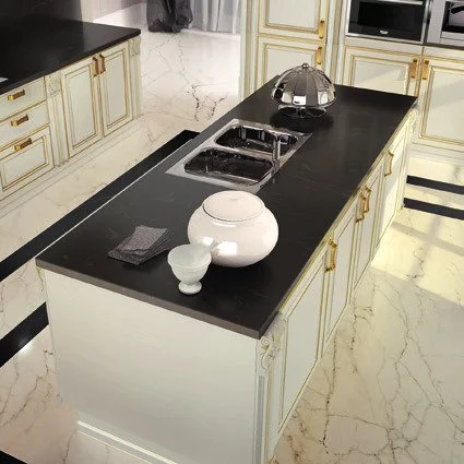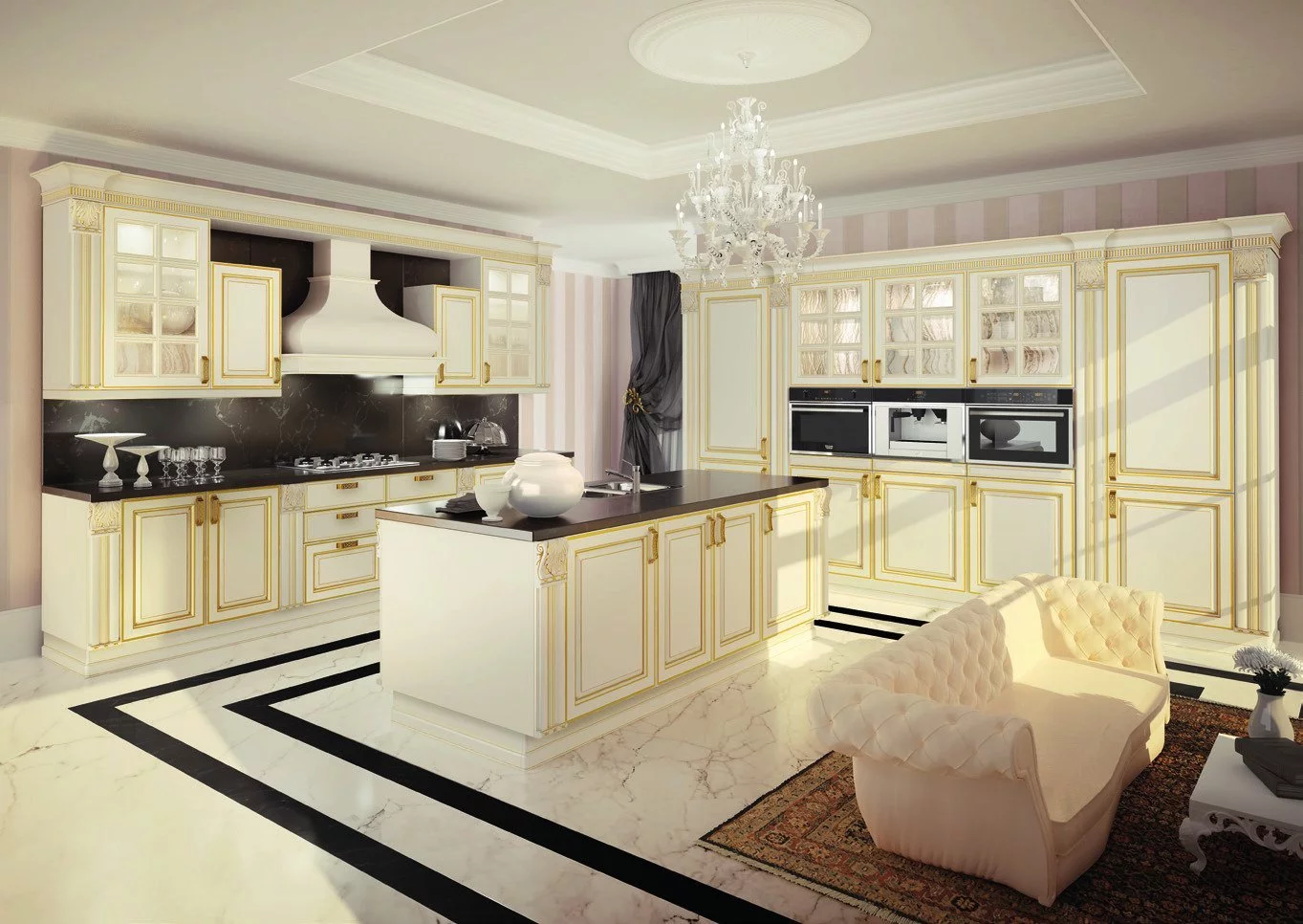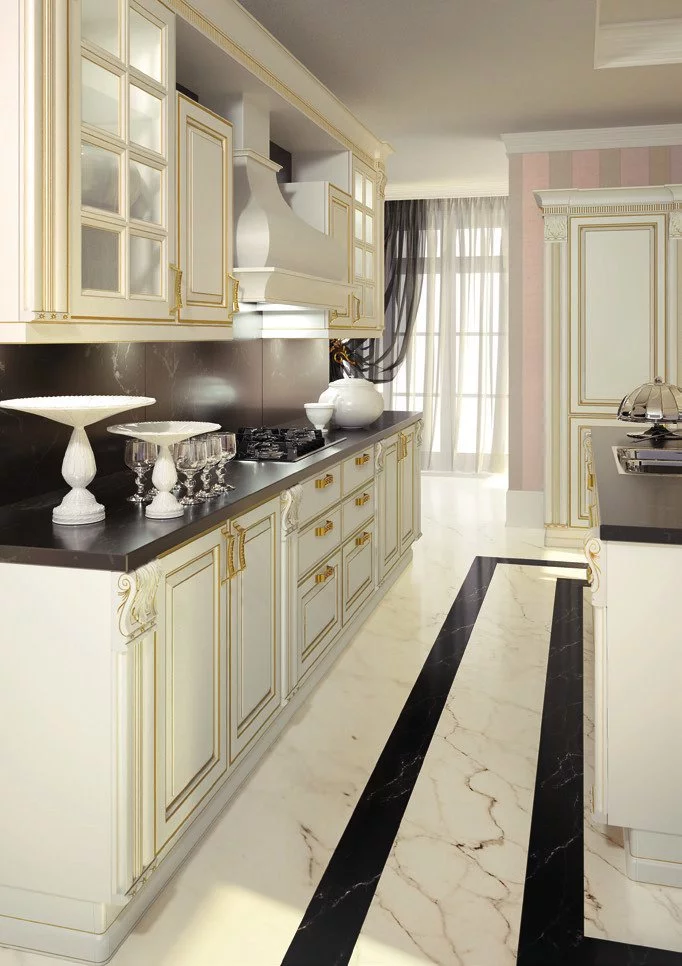 Одной из торжественных и праздничных моделей из линейки Michelangelo итальянской фабрики Oikos можно назвать кухню в оттенке «слоновая кость», которая контрастирует с тёмным цветом рабочей области. Это изделие отличается богатым декорированием золотой фольгой передних фасадов, а также фриза и пилястр. Кроме этого, используемая фурнитура также выполнена в золотом цветовом решении.