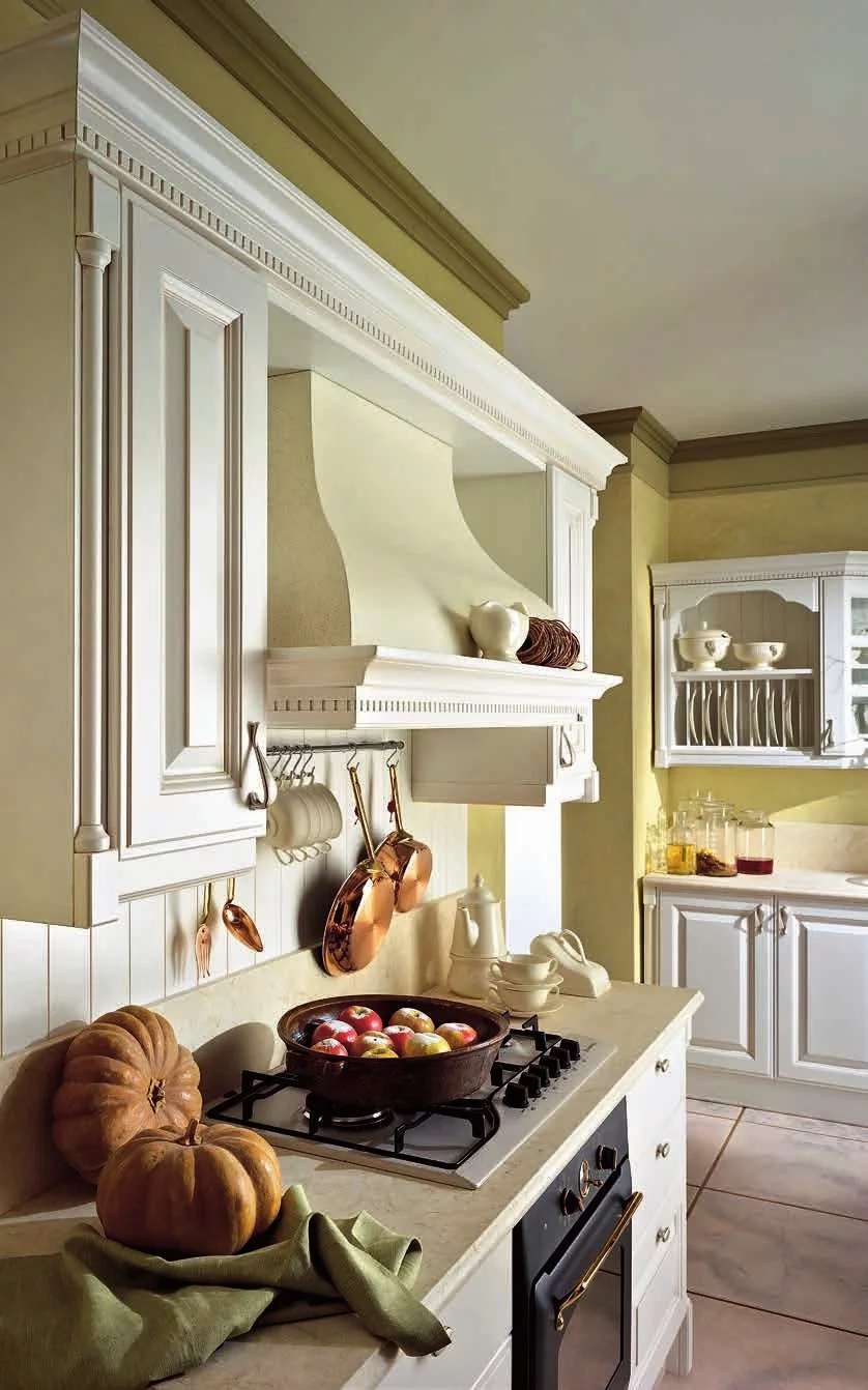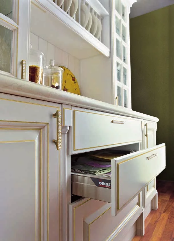 Кухня Rafaello от известного производителя Oikos представлена в классическом стиле в белом цветовом решении. Фронты модели выполнены в рамочном дизайне и украшены золотой патиной. Верхняя часть подвесных шкафчиков и системы хранения декорированы узорным карнизом. Множество выдвижных ящиков предлагают индивидуальное место для каждого кухонного аксессуара.