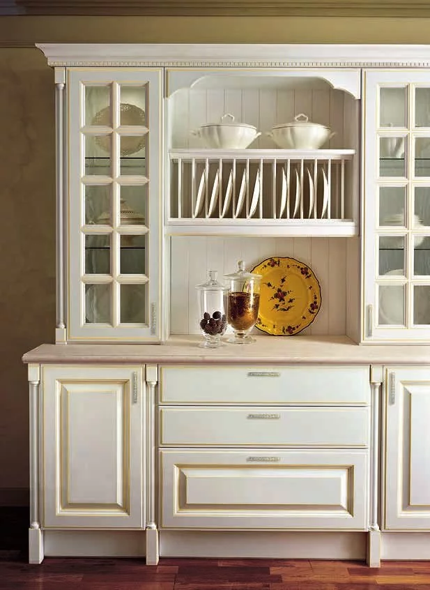 Кухня Rafaello выполнена из натурального дерева с использованием качественного МДФ, а также прочного стекла для фронтов витрины и нержавеющей стали — для фурнитуры. Декоративные пилястры и полки, сушки для посуды открытого и скрытого вида, а также многочисленные элементы системы хранения делают изделие не только эстетичным, но функциональным.