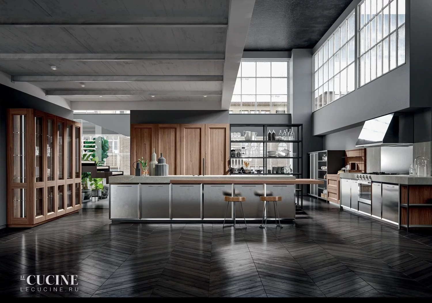 Сочетание шпона черного грецкого ореха и нержавеющей стали делает двери модели Yuma неповторимыми. Рабочая поверхность из пьетра-пьязентина не только красива, но и практична. Панельная стена вокруг вытяжки добавляет кухне шик и изысканность. Открытые полки с алюминиевыми структурами и отделкой "графит" не только увеличивают объем хранения базовых и настенных шкафов, но и отлично сочетаются с деревом и сталью, используемыми в конструкции.
