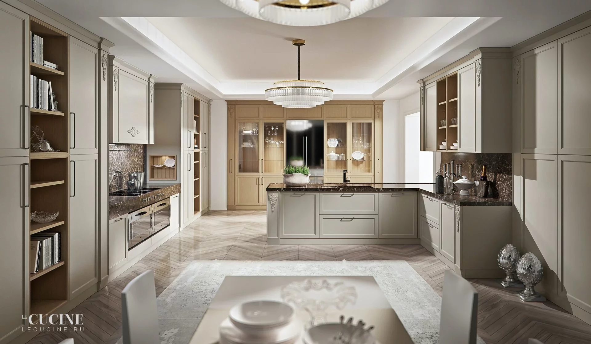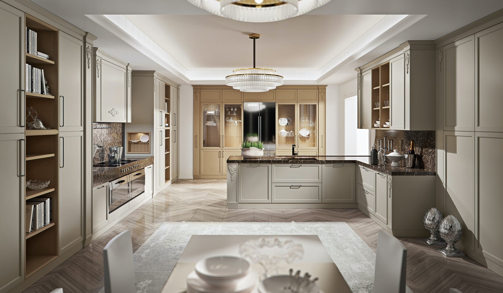 Отделка выполнена вручную, что делает каждую кухню Maya уникальной и неповторимой. Умелое использование мраморной рабочей поверхности Emperador Brown - одно из преимуществ этой кухни. Примером может служить панельная стена вокруг вытяжки, что является признаком изысканности.