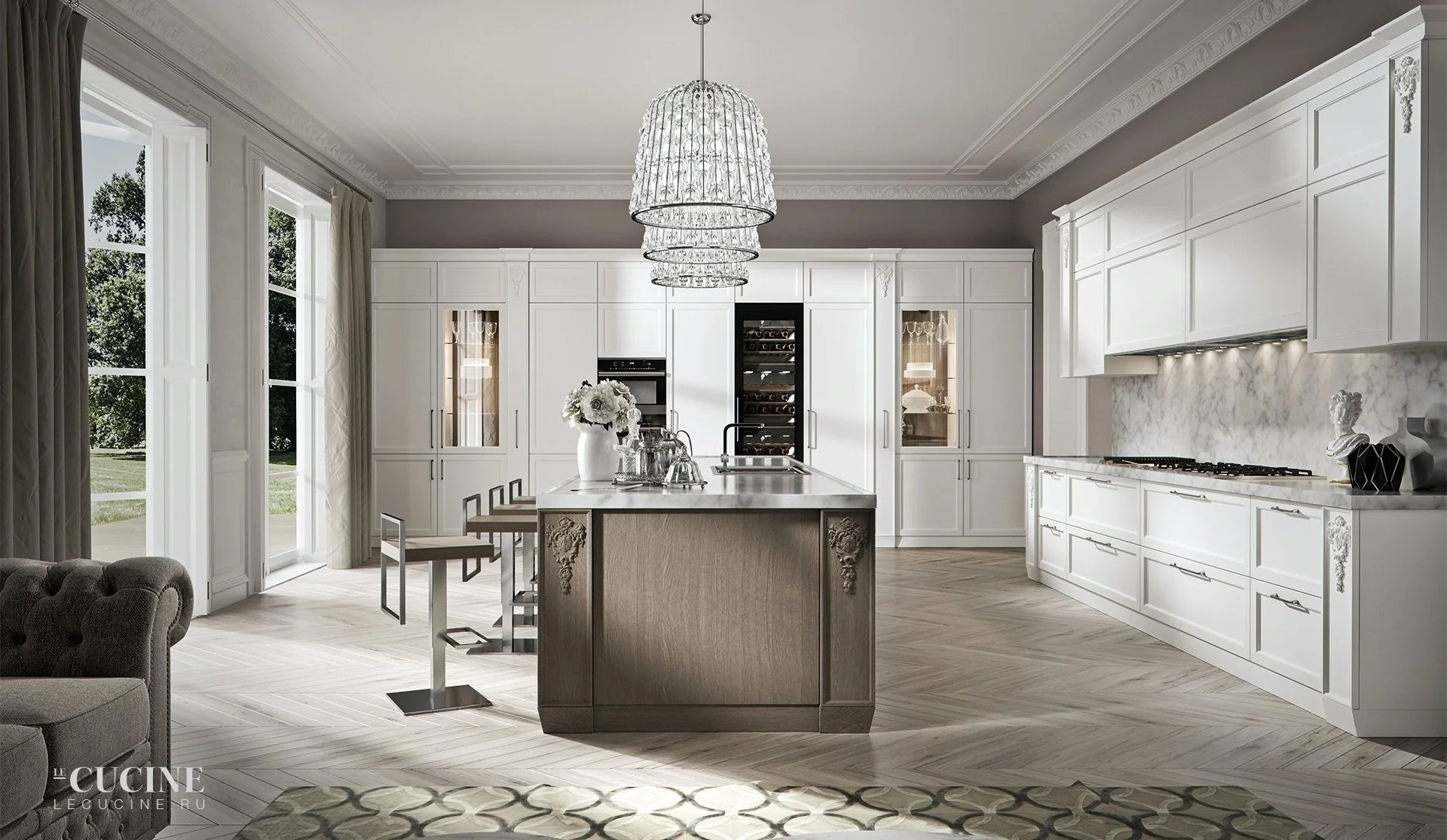 Особенностью кухни Maya является элегантность ее рамочной двери в сочетании с цветочным рисунком рельефной отделки, полностью выполненной вручную. Эта особенность превращает каждую кухню в эксклюзивную и уникальную модель. Отделки: белый лакированный дуб с открытыми порами/грязный дуб. Рабочая поверхность: мрамор Каррара. Молдинги и рамки вокруг открытых фасадов имеют разную глубину, что создает приятные декоративные акценты.