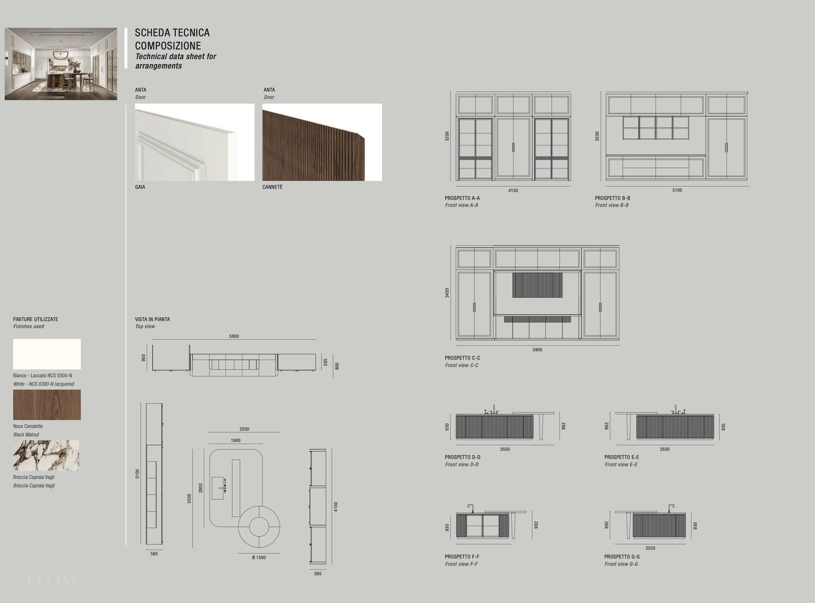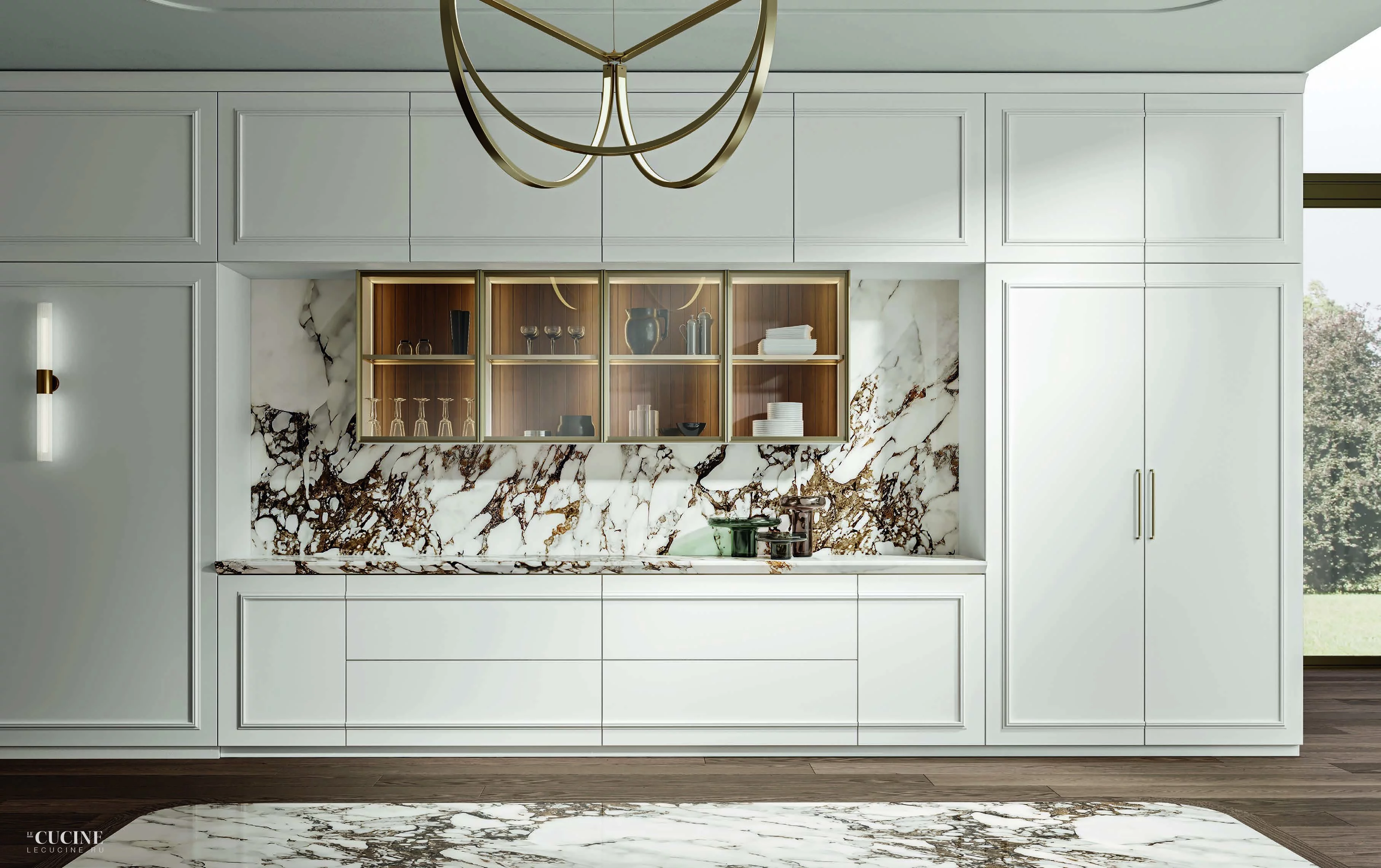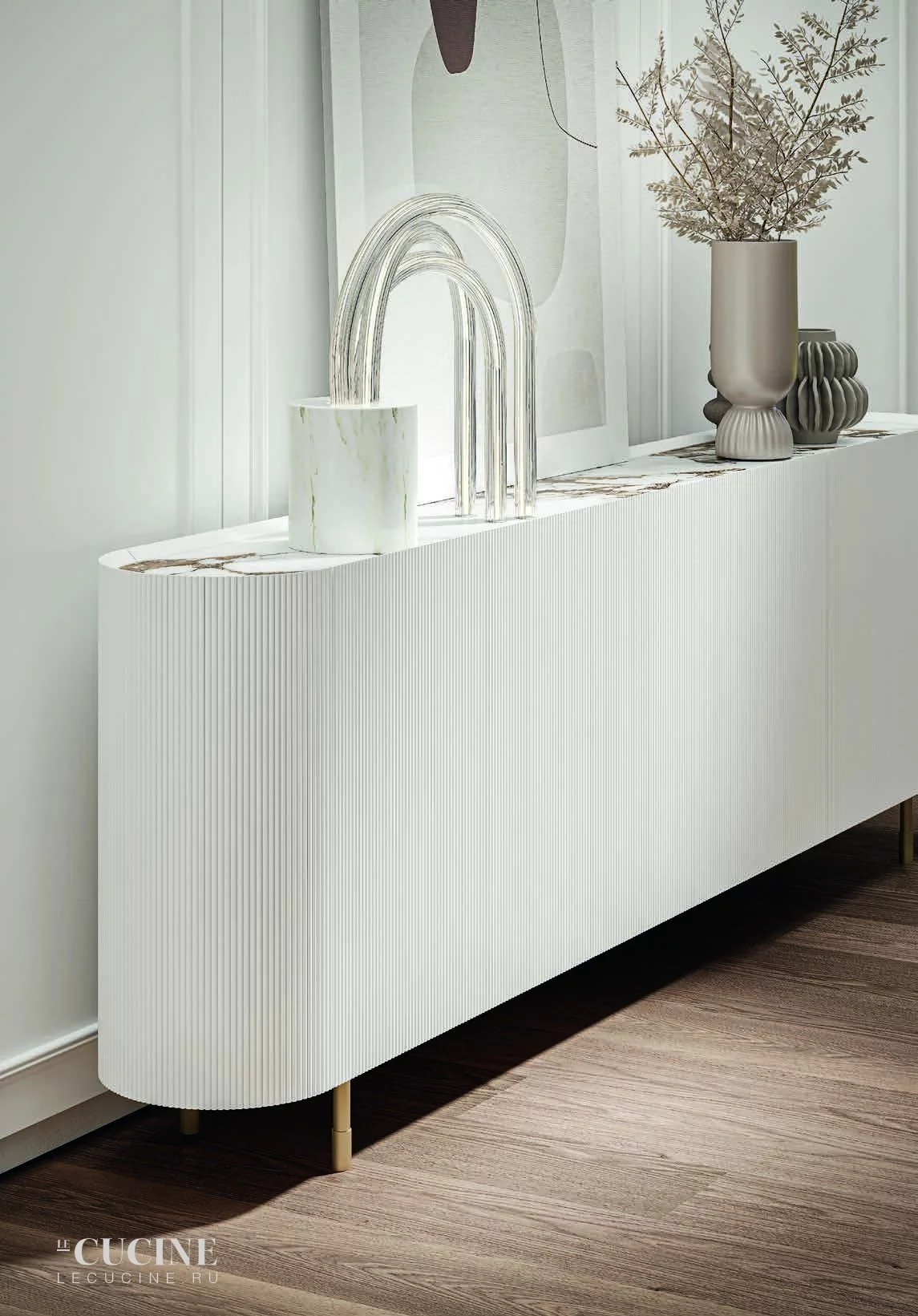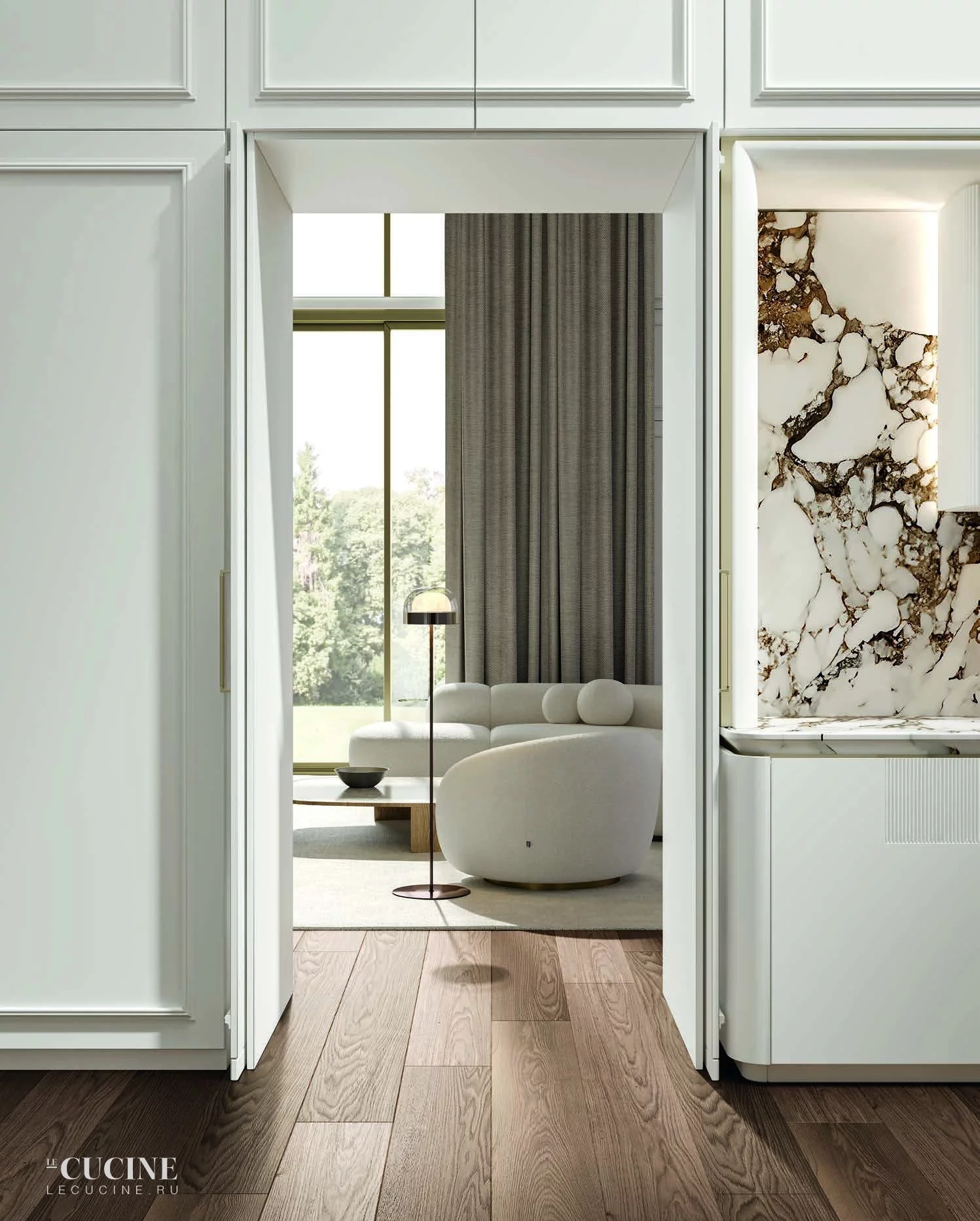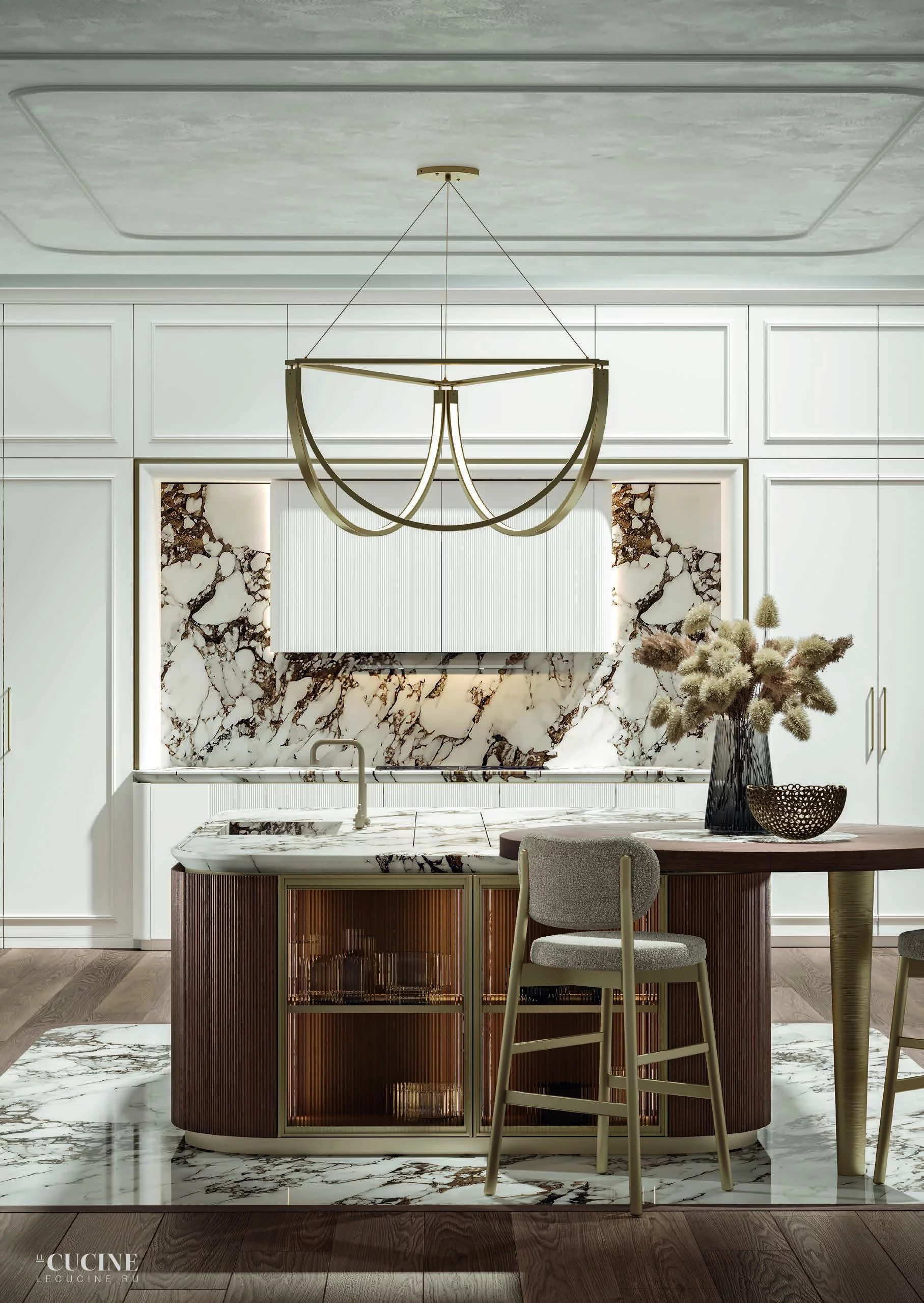 Radha - новая кухня от Old Line (Италия) воплощающая в себе элегантность и роскошь в каждой детали. Белые фасады, окруженные изысканными рамами, созданными с использованием эксклюзивных дверей Gaia, создают захватывающий эффект буазери, превращая поверхности в монолитные панели. На центральном острове используются фасады с эффектом Canneté из ореха Каналетто и столешницей из мрамора Breccia Capraia Vagli с капельной канавкой. Внутри столешницы скрытый подъемный элемент, он служит как перегородка и при необходимости место для хранения. Колонны в этой роскошной кухне плавно вписываются в роскошную атмосферу пространства, элегантно следуя мотиву буазери. Эта консистентность дизайна придает непрерывность и изысканность окружающим стенам, значительно улучшая общую красоту окружающей среды. Мраморный стол, удобные стулья и сервант с деталями Canneté гармонично завершают кухонное пространство. Визуальная и эстетическая последовательность подчеркивает гармонию и элегантность всего ансамбля.