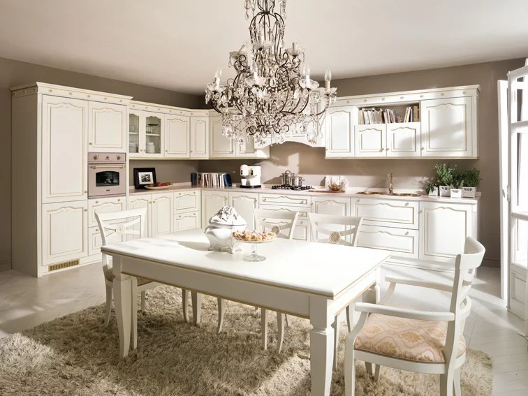 Богатый вид имеет кухня Aurora, выполненная в классическом стиле, от итальянского производителя Onlywood. Модель выполнена полностью из дерева и со сложным декором филёнки фасадов. Привлекает взгляды декоративный карниз с розетонами, декором в виде цветов, идущих в углах вытяжки. Закалённые стекла шкафов имеют несколько вариантов дизайна.