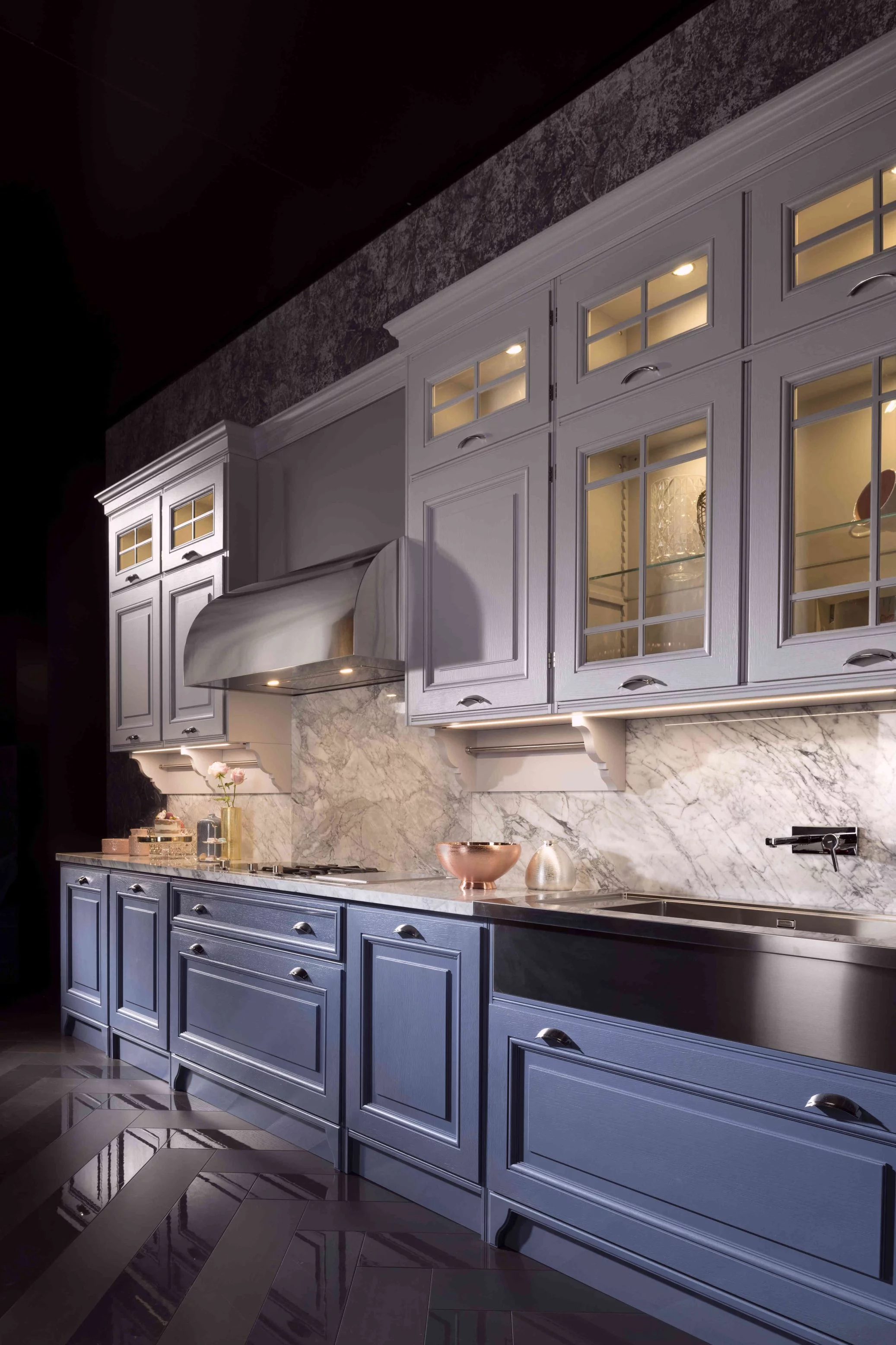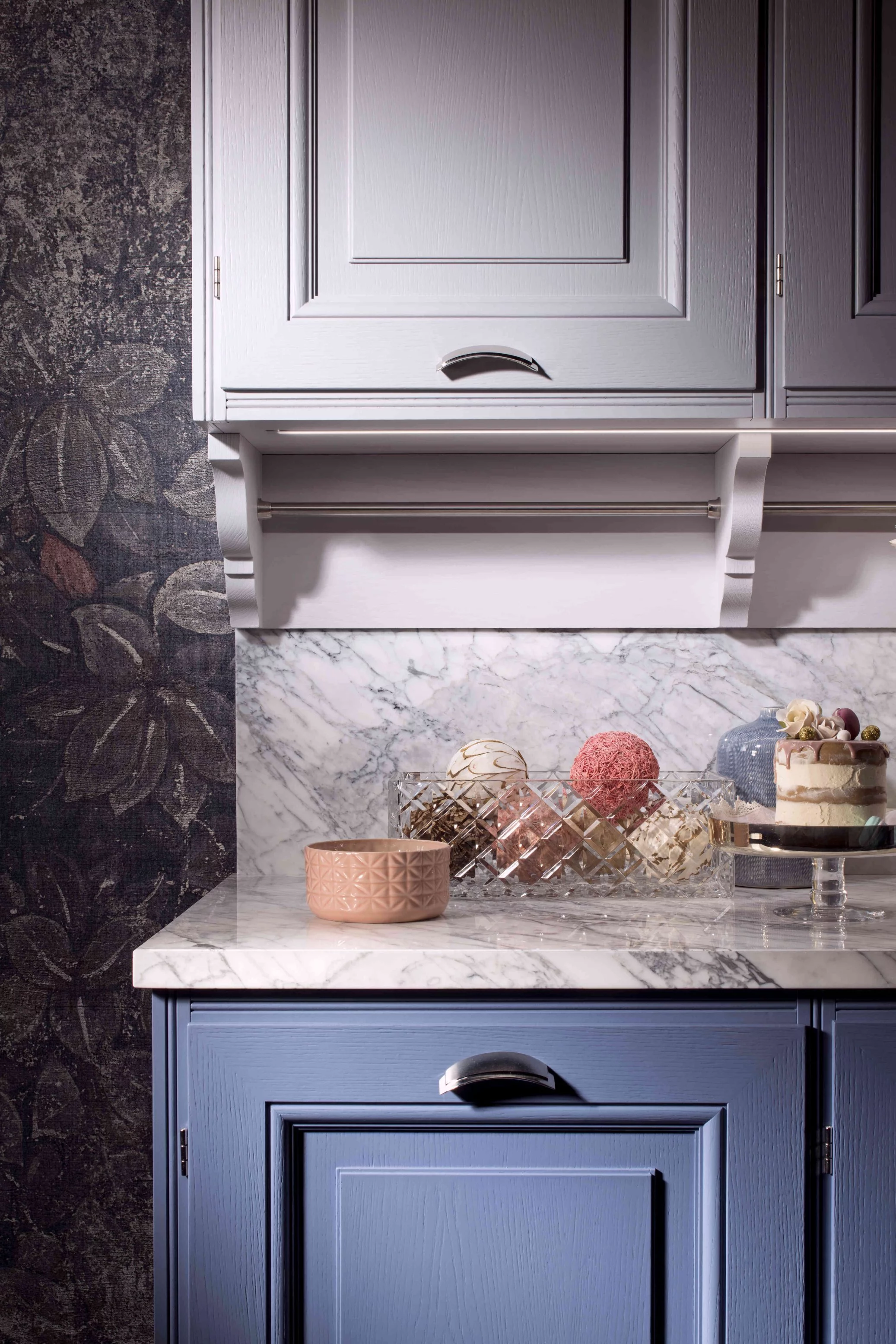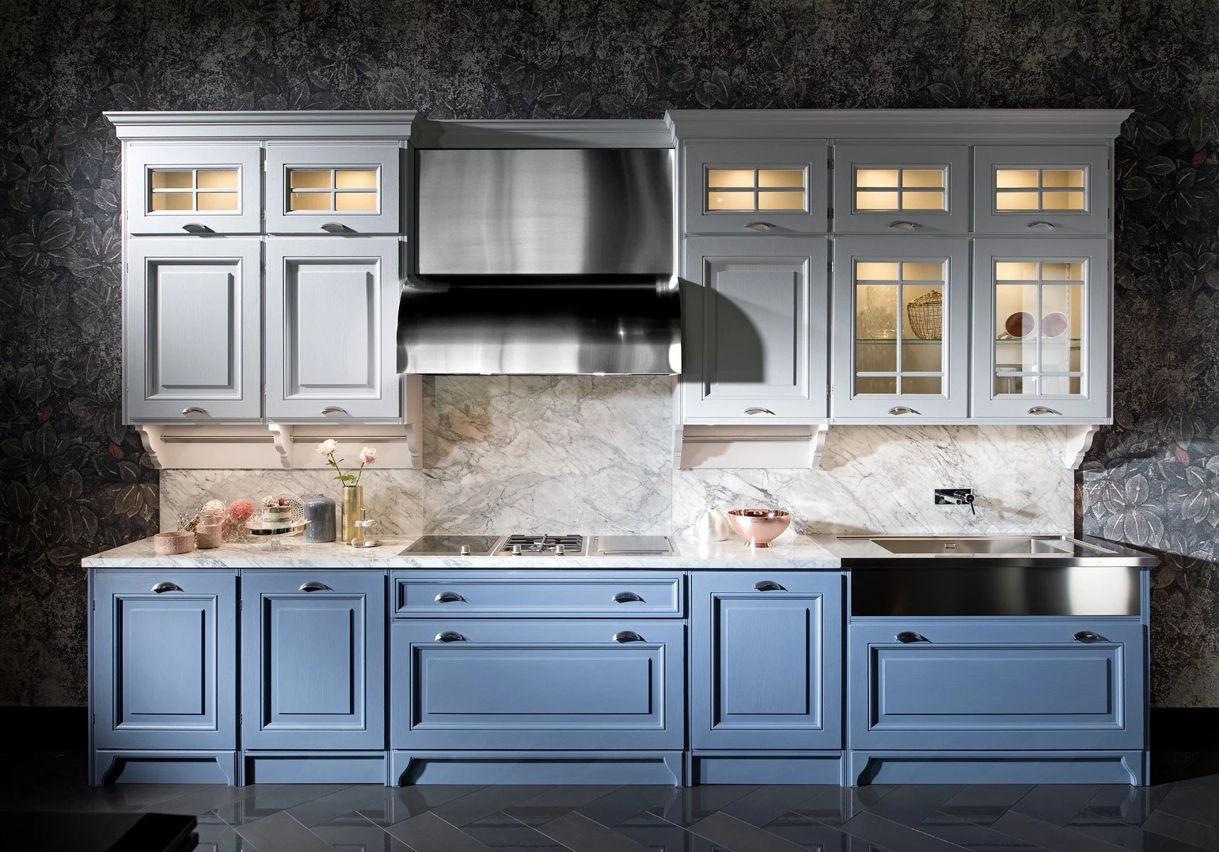 Изысканная классическая кухня Boston от итальянской фабрики Prestige обязательно придётся по вкусу романтическим натурам. Модель выполнена в нежном пастельном голубом и белом цвете. Изделие преимущественно изготовлено из натурального дерева, надёжного МДФ и закаленного стекла. Мойка и вытяжка представлены в металле. Столешница рабочей зоны и пристенок кухни выполнены в натуральном мраморе.